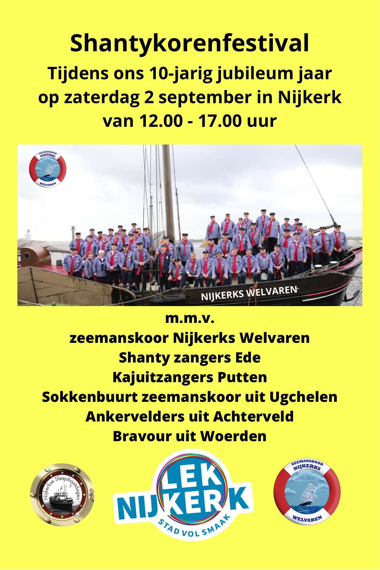 Op zaterdag 2 september organiseert het zeemanskoor Nijkerks Welvaren een shantyfestival. Dit gebeurt op 3 verschillende podia in Nijkerk Er zullen 6 zeemanskoren voor u optreden! De opening is om 12.00 u. op het havenplein en hier wordt medewerking verleend door het blaasorkest van NSFC.. Het einde is om 17.00 u. op het plein.