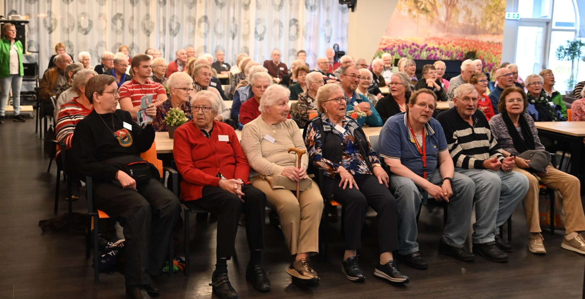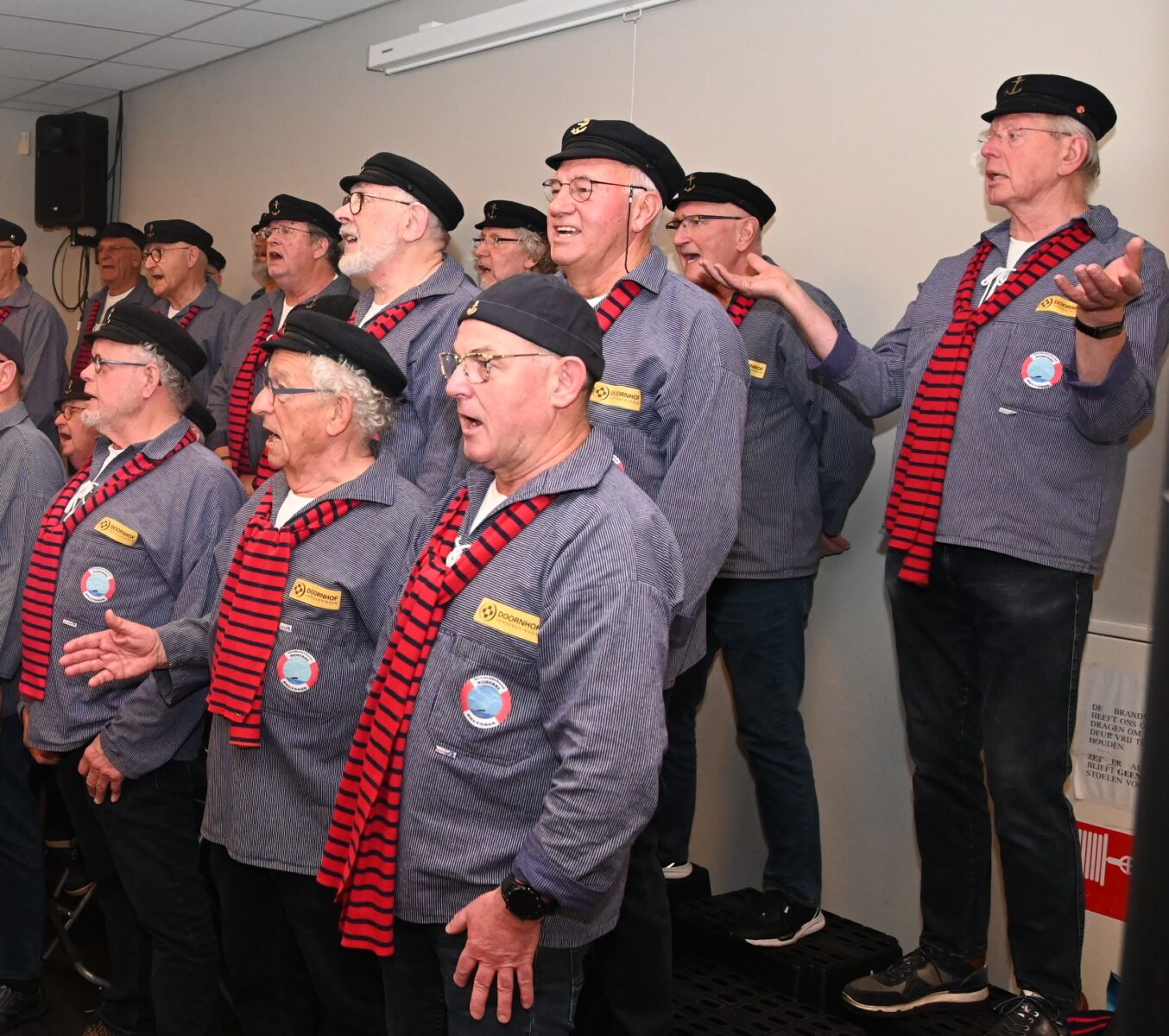 Er was woensdag 25 oktober bijna geen plekje meer over in het gebouw van de Unie van Vrijwilligers (UVV) in Nijkerk toen het zeemanskoor Nijkerks Welvaren langs kwam voor een optreden. Het zeemanskoor zong in verband met haar tienjarige bestaan. Daarbij worden diverse locaties, zoals verzorgingstehuizen, aangedaan. Het optreden bij de UVV was als vanouds weer erg gezellig. Foto Kees van den Heuvel