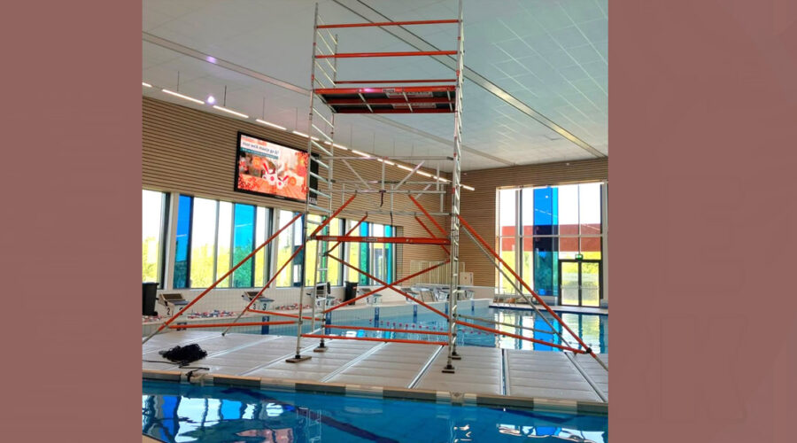 Het Jaap van der Krolbad in Nijkerk staat in de steigers. Werklieden zijn bezig met reparatiewerkzaamheden. Heel bijzonder is dat de steigers op pontons staan die op het water drijven. Maandag 18 augustus opent het zwembad weer haar deuren en kan er volop worden genoten van de faciliteiten.