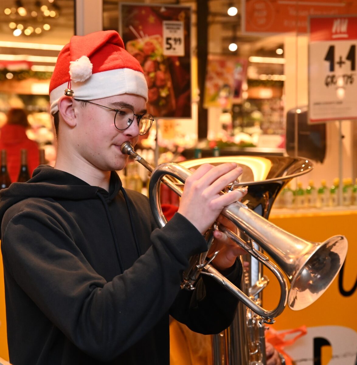 Vlak voor de ingang van supermarkt Jumbo Veltink waren vrijdagavond 19 december vrolijke deuntjes te horen van het Nijkerks Stedelijk Fanfare Corps (NSFC). Het weerspiegelde de kerstsfeer tijdens Candelight Shopping in het centrum van Nijkerk. Waar elders gezellig kon worden geshopt, daar kon tijdens het boodschappen doen worden genoten van de vrolijke liedjes van dit muziekgezelschap, geheel gekleed in kerstkledij. foto Kees van den Heuvel