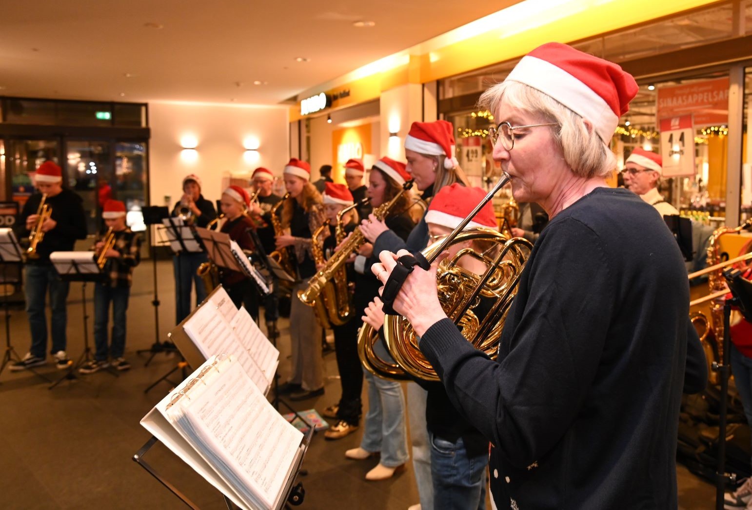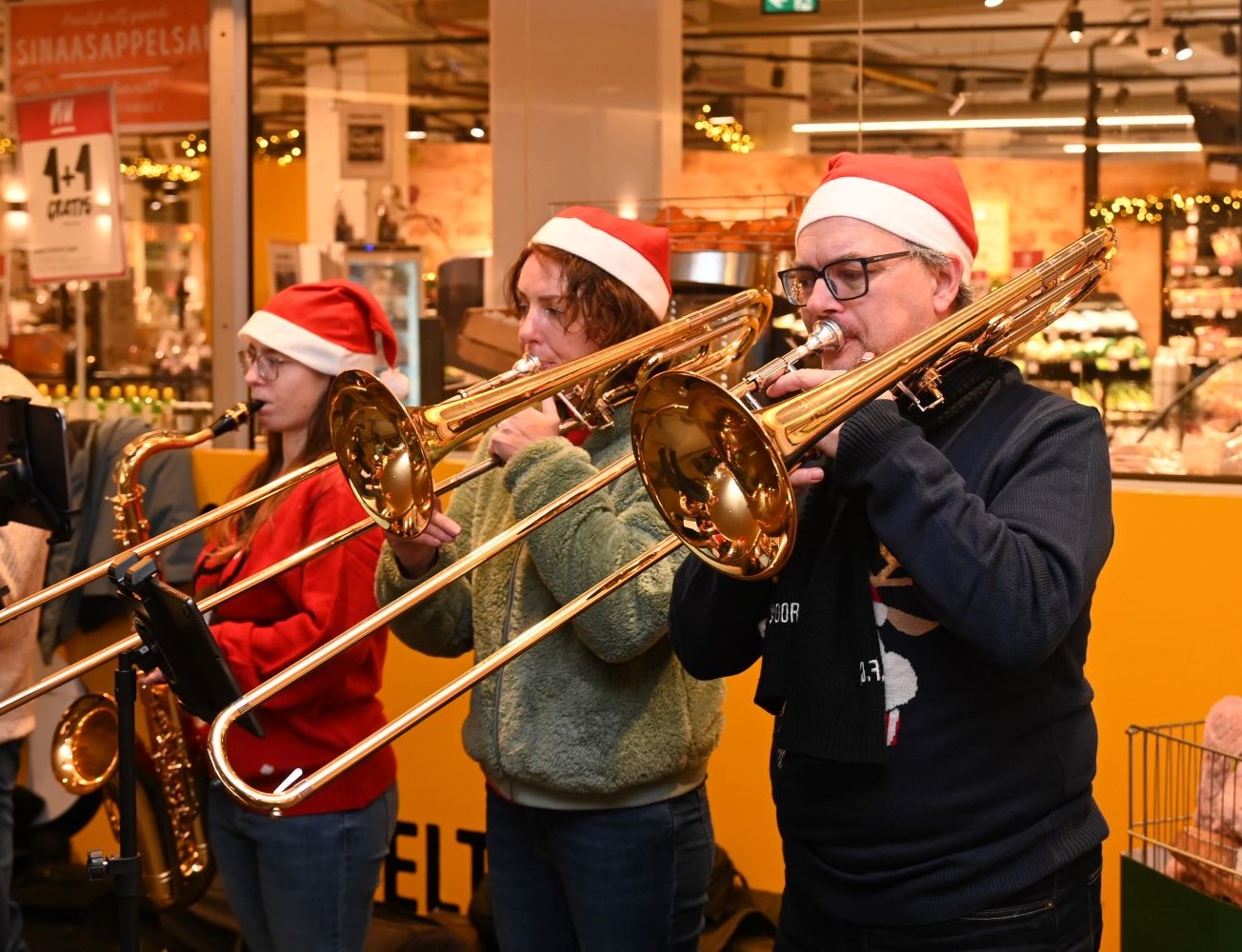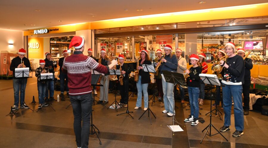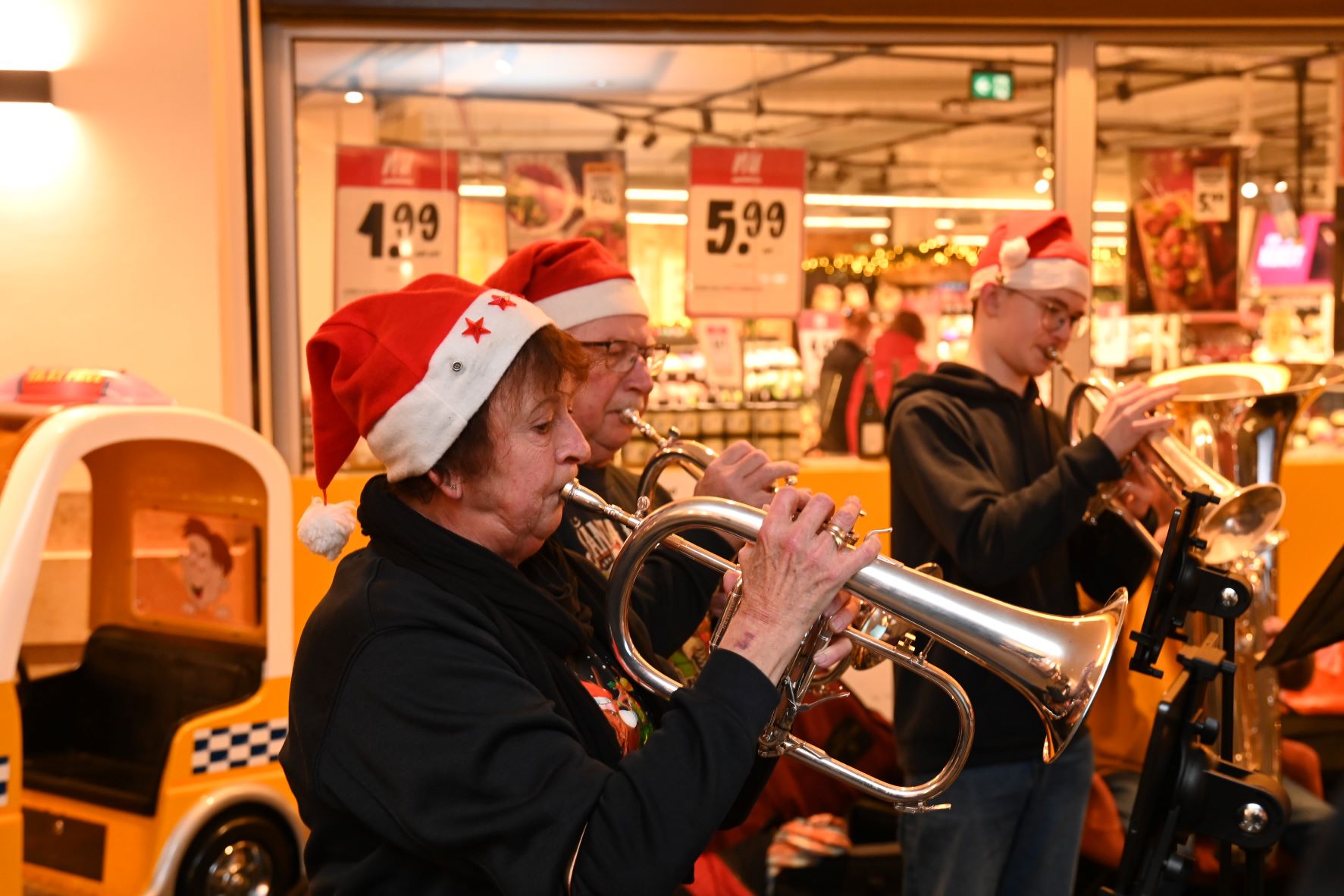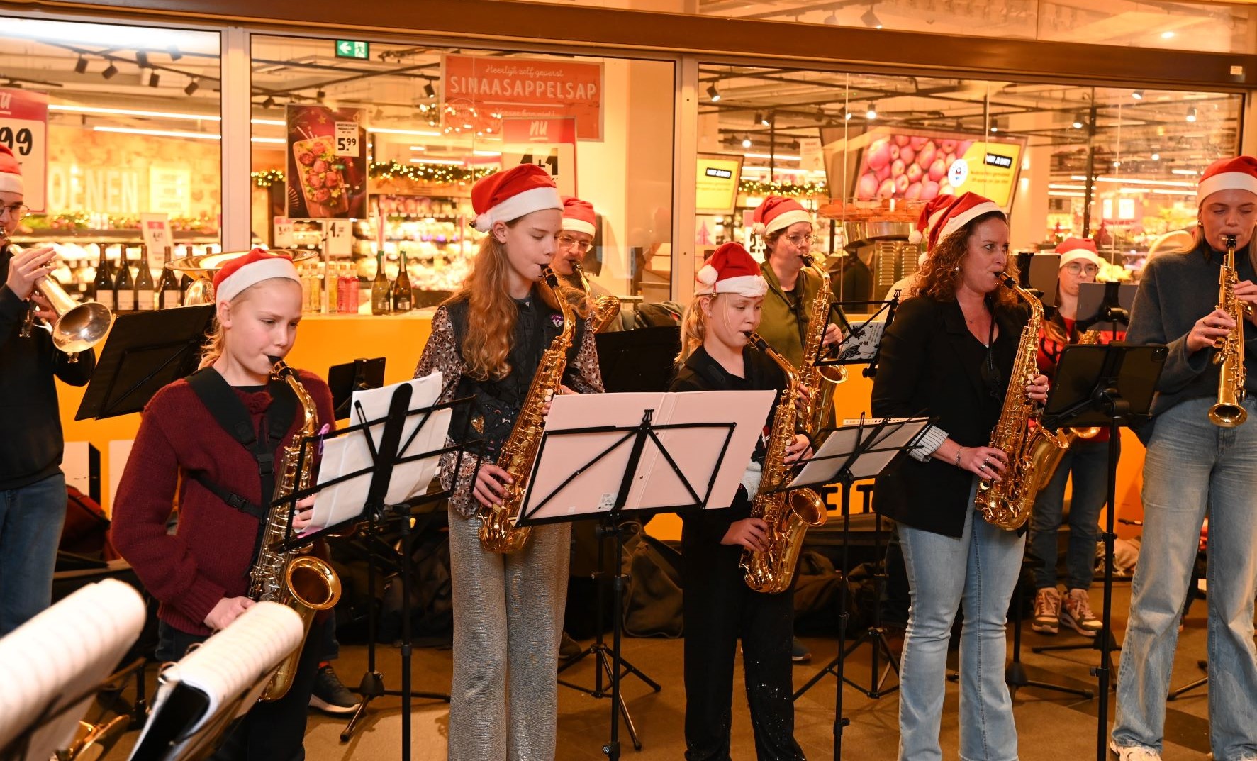 Vlak voor de ingang van supermarkt Jumbo Veltink waren vrijdagavond 19 december vrolijke deuntjes te horen van het Nijkerks Stedelijk Fanfare Corps (NSFC). Het weerspiegelde de kerstsfeer tijdens Candelight Shopping in het centrum van Nijkerk. Waar elders gezellig kon worden geshopt, daar kon tijdens het boodschappen doen worden genoten van de vrolijke liedjes van dit muziekgezelschap, geheel gekleed in kerstkledij. foto Kees van den Heuvel