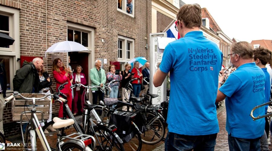 Bij haar afscheid als conservator van Museum Nijkerk is Saskia van den Berg verrast met een serenade van het Nijkerks Stedelijk Fanfare Corps (NSFC). Samen met opvolger Edith de Jong stond ze te dansen op de muzikale hulde. Eerder was ze al onderscheiden met de Erepenning in Zilver van de gemeente Nijkerk en uit handen van Baron Schimmelpenninck van der Oije ontving zij de Toon Martens van Sevenhoven penning. Foto Matthias van Bloemendaal / Raak Media
