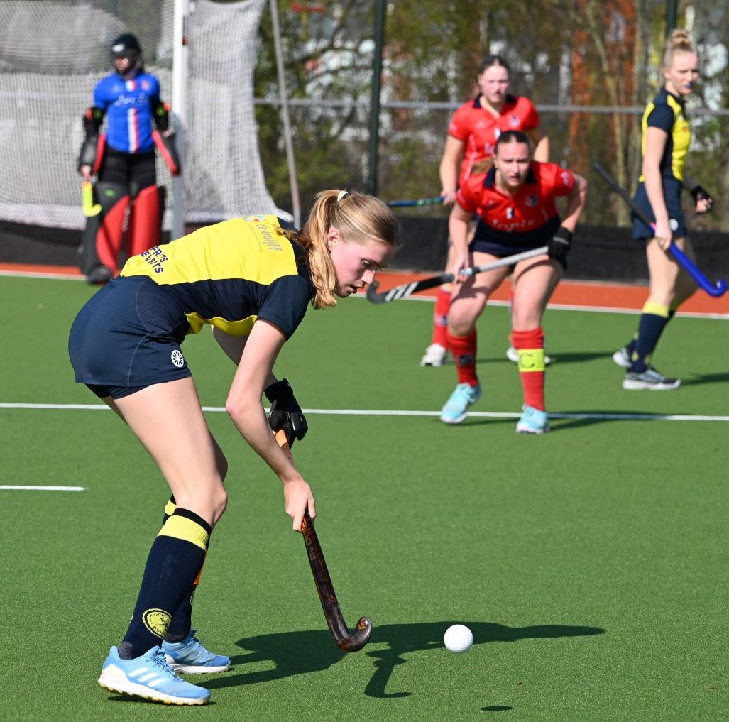 De dames van Hockeyclub Nijkerk onder 25 hebben hun eerste wedstrijd op het nieuwe hoofdveld op hun naam gezet. Onder een warm lentezonnetje werd met 2-0 gewonnen van IJsseloever. Die stand stond al na een eerste helft op het scorebord. Namens de hockeydames werd gescoord door Mirthe en Emma. Foto Kees van den Heuvel
