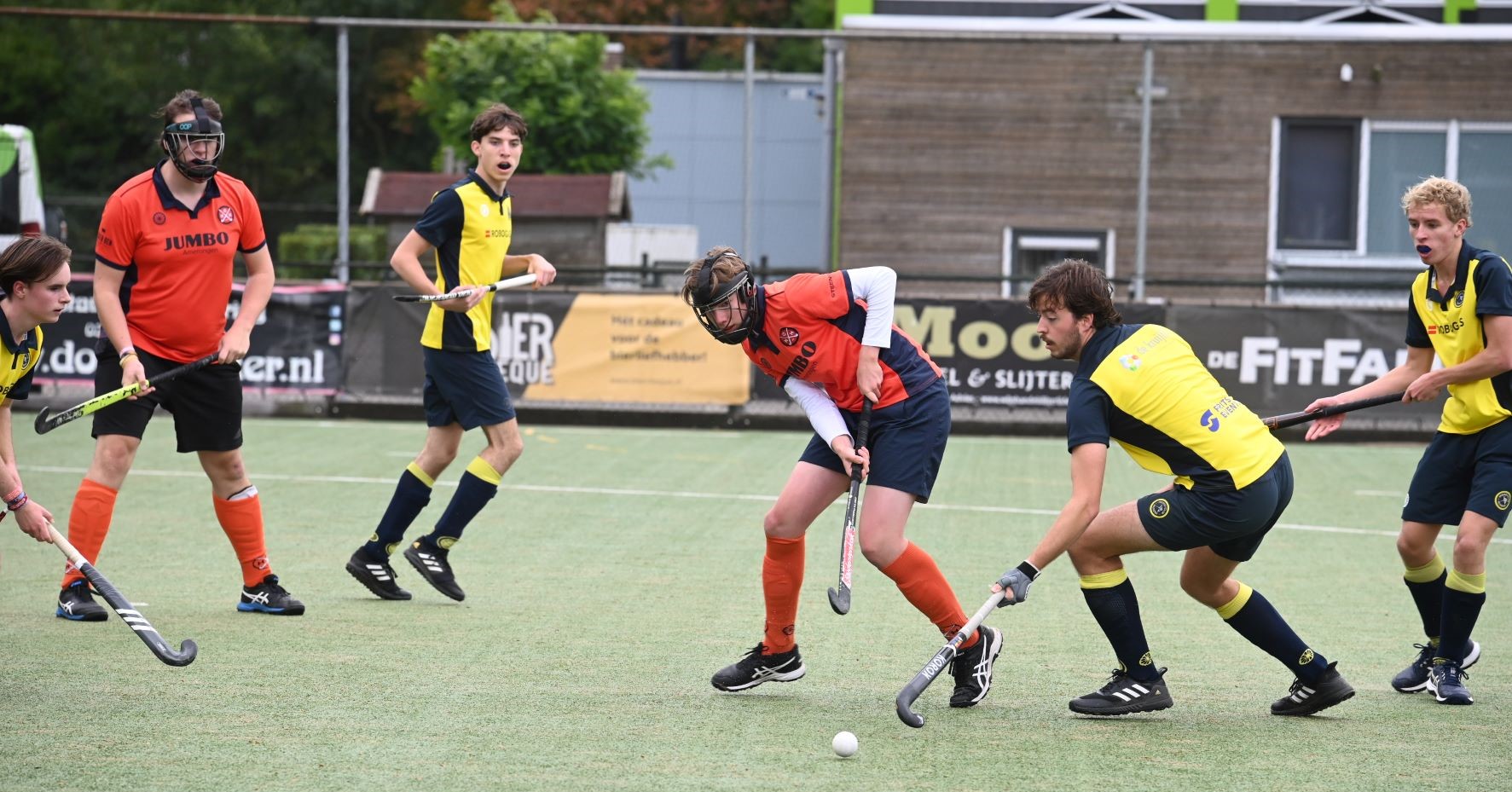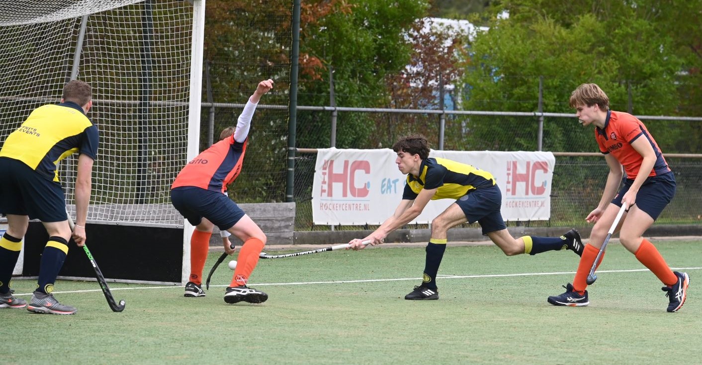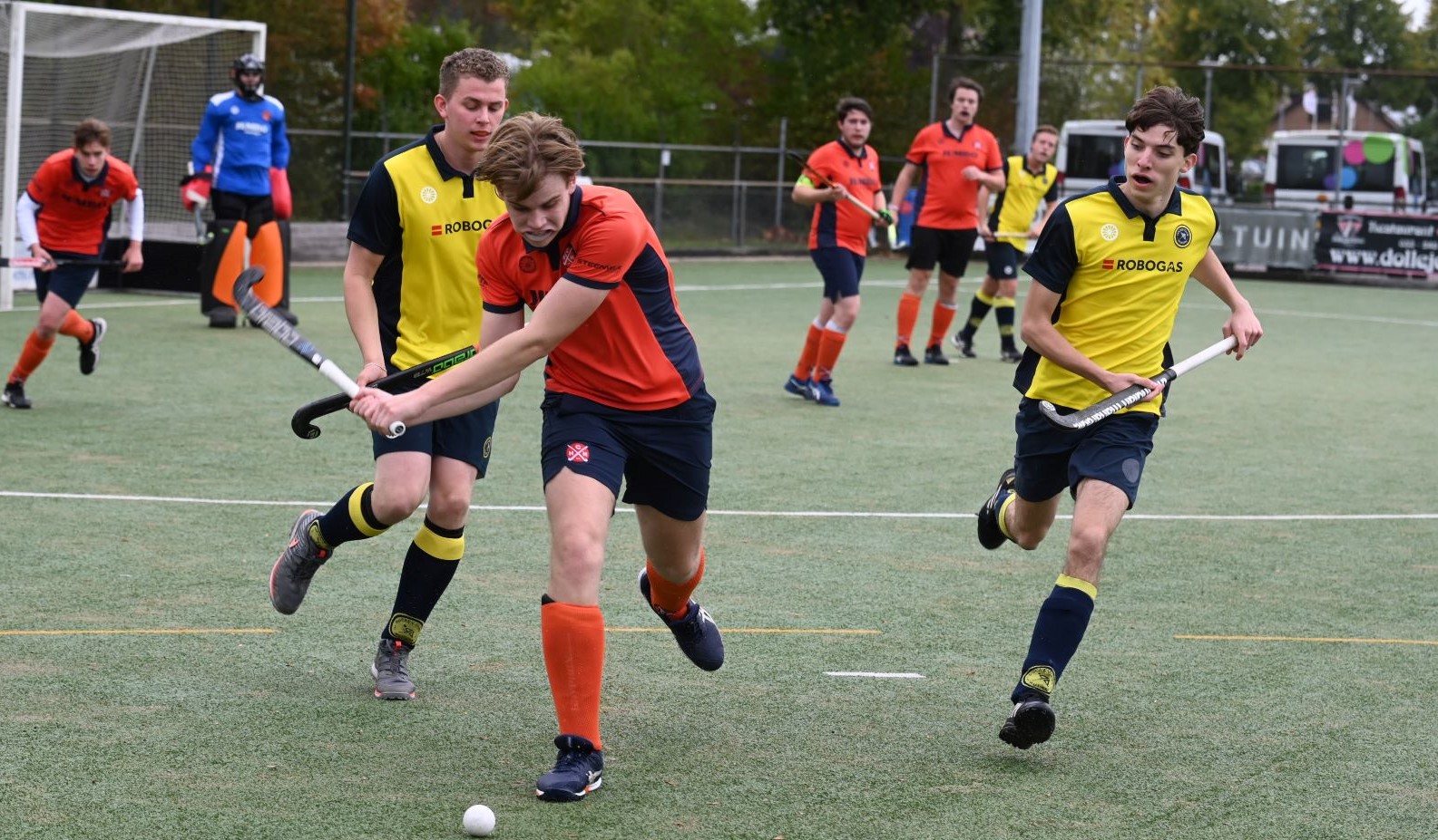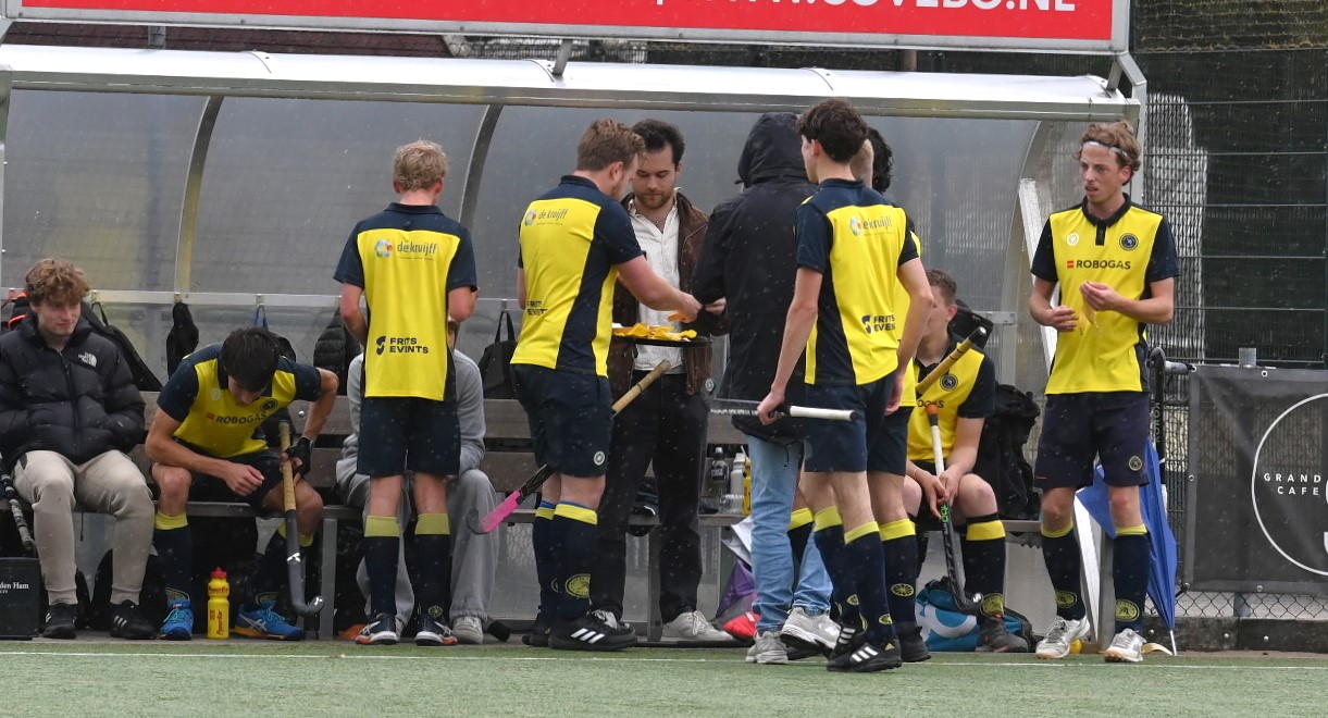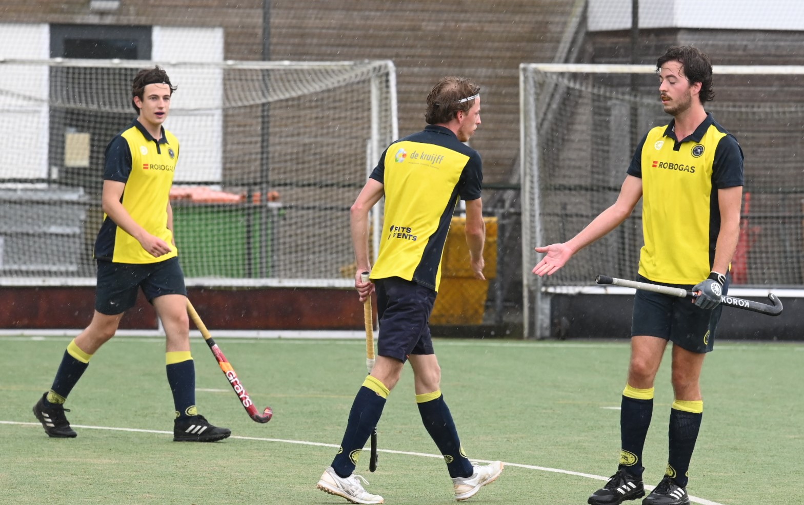 Ondanks het druilerige weer hebben de mannen van de Hockeyclub Nijkerk er zondag 5 oktober een feestje van gemaakt. Op het eigen sportcomplex wonnen de mannen met 7-1 van Ijsseloever. Even later overwon het herenteam onder 25 met overmacht de wedstrijd tegen Haaskamp. Het team uit Amerongen verloor in Nijkerk met 8-1. De goals namens de Nijkerkers werden gemaakt door Maurits, Tijn, Max en Gert. Ondertussen was er ook een cadeaupakket voor de scheidsrechters in verband met de week van de scheidsrechter. Foto Kees van den Heuvel