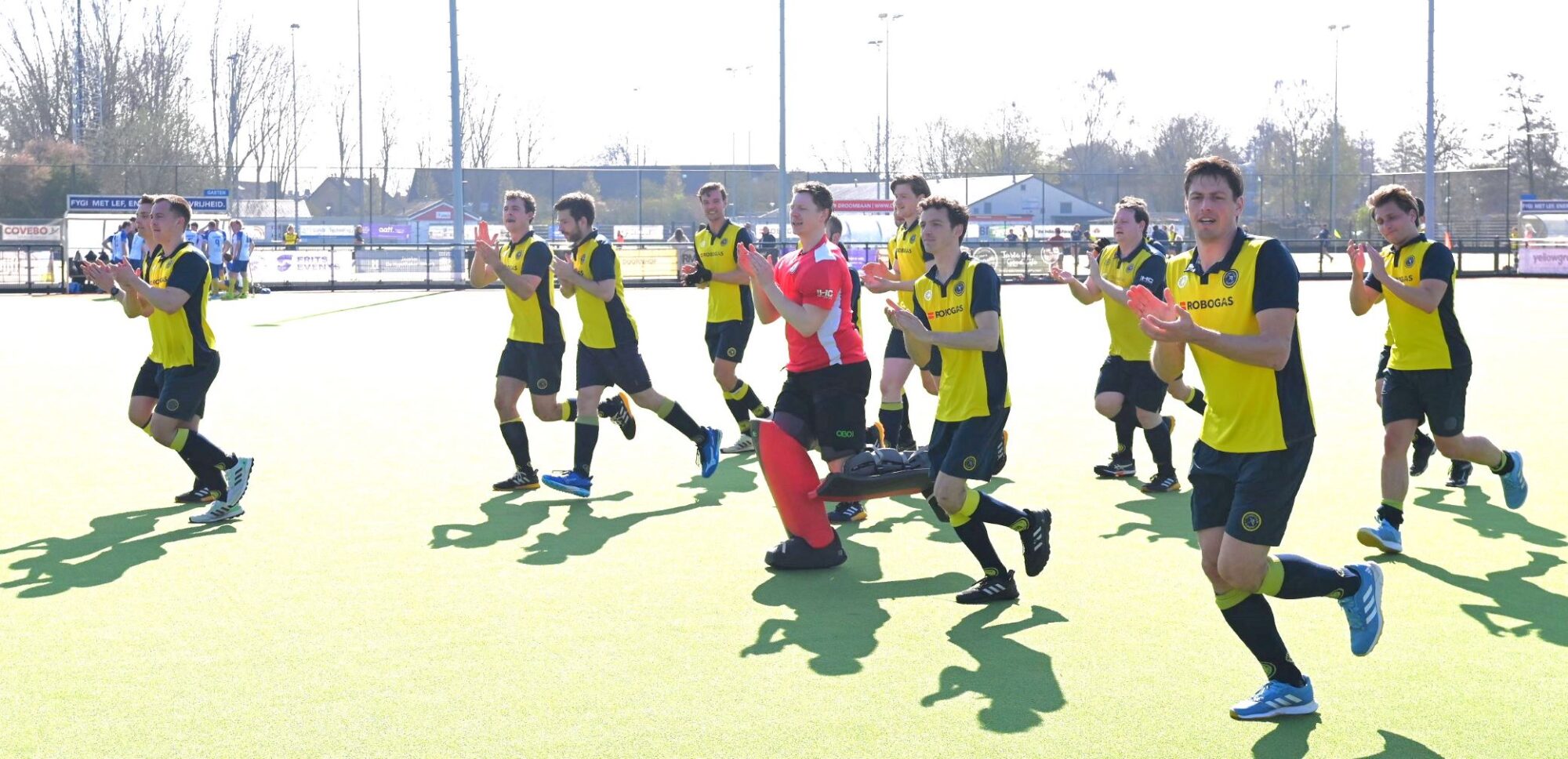 Het eerste herenteam van de Hockeyclub Nijkerk had zondag 22 maart de eer om voor de eerste keer het nieuwe waterveld in te wijden. ,,Het speelt heerlijk,” reageerden de spelers. Er werd met 1-1 gelijk gespeeld tegen Voordaan uit Groenekan. Een waterveld is een professioneel kunstgrashockeyveld met zeer korte vezels, dat voor gebruik intensief wordt besproeid met water. Hierdoor glijdt de bal sneller en constanter, en vallen spelers minder snel. Het veld biedt optimale demping, voorkomt brandwonden bij glijden en is de standaard voor top-hockey. Het water wordt nadien weer duurzaam opgevangen en heregebruikt. Foto Kees van den Heuvel