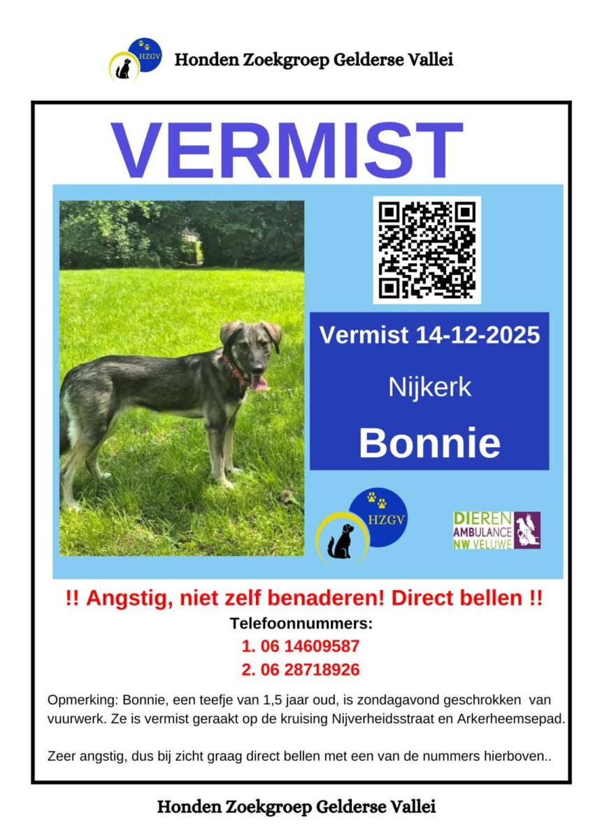 Nijkerk en omgeving opgelet, Bonnie is vermist. Ze is geschrokken vanwege vuurwerk. Ze is erg angstig. Mocht u haar zien: graag direct bellen en zelf geen vangpogingen of benaderpogingen doen: 06 14609587 of 06 28718926. Bonnie is vermist geraakt ter hoogte van de kruising Nijverheidsstraat en Arkemheensepad. Bonnie is een teefje van 1,5 jaar oud. Ze is erg angstig, dus graag direct bellen bij zicht of gezien en niet zelf benaderen. Wil je meehelpen? Stuur dan een whatsapp bericht naar het tweede nummer. In dit gebied wordt samengewerkt met de dierenambulance Noordwest Veluwe.