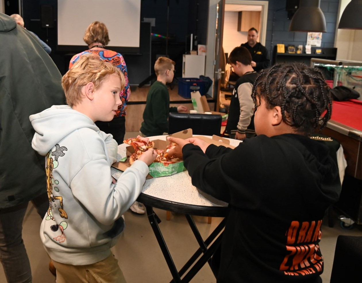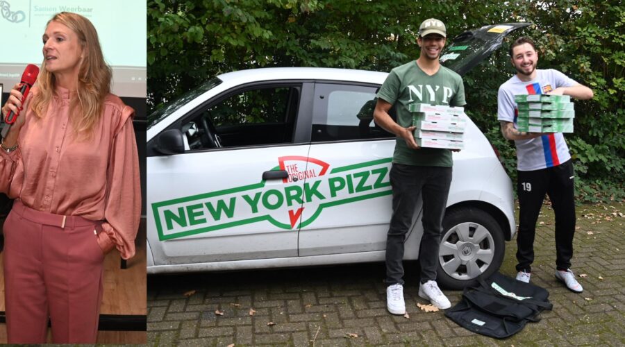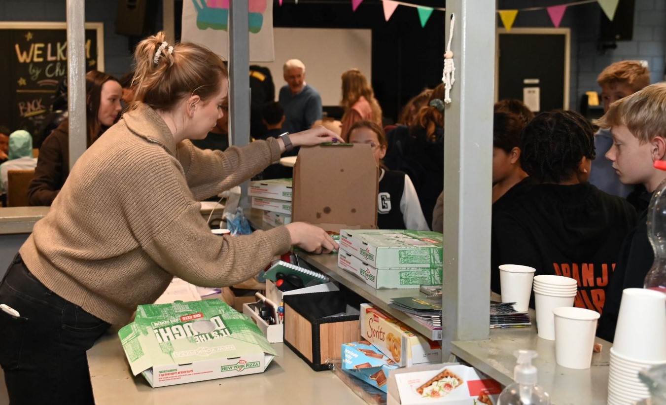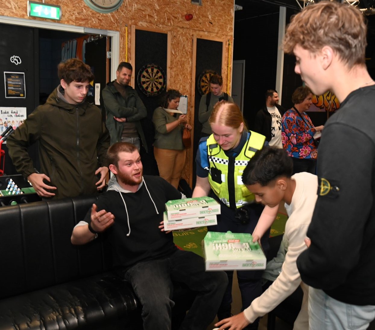 Burgemeester Tinet de Jonge ging vrijdagmiddag 10 oktober op bezoek bij jongerencentrum Chill Out in Nijkerk. Eerst werd deelgenomen aan een zaalvoetbaltoernooi. De burgemeester zag dat er heel wat talent rondliep en ook de boa’s een aardig balletje konden trappen. Verder wees ze in een toespraak op praktijkvoorbeelden uit de tijd dat ze nog bij de politie werkte en veel met jongeren in aanraking kwam. Haar boodschap: ‘Wees een beetje lief voor elkaar’. Ook werd een filmpje getoond waarin onder meer Sparta-voetballer Omar El Gahzouani de hoofdrol speelde. Daarna was het tijd voor pizza’s, aangeboden door New York Pizza in Nijkerk. foto Kees van den Heuvel