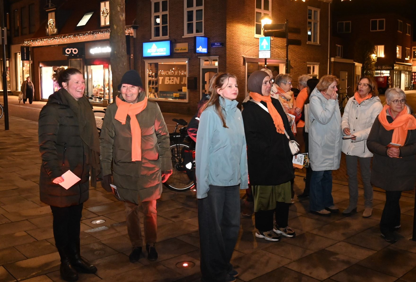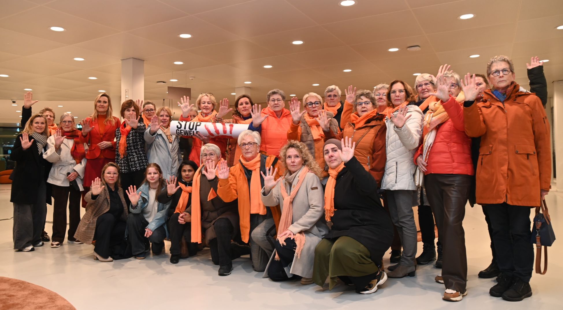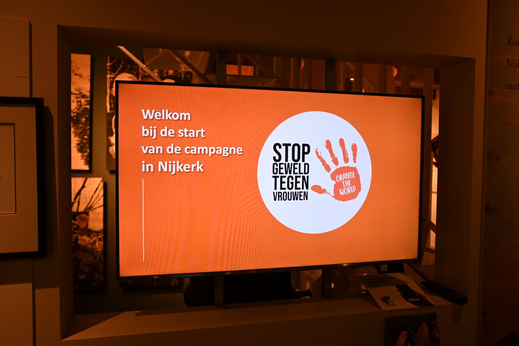Met een mars van het Nijkerkse gemeentehuis richting het centrum van Nijkerk en Museum Nijkerk hebben bijna dertig Nijkerkse vrouwen een gebaar gemaakt om geweld tegen vrouwen tegen te gaan. Op het gemeentehuis kregen de initiatiefneemsters van wethouder Rohen een mal aangeboden, waarmee op straat een hand werd geschilderd. Deze hand staat voor de wereldwijde campagne Orange the World, waarmee aandacht wordt gevraagd voor geweld tegen meisjes en vrouwen. De beschildering vond plaats bij Museum Nijkerk. Vervolgens liep nog een groot aantal vrouwen door naar het Plein in Nijkerk waar een mandarijn kon worden genuttigd. . Op verschillende manieren wordt de komende tijd in de gemeente Nijkerk stil gestaan bij Orange the World. Foto Kees van den Heuvel