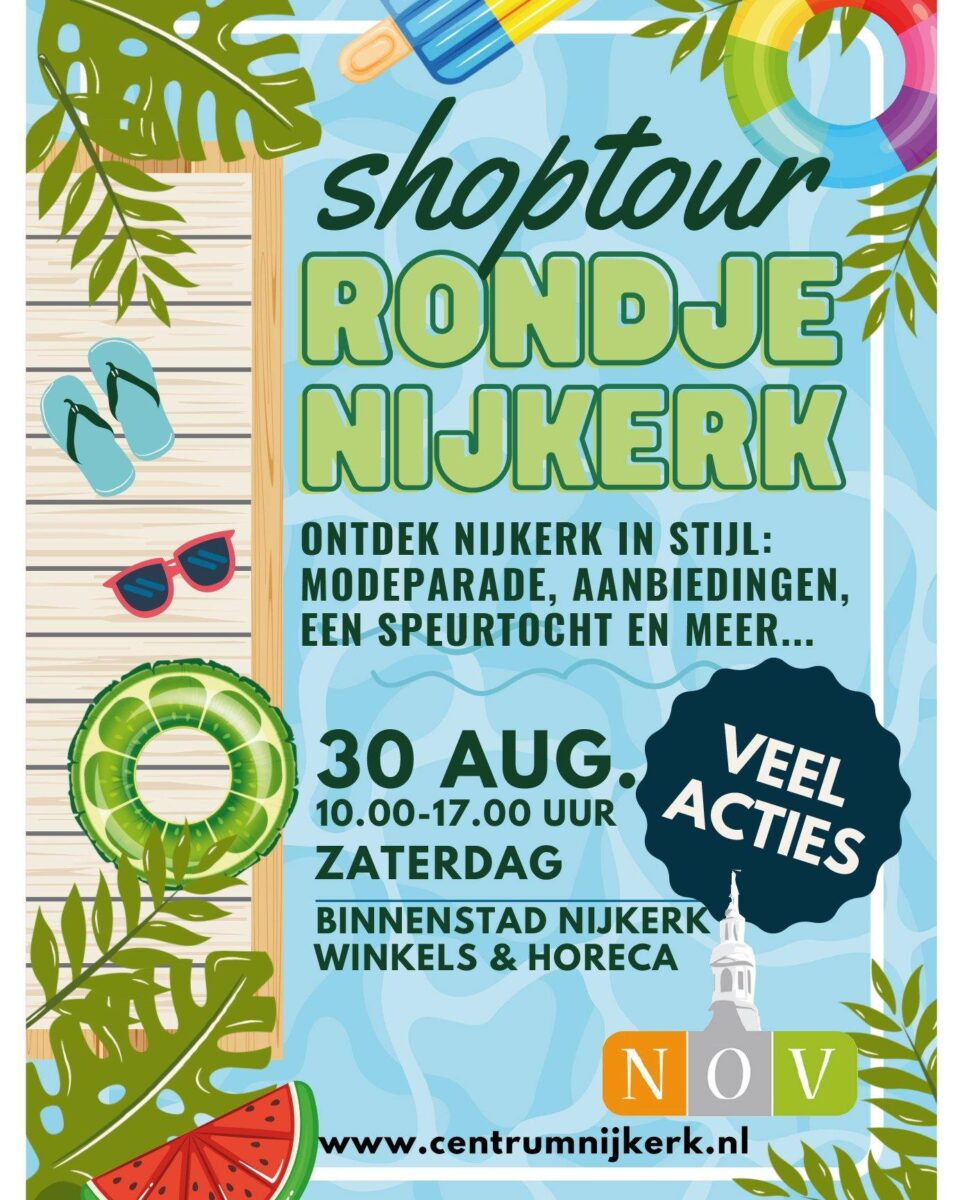 De Nijkerkse Ondernemers Vereniging (NOV) organiseert zaterdag 30 augustus de Summer Shop Tour in het centrum van Nijkerk. Meer dan 30 winkels en horecazaken zorgen voor een dag vol verrassingen: Er is een modeparade, een speurtocht, hapjes en drankjes, veel kortingen en vooral veel gezelligheid. Het is van 10.00 tot 17.00 uur in hartje Nijkerk. Kom shoppen, proeven en genieten. Laat je verrassen!