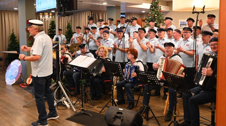 Op de laatste dag van het jaar 2025 was er als vanouds een laatste optreden van het Zeemanskoor Nijkerks Welvaren voor de ouderen en vrijwilligers van verzorgingscentrum Sint Jozef in Nijkerk. Het koor zong zijn beste zeevaartsliederen, terwijl de aanwezigen in de overvolle recreatiezaal werden getrakteerd op oliebollen en een wijntje of advocaatje. Eerst werd een jarige in het zonnetje gezet en daarna kon het meezingen en inhaken van start gaan. Foto Kees van den Heuvel