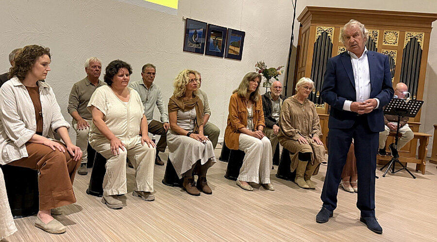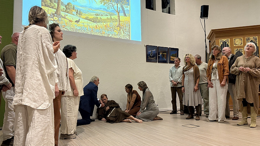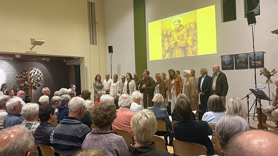 ‘Wie barmhartigheid leeft en deelt wat hij heeft, danst de eeuwige dans.’ Het is een van de regels uit de liederen die Schimscheimer op muziek zette voor de musical Franciscus, troubadour van God. Die ging in 2009 in première en is daarna diverse keren herhaald. In de coronaperiode vormde Schimscheimer de musical om tot een verhaalconcert dat eenvoudiger is op te voeren. Elk jaar rond de sterfdag van Franciscus klinkt dit verhaalconcert enkele keren. Ter gelegenheid van het 50-jarig jubileum van het kerkgebouw was dit keer de Eshof het decor van het concert. Volgende week is Loenen aan de Vecht aan de beurt. Vanavond is de Eshof gevuld met meer dan honderd bezoekers.