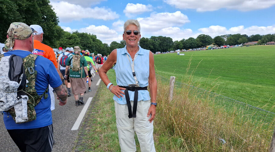 Diverse inwoners van Nijkerk nemen deel aan de Vierdaagse van Nijmegen, daaronder Mirjam van Driel en ze heeft gekozen voor een dagelijkse afstand van 30 kilometer. Ook de donderdag met de beruchte Zevenheuvelenweg “heeft ze overleefd”, ze kijkt nu uit naar de finish op vrijdag. Wandelen is niet haar enige hobby, ze is tevens fanatiek motorrijder en al jarenlang lid van Stimon. Als ze voldoende is uitgerust, neemt ze a.s. zondag weer op haar motor deel aan de eerstvolgende Stimon-rit. Bron en Foto: Henk Karelsen