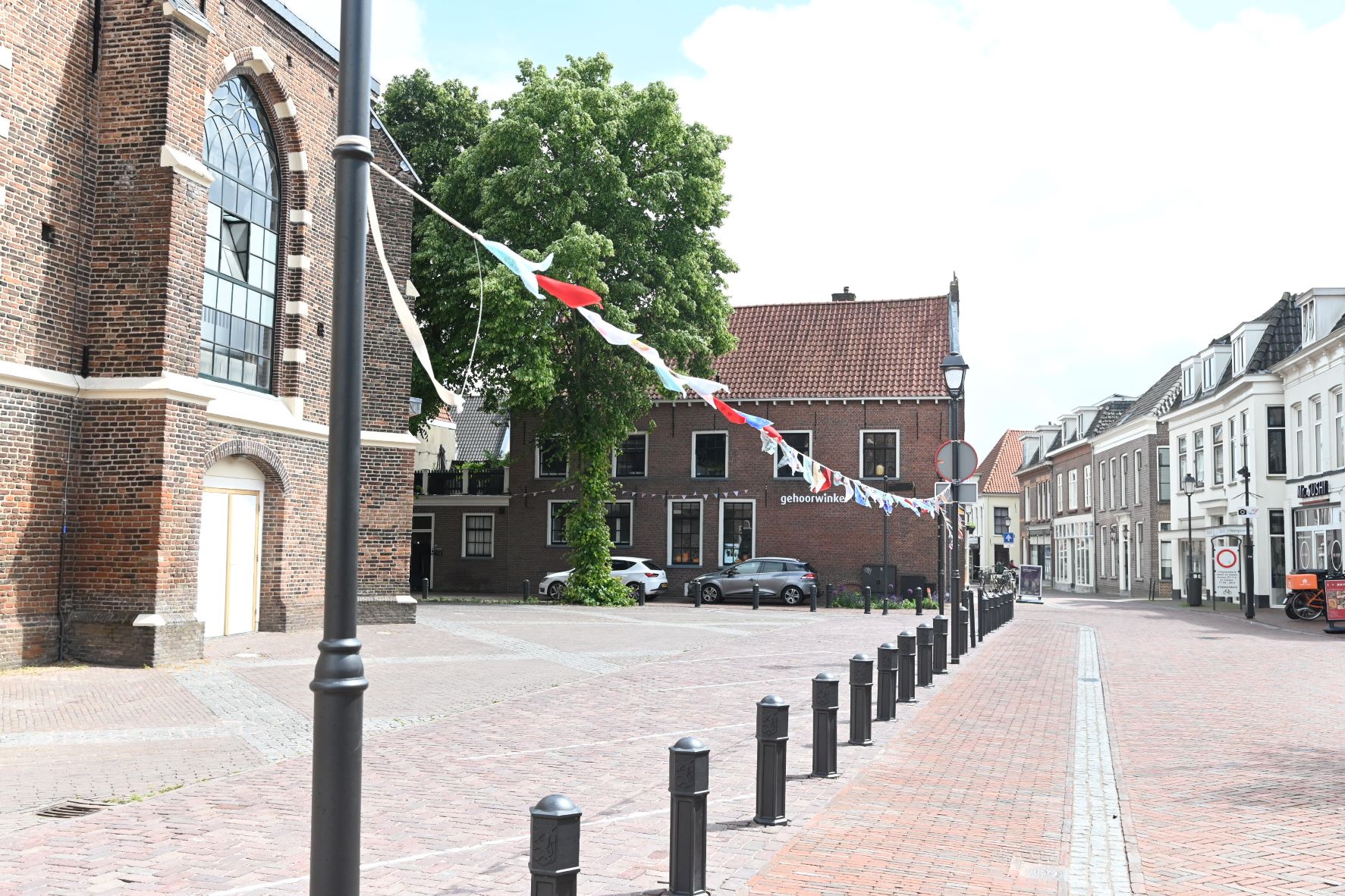 Ook het Nijkerkse Plein is inmiddels versierd met allerlei vlaggetjes. Het is onderdeel van de uitdaging om een vlaggenpracht te realiseren. Dat was aanvankelijk nog tussen het Verlaat en buurthuis De Refter, maar ondertussen wordt de hele stad een grote vlaggenpracht. De vlaggetjes op het Plein zijn gemaakt door leerlingen van de basisschool De Appelgaard. Overigens is het fysiek niet mogelijk om een verbinding te maken tussen de Holkerstraat en de Refter vanwege de druk bereden Torenstraat. Daarom zal daar als verbindingsteken een aantal vlaggen met krijt op het wegdek worden getekend. Foto Kees van den Heuvel