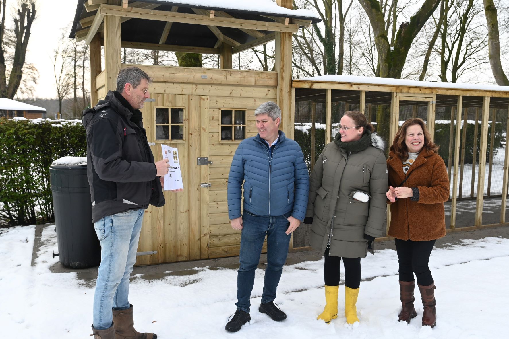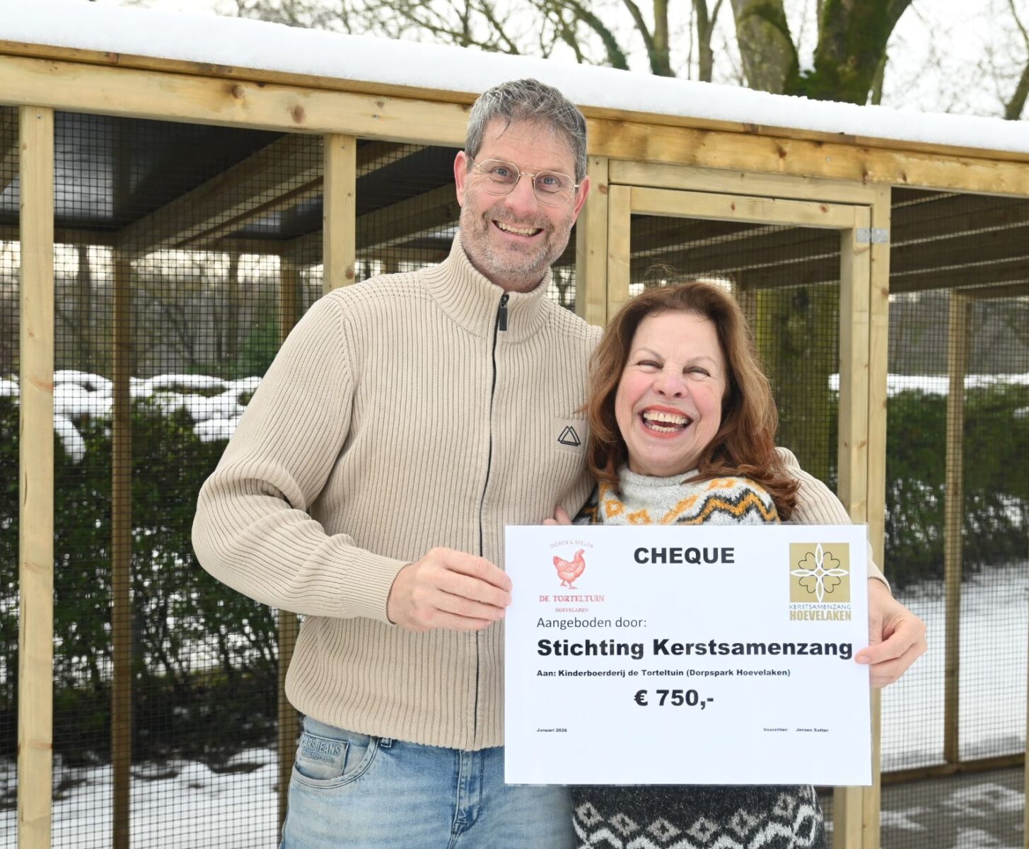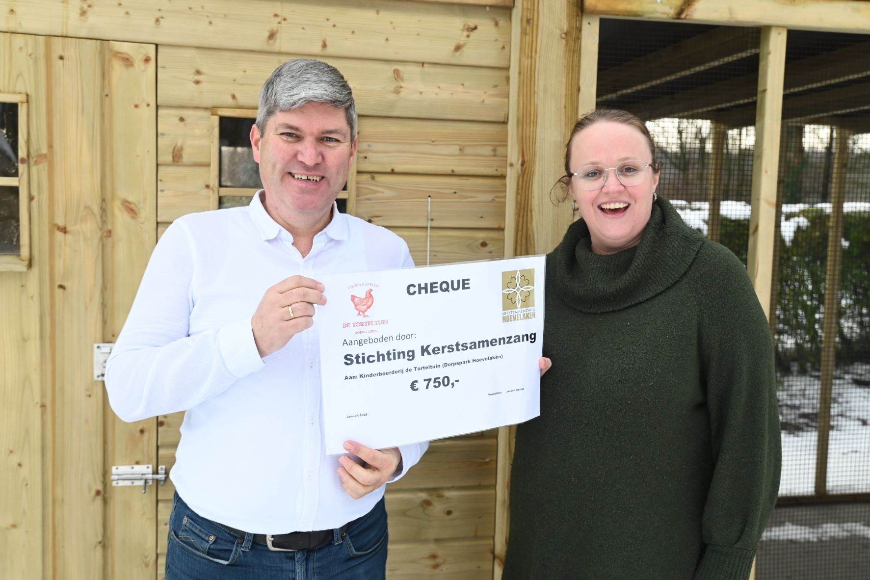 Donderdag 8 januari is een cheque overhandigd aan de stichting Kinderboerderij De Torteltuin ter waarde van 750 euro. Dat geld is enkele weken geleden opgehaald tijdens de collecte van de kerstsamenzang in Hoevelaken. Namens de kinderboerderij waren Herman Vreekamp en Esther Stoltenkamp aanwezig. De organisatie van de stichting Kerstsamenzang werd vertegenwoordigd door Willie van Kooij en Jeroen Satter. De kinderboerderij is nog lang niet gereed, maar inmiddels zijn wel steeds meer de contouren zichtbaar van het complex naast sporthal De Slag. De kinderboerderij maakt deel uit van een project met een beachvolleybalveld, een pumptrackbaan en een beweegeiland. Inmiddels zijn op het perceel van de kinderboerderij diverse gebouwen geplaatst alsmede piketpalen voor een nog aan te leggen zandbak en wandelpad. De beelden van twee koeien die zijn ontvangen van het Glazen Thuis worden geplaatst bij een hooitas en ergens bij de ingang. Eén van die koeien kun je straks ook echt melken. Er is inmiddels ook een beheerder aangesteld die elke dag het terrein zal openen en sluiten. Foto Kees van den Heuvel