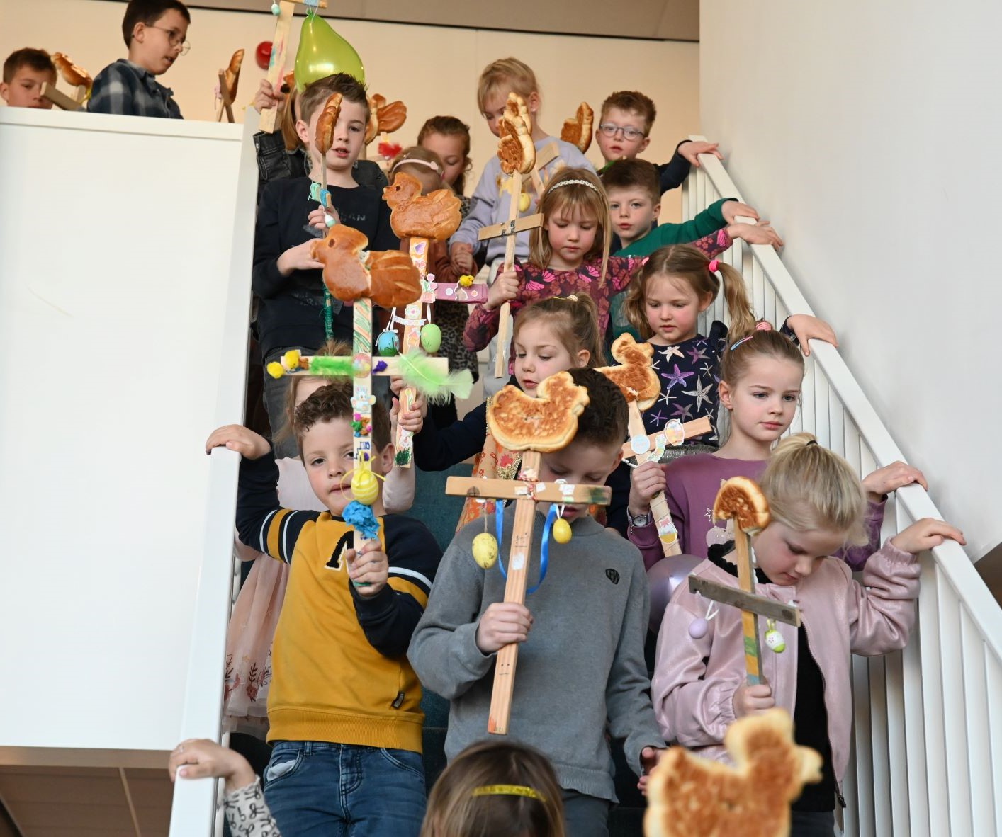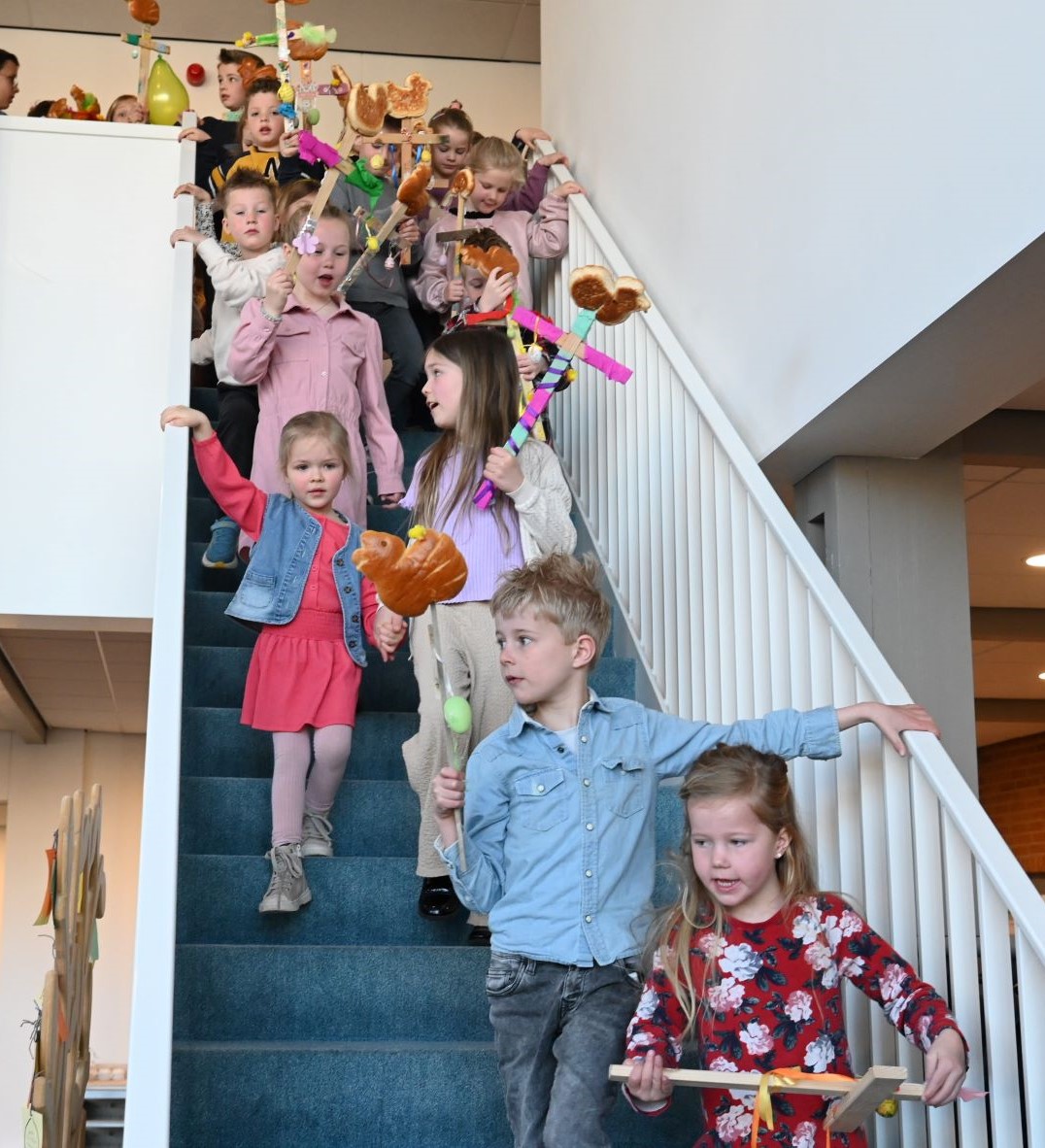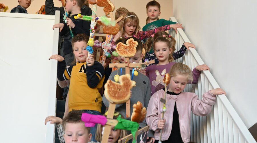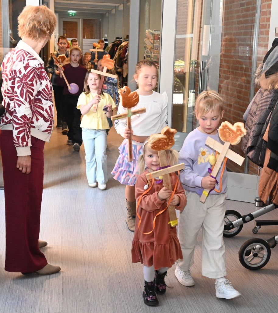 In de Gereformeerde Kruiskerk in Nijkerk werd zondag 29 maart palmpasen gevierd. Tientallen kinderen hadden een palmpaasstok gemaakt en liepen daarmee na afloop van de kerkdienst de kerk aan de Venestraat binnen. Ook werden liederen gezongen door het kinderkoor van de Kruiskerk. Herdacht wordt dat Jezus Christus, overeenkomstig de profetie van de profeet Zacharia, op een ezelsveulen Jeruzalem binnentrok en de menigte hem met palmtakken tegemoet ging. Foto Kees van den Heuvel en Henk Karelsen