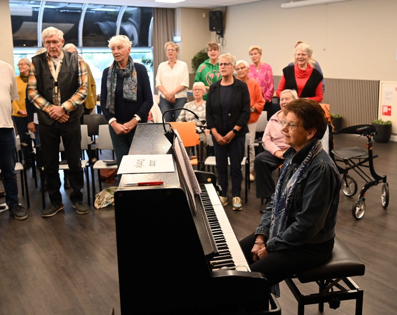 Het participatiekoor Nijkerk kwam zaterdag 18 oktober voor een tweede keer bijeen in het UVV-gebouw in Nijkerk om zich voor te bereiden op het grote concert aan het einde van het jaar. Het is een koor voor mensen met een haperend brein door bijvoorbeeld dementie, waarbij ze samen met mantelzorgers, professionele zangers en instrumentalisten repeteren en optreden. Het koor is een projectkoor dat plezier in het zingen en gezamenlijke beleving vooropstelt. De deelnemers repeteren samen onder leiding van een professionele dirigent. Het initiatief komt voort uit een samenwerking tussen onder andere Sigma, de Bibliotheek en de UVV. Foto Kees van den Heuvel