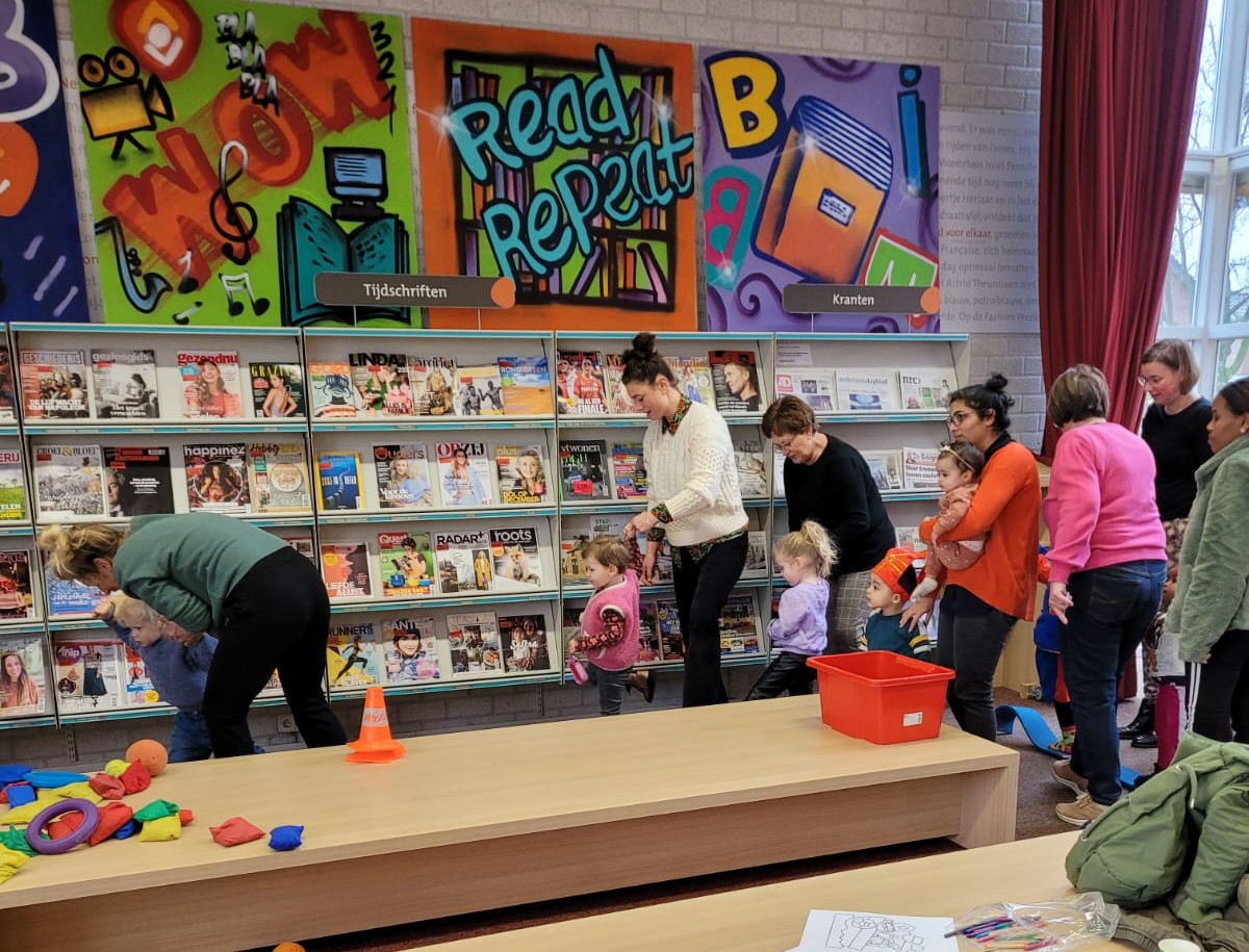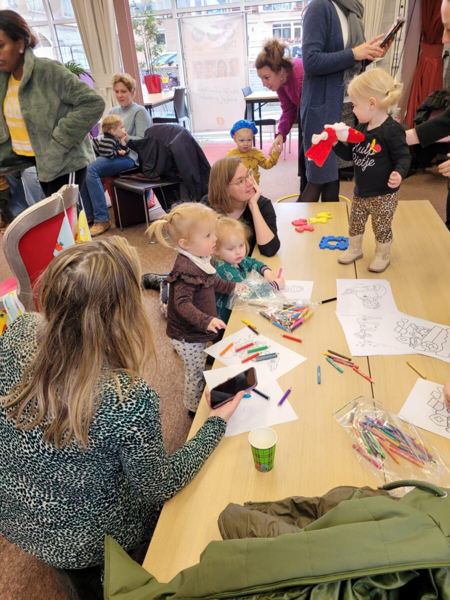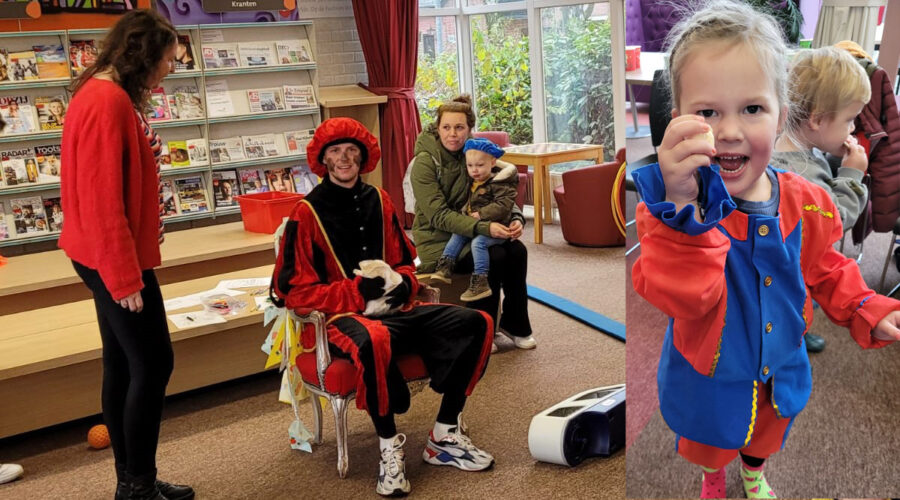 Het was een dag voor de verjaardag van Sinterklaas enorm druk tijdens de peuterochtend in de Nijkerkse bibliotheek. In samenwerking met Nijkerk Sportief en Gezond was een stoute Piet uitgenodigd. Alle kinderen werden getrakteerd op wat lekkers en er konden kleurplaten worden gemaakt. Foto Ingrid Pasker