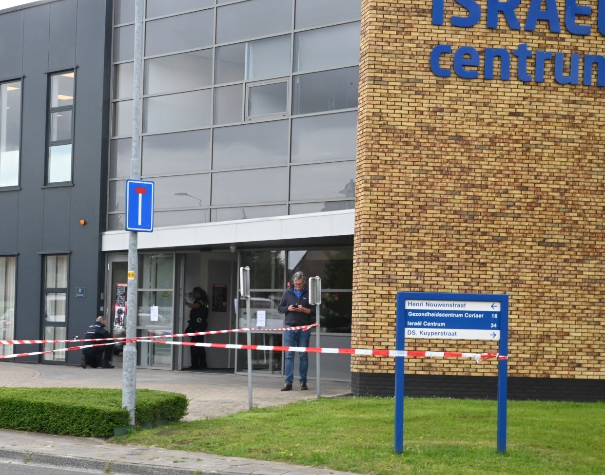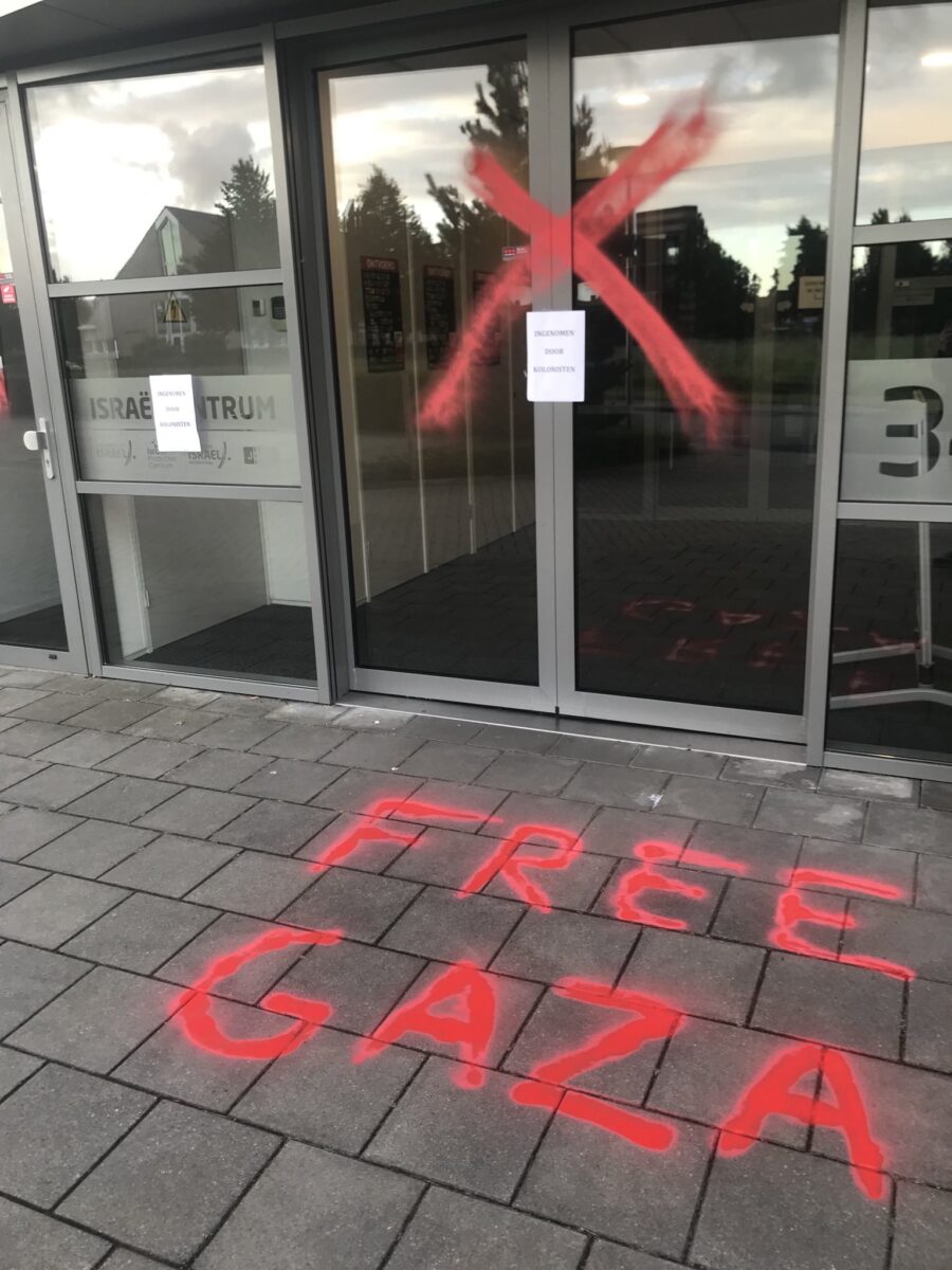 Actievoerders lijken het zondagmorgen 7 juli het te hebben gemikt op het Israël Centrum in Nijkerk. De politie heeft de entree van het gebouw hermetisch afgesloten met linten en voert onderzoek uit. Zowel bij de ingang als binnen hangen overal posters, wat het idee versterkt dat actievoerders het gebouw binnen zijn gedrongen. Ook is verf gespoten. De actie wordt opgeeist door de actiegroep Extension Rebellion. Op X (voorheen Twitter) schrijven ze: ,,We blokkeerden vandaag de ingang van het Israëlcentrum in Nijkerk met de tekst ‘Ingenomen door kolonisten’ om aandacht te vragen voor de medeplichtigheid van @cvisrael aan illegale nederzettingen en de onderdrukking van Palestijnen.” Tegelijk kleurde ook de vijver bij het Nationaal Militair Museum in Soesterberg rood om ”de Nederlandse steun aan Israël en medeplichtigheid aan de genocide in Gaza aan te klagen. De actievoerders eisen directe actie en een koerswijziging. Foto en bron Kees van den Heuvel