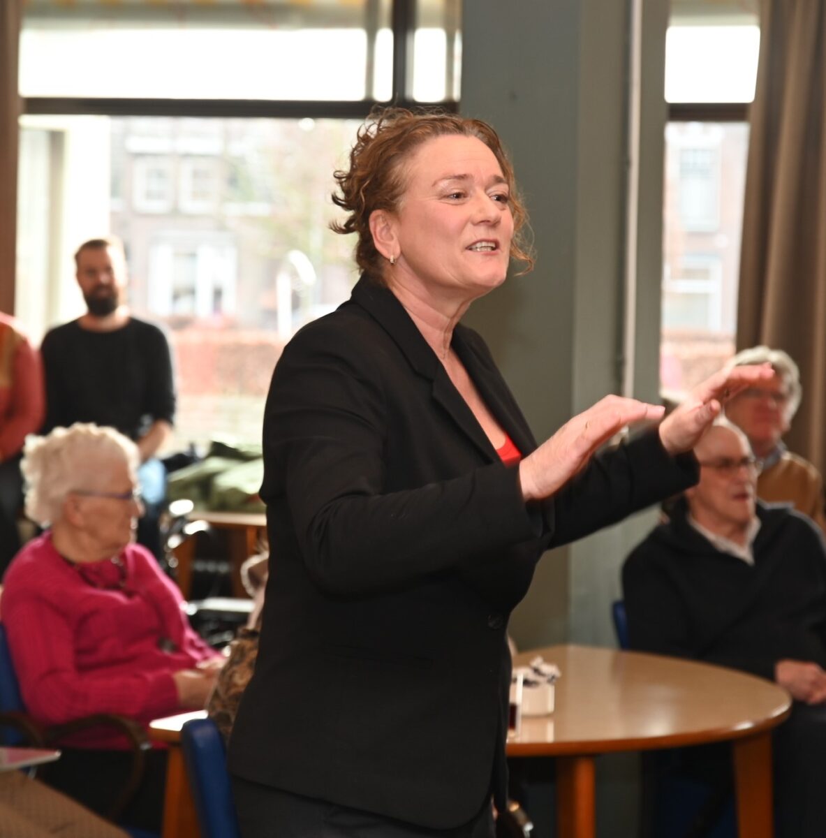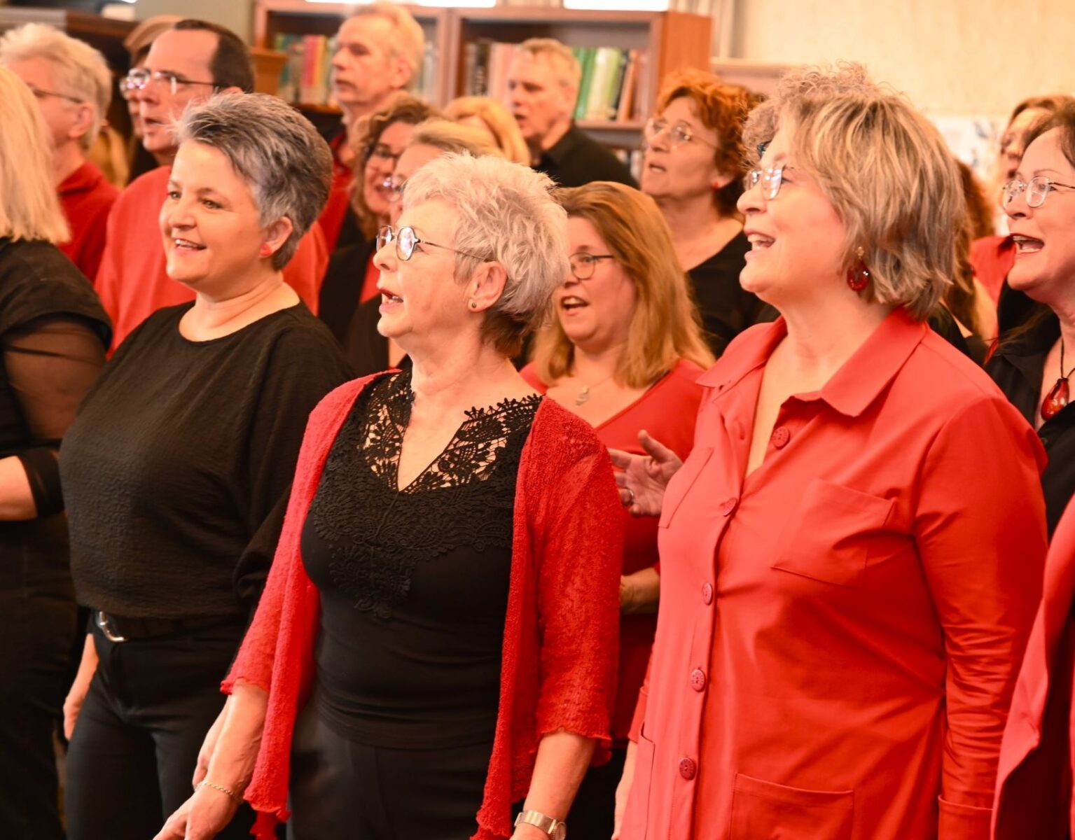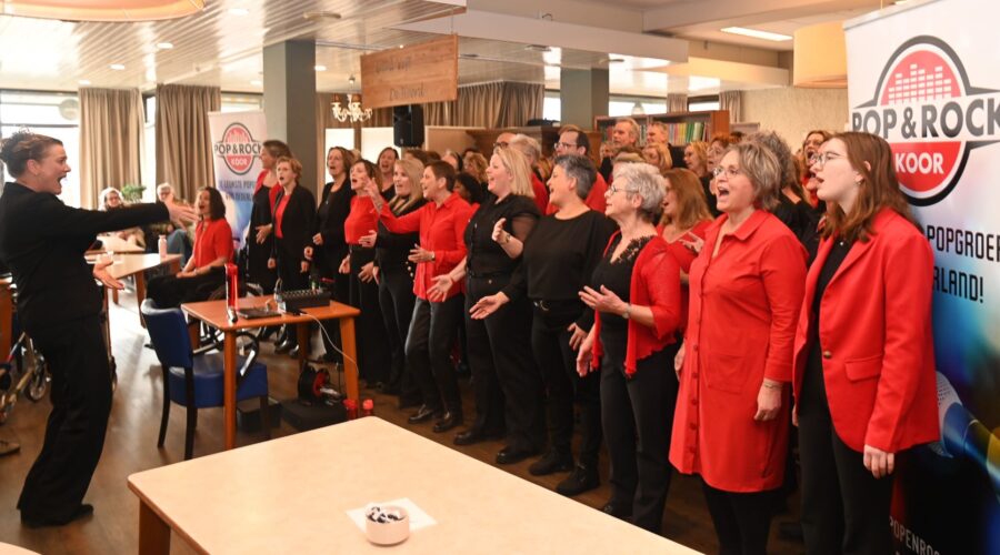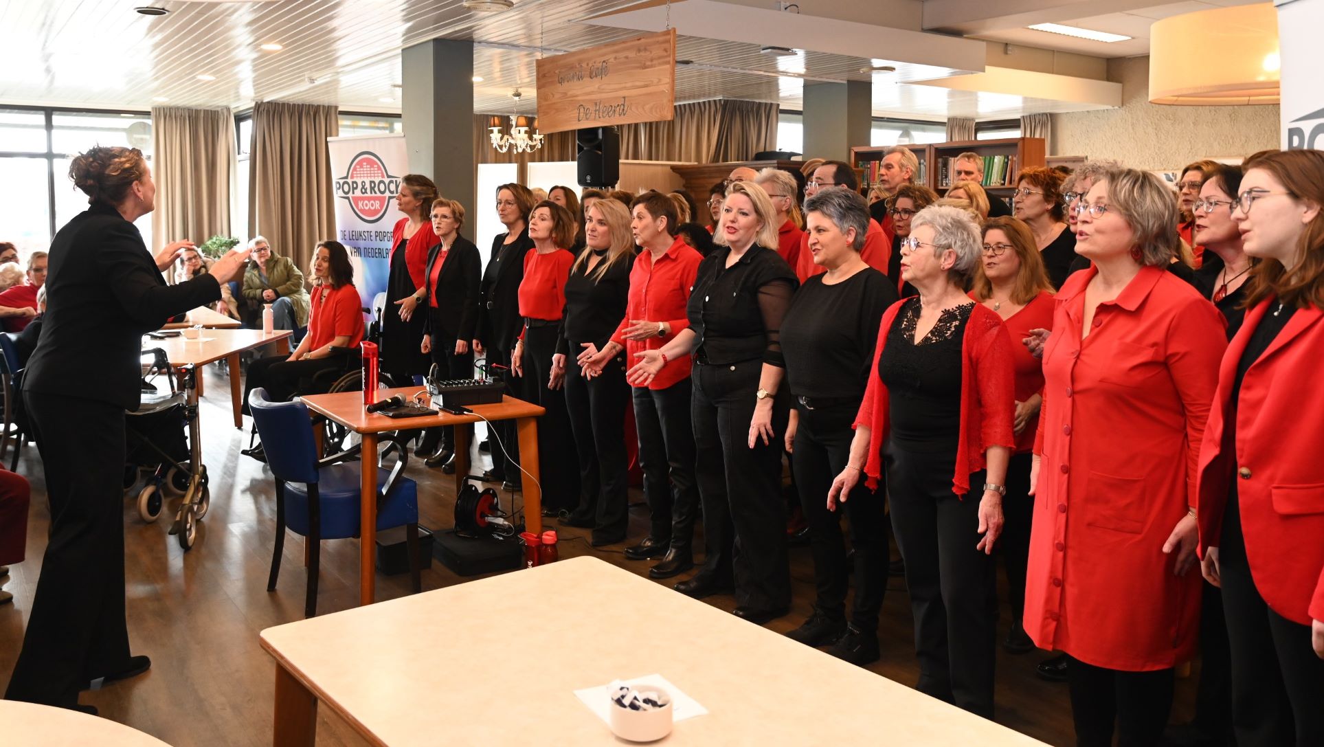 Zaak De Heerd in verzorgingscentrum Sint Jozef in Nijkerk was zondag 1 februari afgeladen vol voor een aantal optredens van het Pop en Rockkoor Nijkerk. Stevige Top 40 hits werden afgewisseld door mooie ballads en soms een nummer van wat langer geleden. Iedereen in de zaal zong vrolijk mee. Foto Kees van den Heuvel