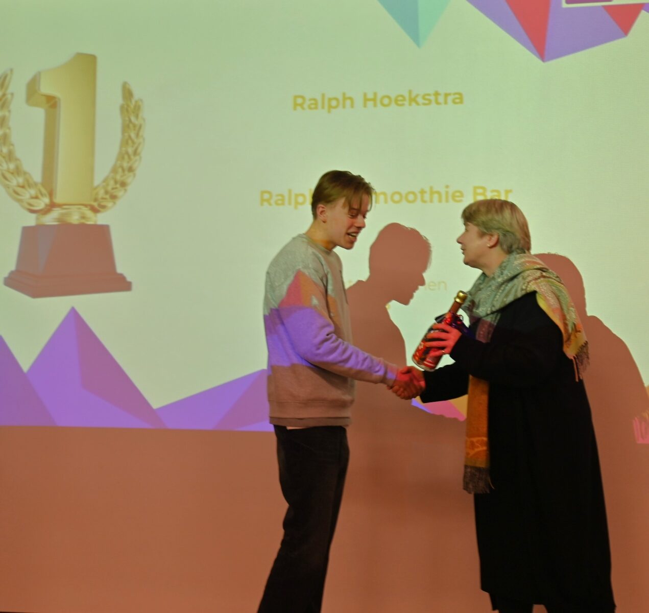 Ralph Hoekstra van het Corlaer College is woensdagavond 4 februari uitgeroepen tot beste jonge ondernemer van Nijkerk. Hij presenteerde samen met veel andere Vmbo-leerlingen van het Corlaer College (leerrichting Economie en Ondernemen) een eigen bedrijf en kwam als winnaar uit de bus. Dat deed hij met een eigen smoothie bedrijf. Dat bedrijf heette Ralph’s Smoothie Bar. Diverse aanwezigen hebben van de lekkernij geproefd. De eerste prijs werd uitgereikt door wethouder Broekman. Zij prees de ondernemersgeest van de leerlingen. Sommigen gaan ermee door en anderen hebben hun ambitie toch ergens anders liggen, zo constateerde ze. Nummer 2 werd Elayza Dehati met ED Juwelry en Mark van Vulpen werd derde met het bedrijf Dahlia. Bij het keuzevak Ondernemen hebben de vierdejaarsleerlingen van het profiel Economie en ondernemen geleerd hoe je een eigen onderneming kunt opzetten. Omdat je in de praktijk pas echt leert, hebben de leerlingen de theorie gelijk toegepast in de praktijk. Zij hebben vol enthousiasme gewerkt aan hun eigen fictieve bedrijf. De leerlingen hebben dezelfde stappen gezet als een ‘echte’ ondernemer. Een product kiezen, een ondernemingsplan schrijven, de doelgroepen omschrijven, de verkoopprijs bepalen, nadenken over inkoop en verkoop, marketing en promotie. De leerlingen hebben niet stilgezeten. Tijdens de bedrijvenmarkt presenteerden de leerlingen vol trots hun bedrijf aan hun familie en vrienden. Met muntjes kon het beste bedrijf worden gekozen. Wie de meeste muntjes had, was de winnaar. De beoordeling van de ondernemer 2025/206 maakt deel uit van het uiteindelijke eindcijfer van de examen. Foto Kees van den Heuvel