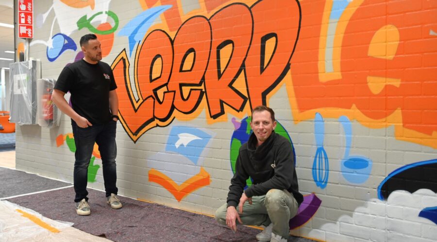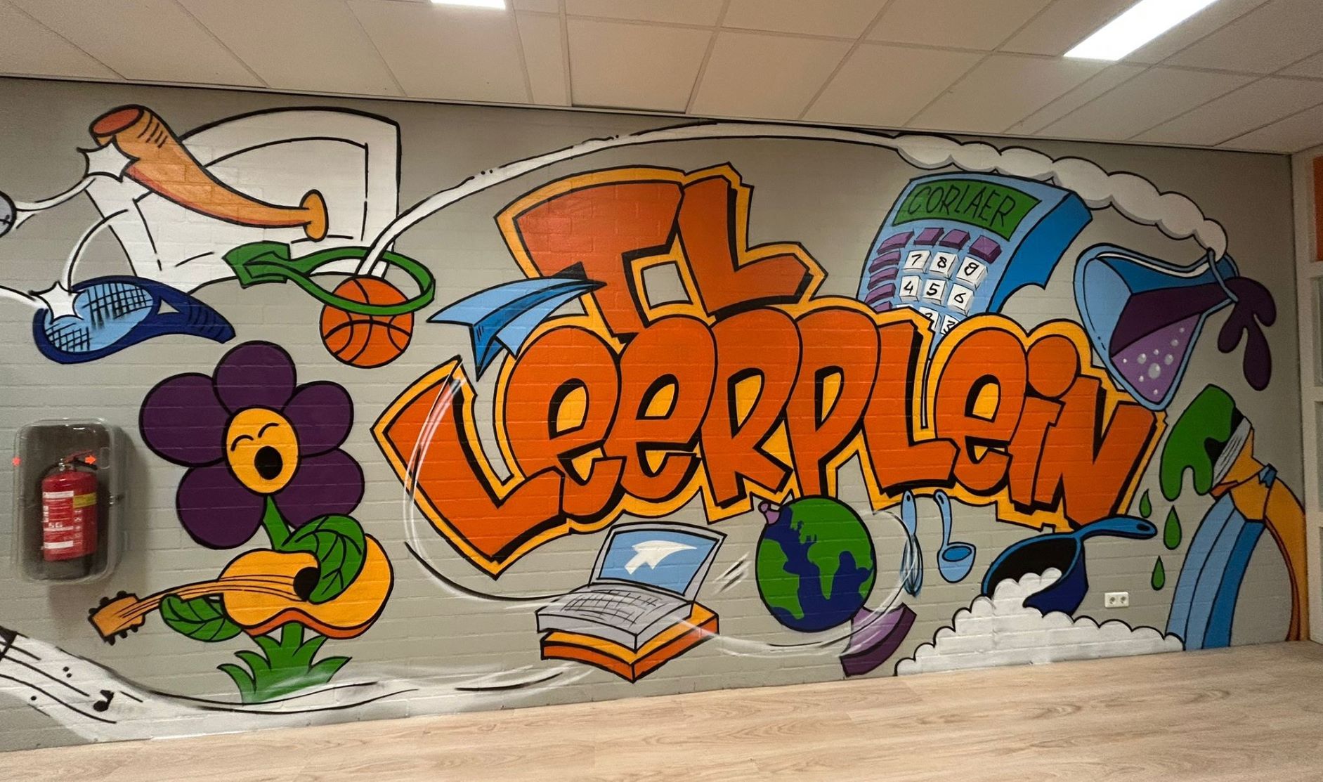 Kunstenaar Ralph van Slooten kreeg de opdracht om een grote muur in het Corlaer College te voorzien van een kunstwerk. Het werd een graffiti van het TL Leerplein, een kleurrijk schouwspel. Het lukt Ralph om het kunstwerk vrijdag 19 december binnen 1 dag te voltooien. Pas over twee weken kunnen de scholieren van het kunstwerk genieten, want dan moeten ze weer naar school. Foto Kees van den Heuvel
