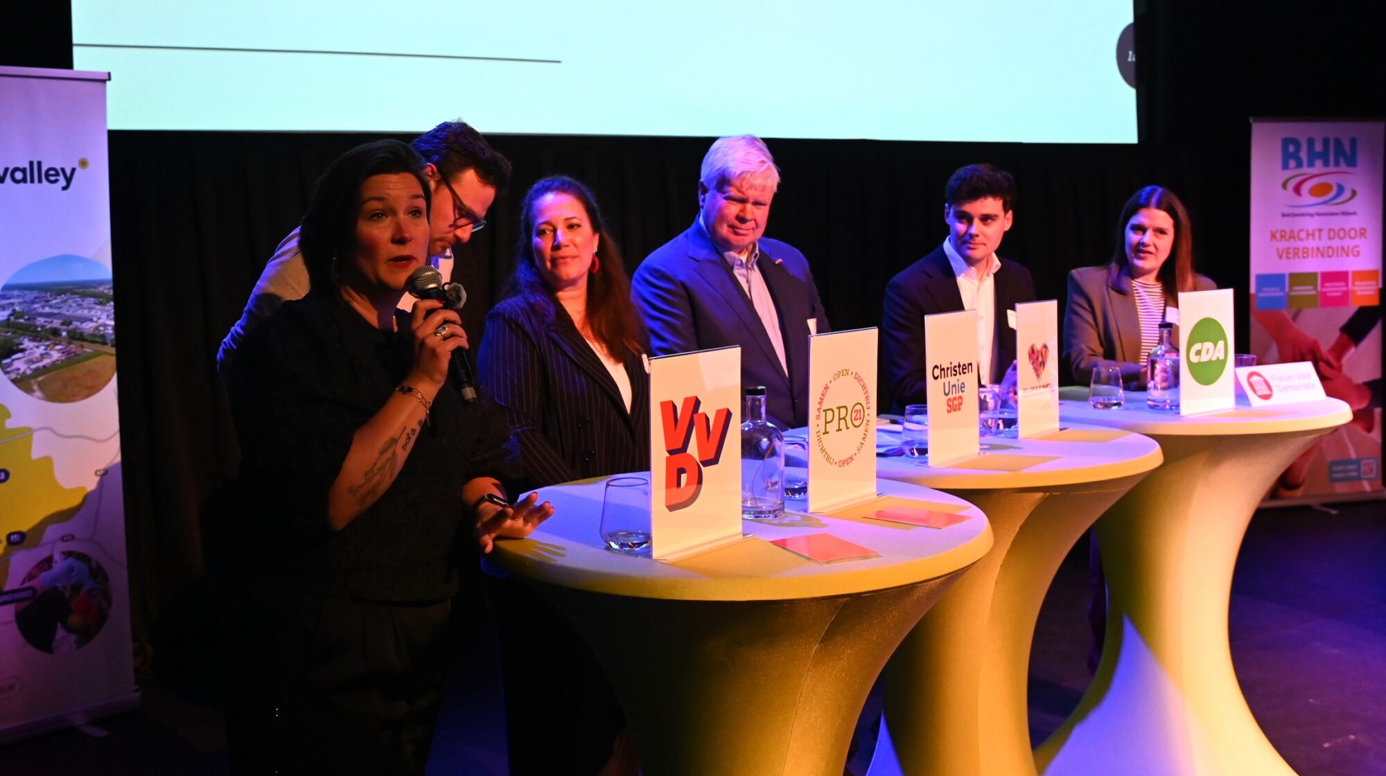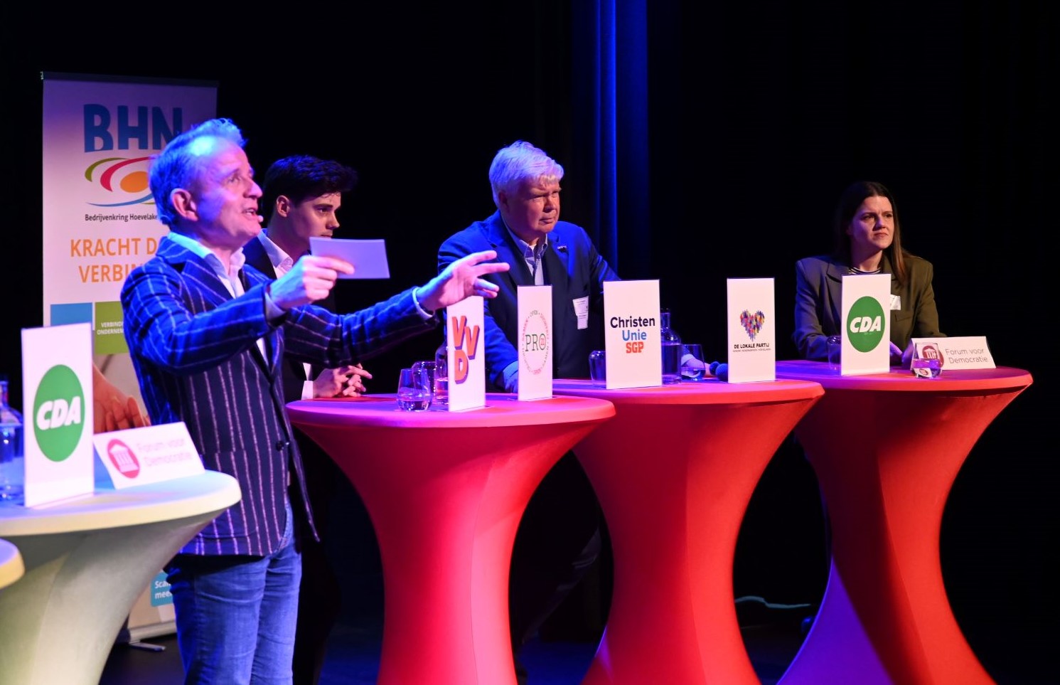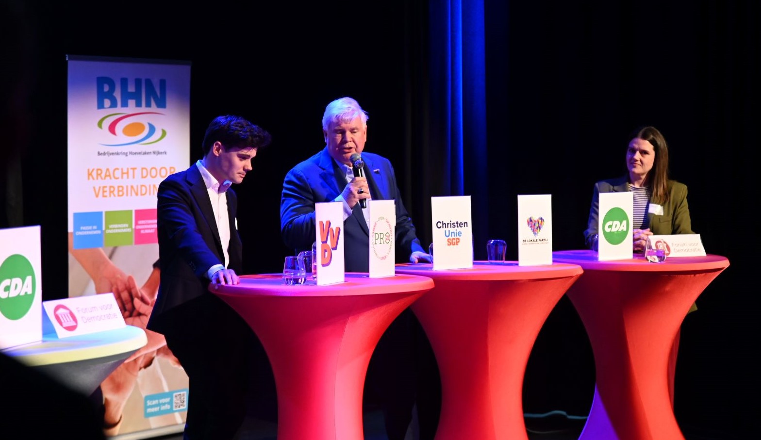 De Bedrijvenkring Hoevelaken Nijkerk (BHN) organiseerde maandagavond 9 maart in een volgepakt theater Streams Breede Beek het eerste lijsttrekkersdebat van Nijkerk. In aanloop naar de verkiezingen legden lokale ondernemers de politiek het vuur na aan de schenen over nijpende dossiers zoals de verkeersdrukte, woningbouw en de komst van de kazerne in Zeewolde. De nieuwe lokale partij Voor Ons ontbrak. Echt significante verschillen waren niet merkbaar tussen de partijen. Een heet hangijzer wordt wel de oostelijke rondweg waarbij nog niet iedereen is overtuigd van de rondweg die er moet komen in de omgeving van de Oude Barneveldseweg richting Beulencamperweg. Meer over Oostelijk Nijkerk dinsdagavond in het tweede debat met de wijk Luxool. Op verkeerskundig gebied werden wel diverse tips gegeven door de VVD: maak een parallelweg langs de A1 dat Hoevelaken met Barneveld verbindt, zo stelde Suzan Steltenpool van de liberale partij voor. Ook de stagnerende woningbouw kwam aan bod: zonder nieuwe woningen vrezen ondernemers een tekort aan personeel in de regio. De politiek beloofde versnelling, maar de zaal bleef kritisch over de realiteitswaarde van deze toezeggingen. Voor wat betreft windenergie was er evenmin duidelijkheid. Ja, er moet windenergie worden toegepast in Nijkerk, maar dat mag niet ten koste gaan van het woongenot en veiligheidheid van de Nijkerkse burgers. De mogelijke komst van een superkazerne in Zeewolde werd door de lijsttrekkers gewogen: is dit een economische kans voor lokale toeleveranciers of een logistieke bedreiging? Middels het opsteken van groene of rode kaarten kon het publiek eveneens haar mening laten horen. De avond markeerde een belangrijk moment in de campagne, waarbij de zakelijke belangen van Nijkerk, Hoevelaken en Nijkerkerveen luid en duidelijk op de politieke agenda zijn gezet. Foto Kees van den Heuvel
