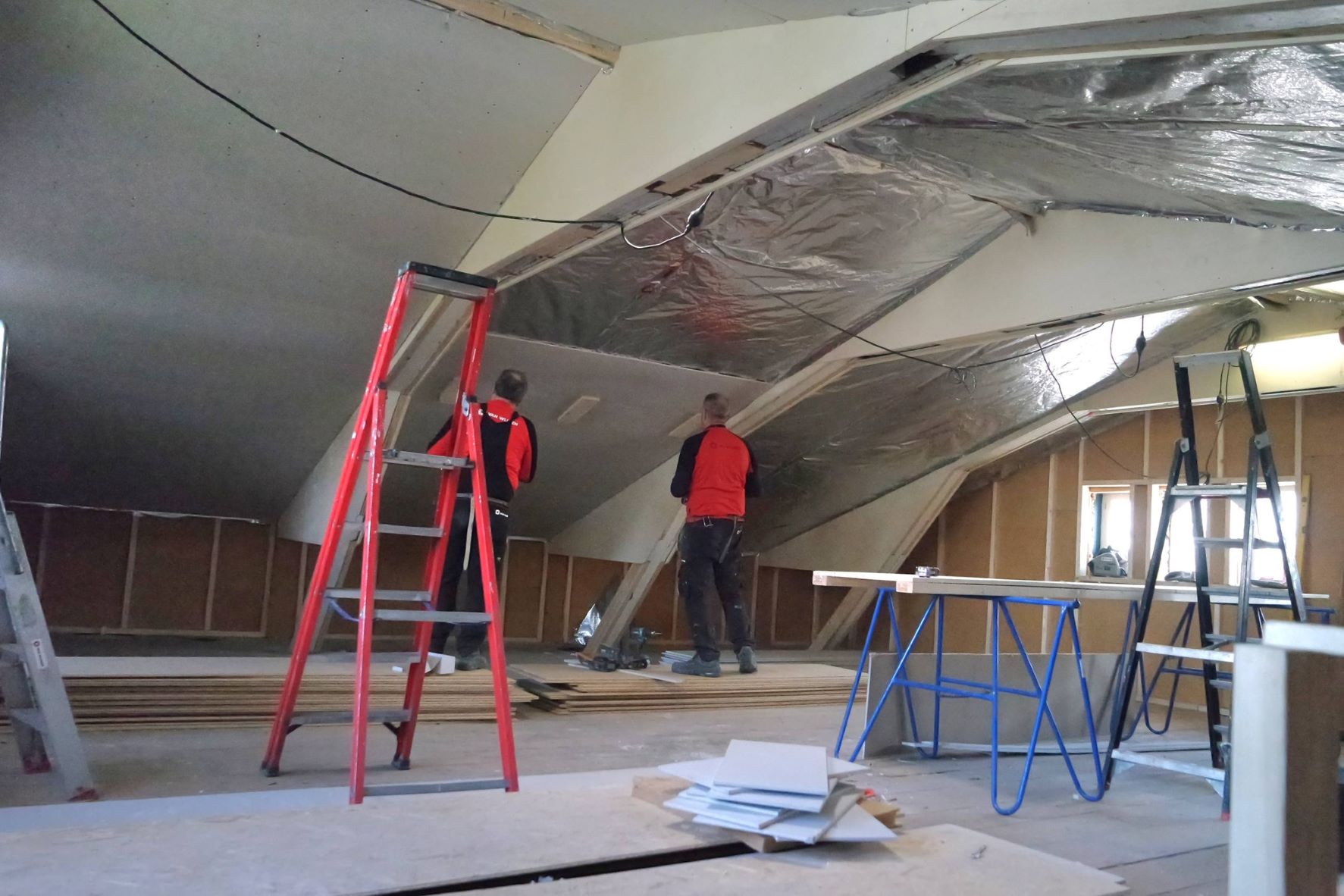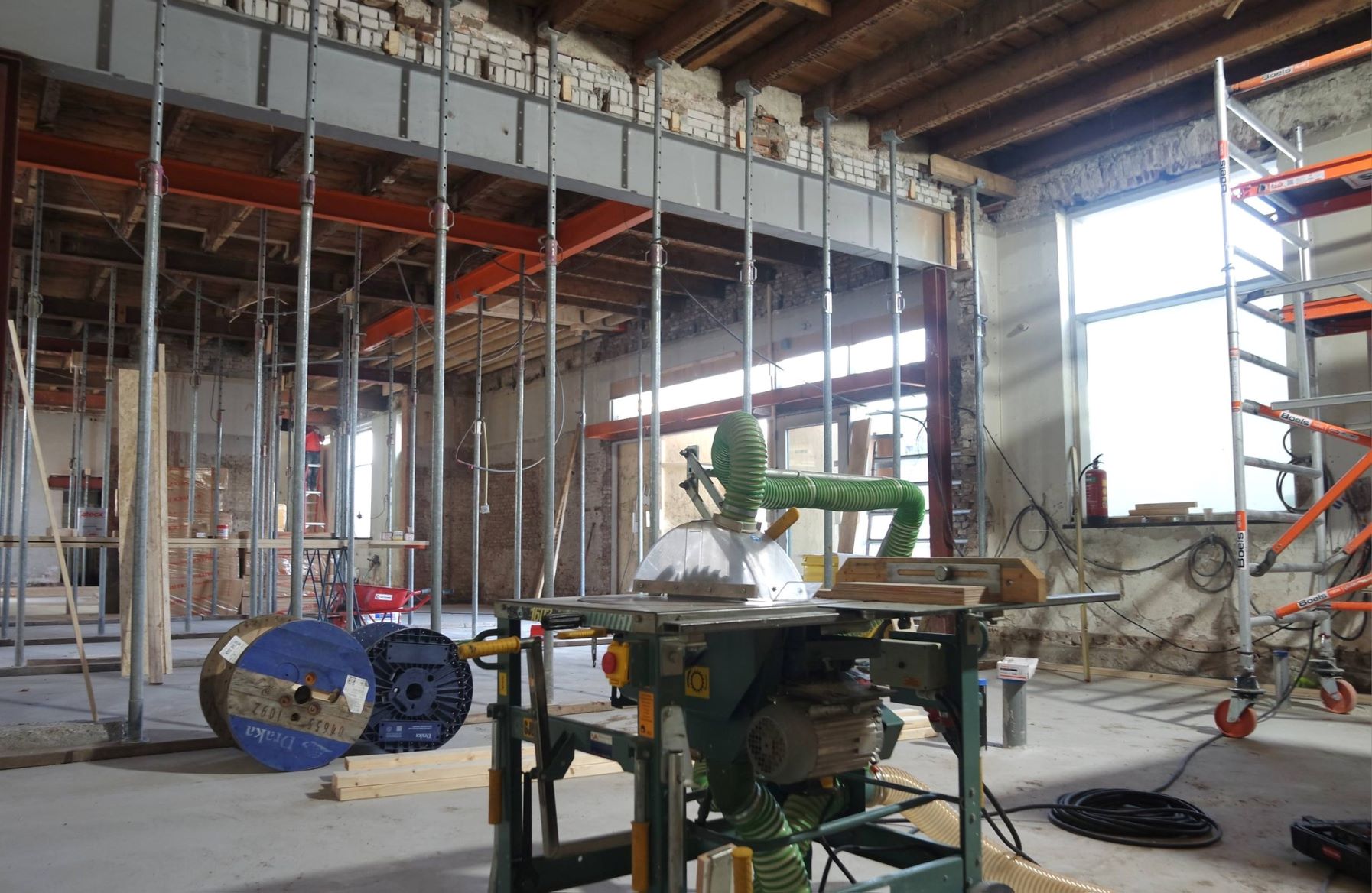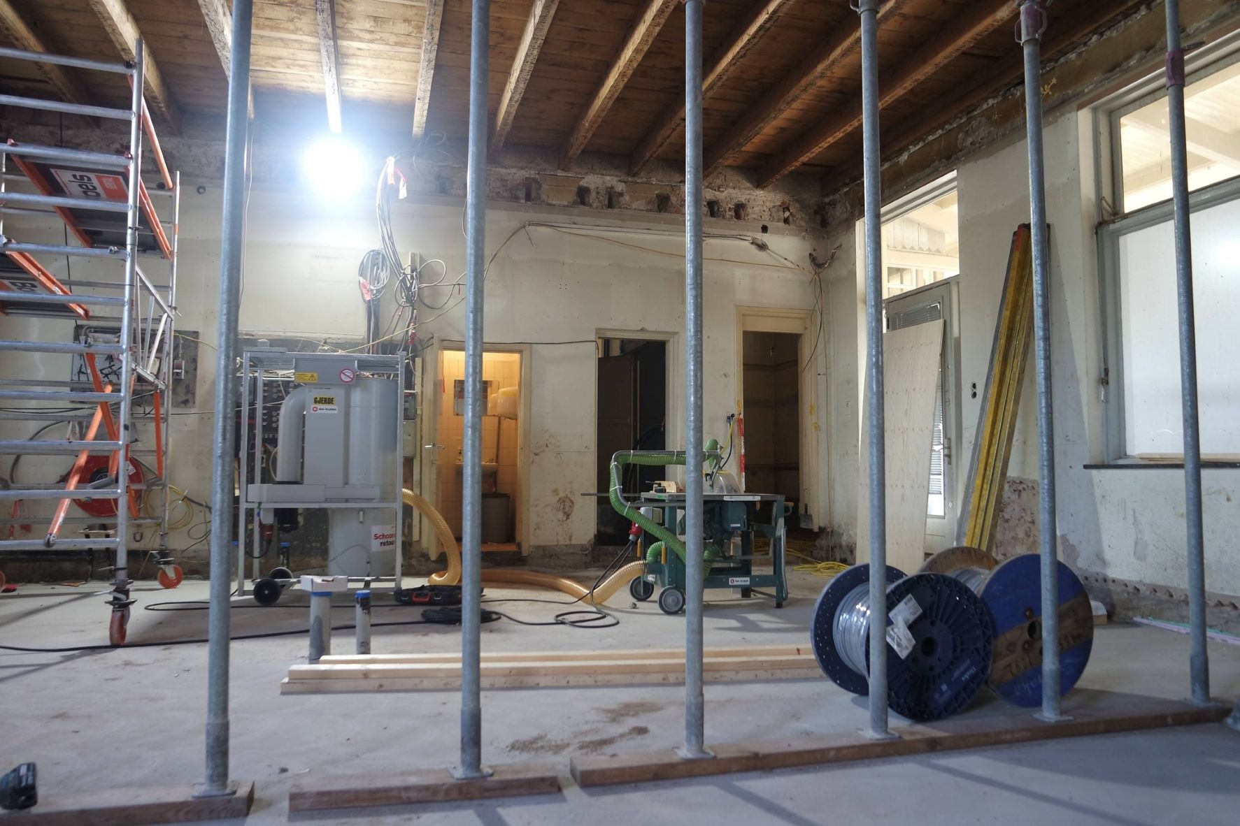 Bouwbedrijf van Wijnen is al enige tijd bezig met de renovatie van het Nijkerkse stationsgebouw. Volgens de uitvoerder van Bouwbedrijf van Wijnen loopt alles volgens schema. De betonnen vloer ligt erin, honderden m2 isolatiemateriaal is er gebracht, de houten balken gestut en ijzeren T- balken geplaatst. In de ruimte waar de elektriciteitskabels voor het spoor liggen wordt met precisie gegraven waar ze precies liggen. Er zijn geen tekeningen van. Die kabels worden op een andere aansluiting gekoppeld. Ook is het bedrijf druk bezig met het isoleren van de muren en het plafond. Foto en tekst Harry Koelewijn.