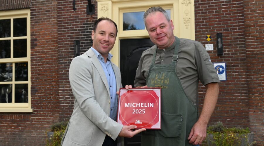 Het Sluishuys aan de Arkersluisweg in Nijkerk is wederom opgenomen in de Michelin gids. Het ornament dat bij die waardering hoort is donderdag 16 oktober door Stephan van den Nieuwendijk overhandigd aan chef-kok Erik Hendriksen. Het krijgt een mooie plek op de gevel van het monumentale pand. Hendriksen, die eerder ook eenzelfde waardering kreeg als chef-kok van de Oranjerie in Barneveld, krijgt van de inspecteur een hoge waardering. Het oordeel: Met de hand gesneden steak tartaar met een fijn zuurtje, meunière gebakken tarbot met een beurre blanc volgens de regels van de kunst en ravioli gevuld met ossenstaart: dit zijn het soort klassieke lekkernijen waar Erik Hendriksen bekend om staat. In dit warm ingerichte restaurant, lieflijk gelegen aan een oude sluis en vlak bij een haventje, krijgen herkenbare smaken de finesse die ze verdienen.” Foto en bron Kees van den Heuvel