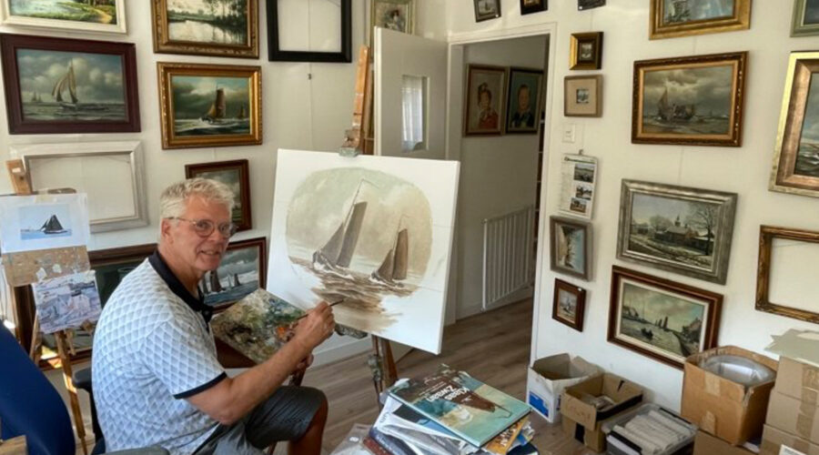 Roelof Koelewijn, de naam zegt het al, hij is een geboren en getogen Spakenburger. Dit jaar is hij 50 jaar kunstschilder. Zijn vader was visserman en in de winter klompenmaker. Hij beschilderde de klompen niet onverdienstelijk. Een ander familielid was tekenleraar. Als kind bleek ook Roelof tekentalent te bezitten. Hij schilderde ook heel wat bekende plekken in Nijkerk.