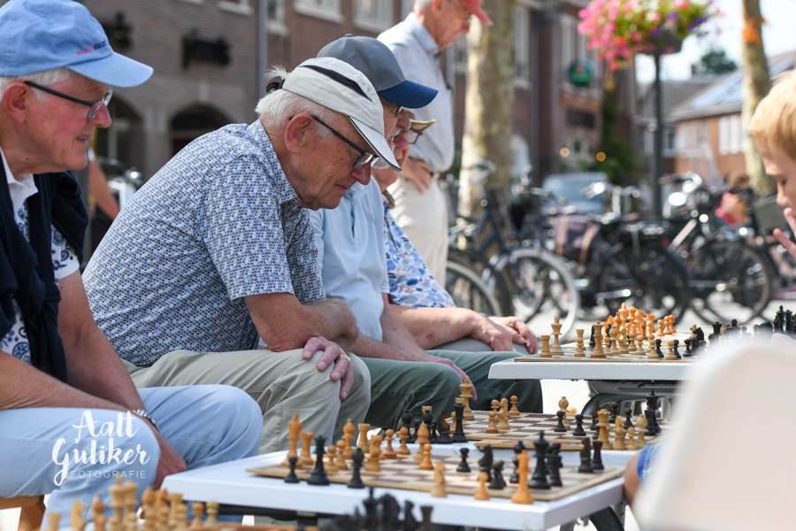 Het centrum van Nijkerk stond vandaag in het teken van het edele schaakspel. Voor de derde keer deze zomer organiseerde de Nijkerkse Schaak Club haar Schaakinstuif op het Plein. Tientallen deelnemers van nieuwsgierige beginners tot ervaren spelers namen plaats aan de schaaktafels of waagden zich aan het grote schaakbord op de grond.