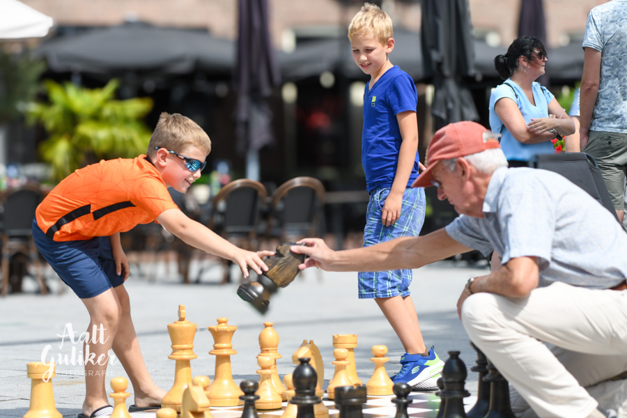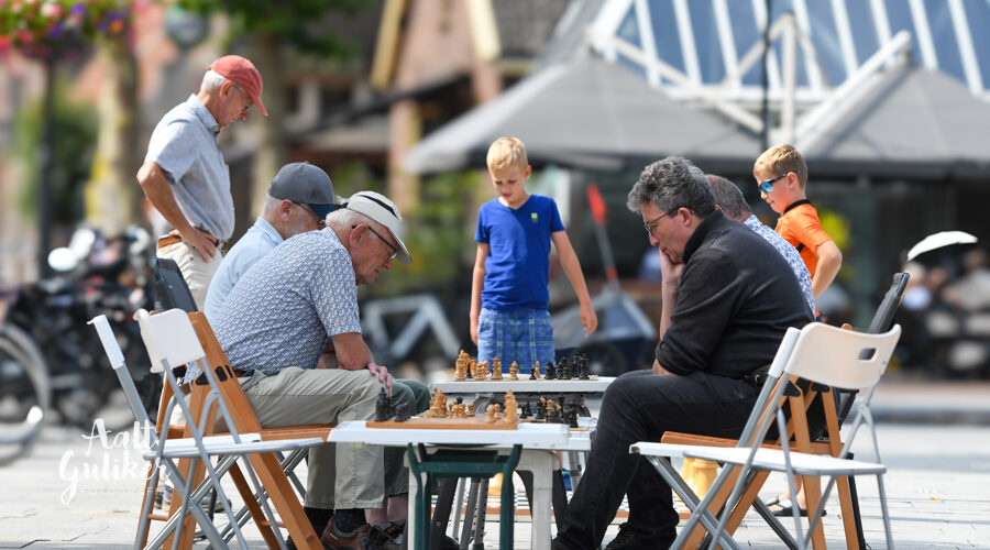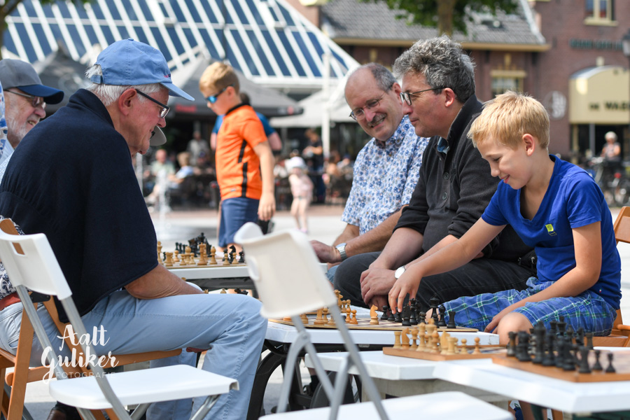 Het centrum van Nijkerk stond vandaag in het teken van het edele schaakspel. Voor de derde keer deze zomer organiseerde de Nijkerkse Schaak Club haar Schaakinstuif op het Plein. Tientallen deelnemers van nieuwsgierige beginners tot ervaren spelers namen plaats aan de schaaktafels of waagden zich aan het grote schaakbord op de grond.