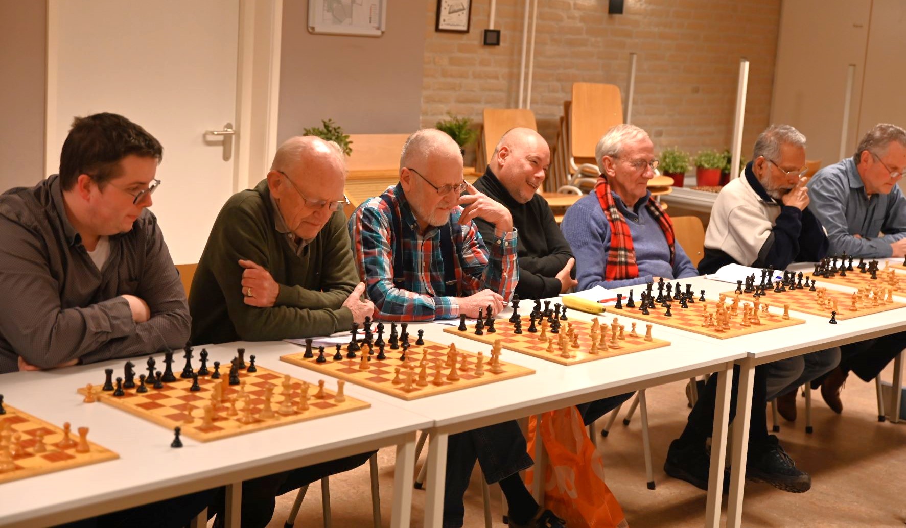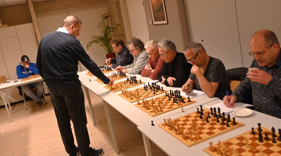 De Nijkerkse schaakclub organiseerde maandag 11 december de jaarlijkse simultaan schaakwedstrijd. Deze werd in een volle kerk De Kandelaar gehouden. De topschaker Peter Sonder, de beste van de vereniging, nam de simultaan af. 16 deelnemers hadden zich aangemeld waaronder een aantal sterke schakers (KNSB rating tussen 1800-1900). Het sterkste clublid, Peter Sonder, gaf de simultaan. Om 19.45 werd gestart. De eerste partij was rond 22 uur afgelopen en rond 24 uur de laatste. Alleen Marcel Flohr wist van te winnen en 5 deelnemers speelden remise (Wim van Schaffelaar, Nico Flohr, Thomas Meij, Ruud Flohr en Dennis Flohr). Peter won de overige 10 partijen. Met 12,5 punten uit 16 wedstrijden een voortreffelijk resultaat. Foto Kees van den Heuvel