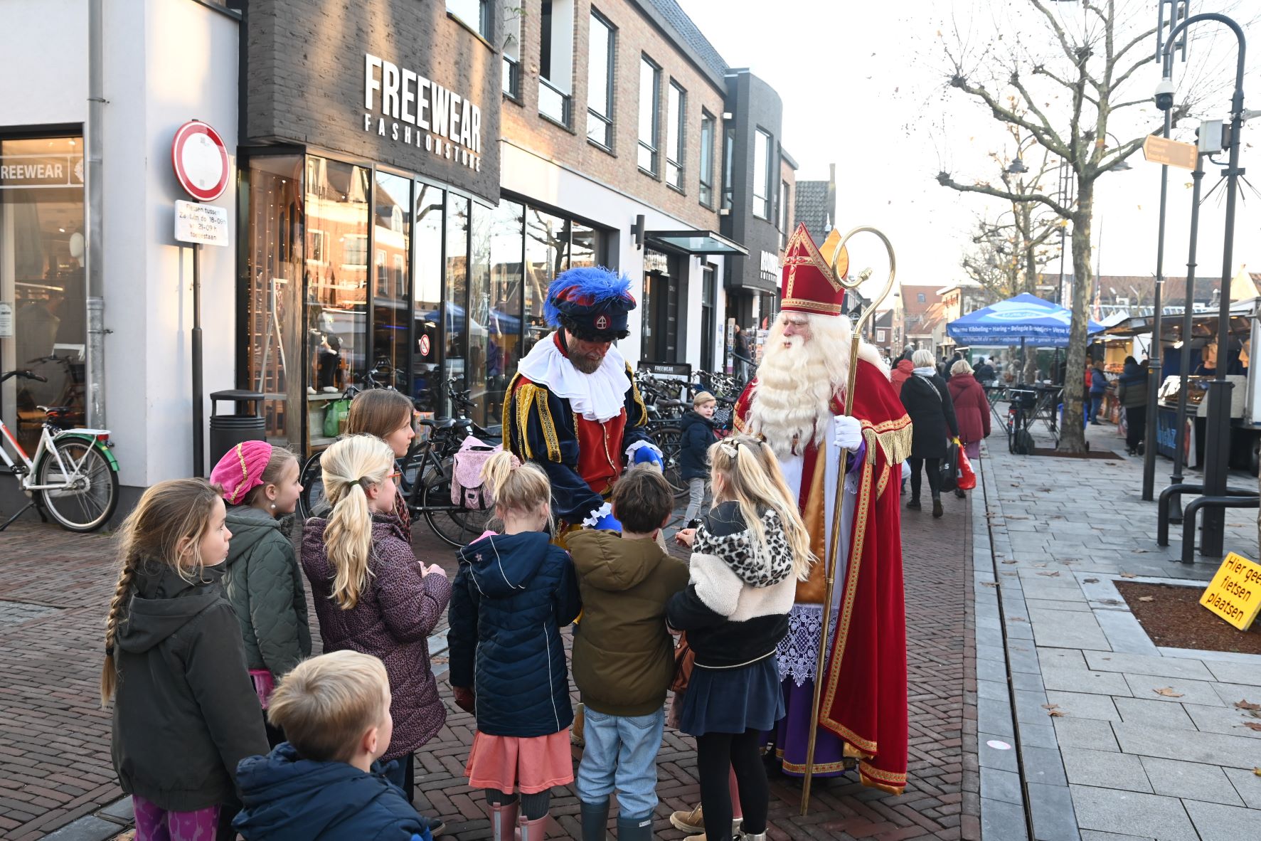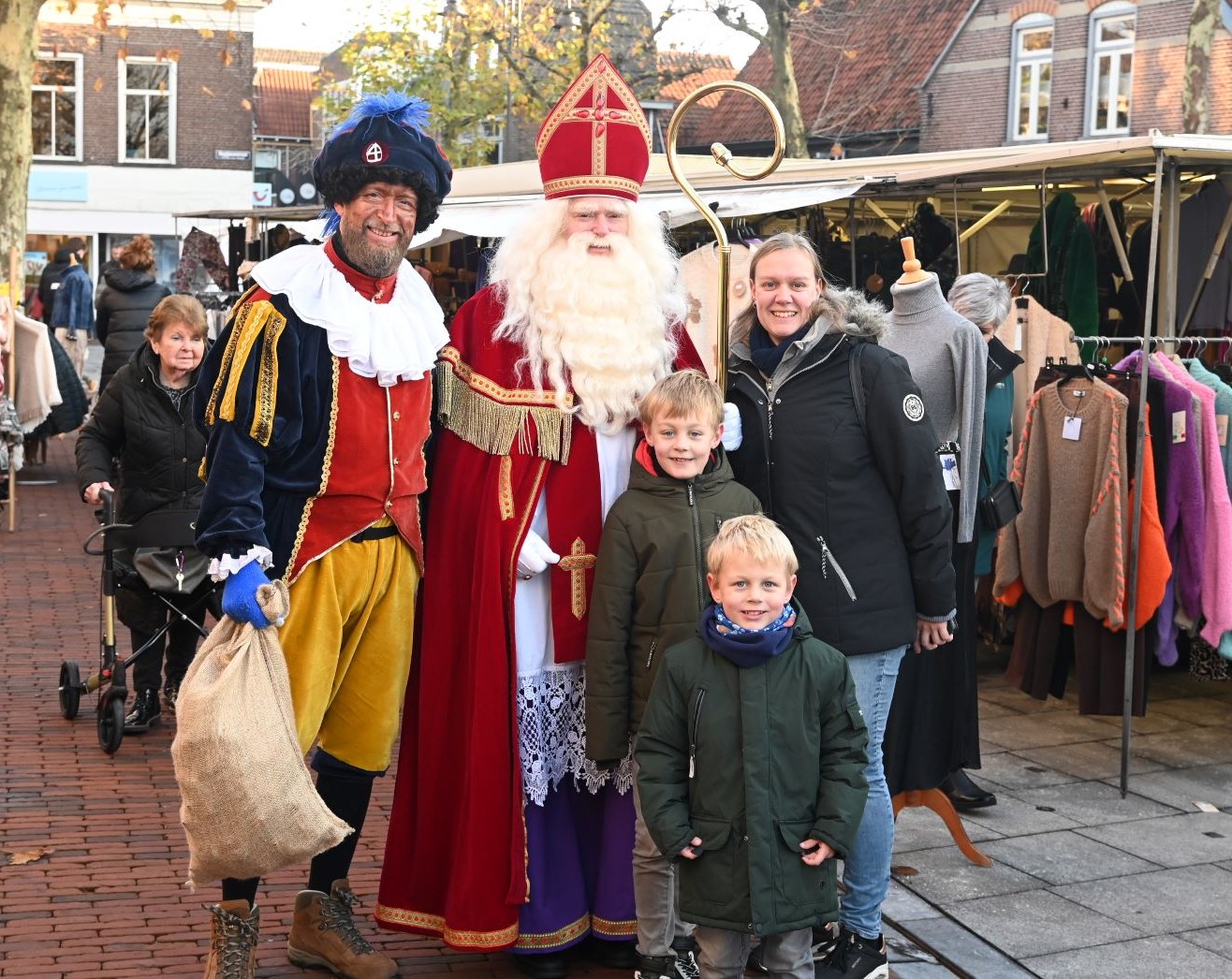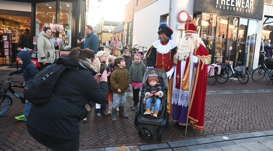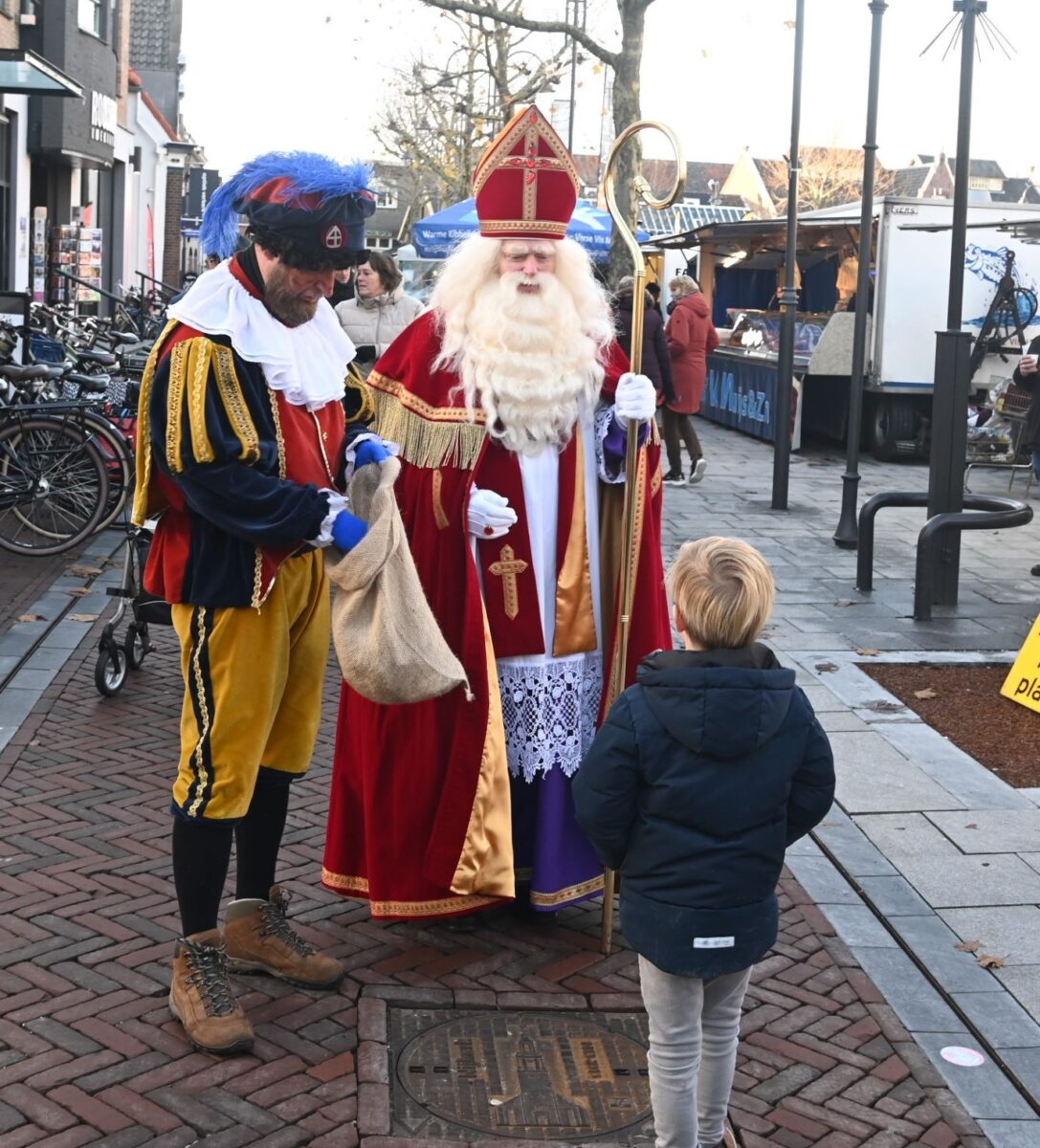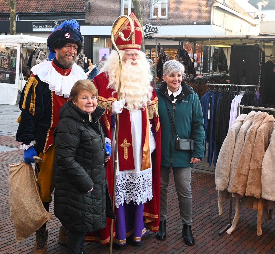 Het was frisjes, maar ontzettend gezellig. Sinterklaas en Piet wandelden vrijdag 1 december eerst over de weekmarkt van Hoevelaken en vervolgens vanaf 14.00 uur op de vrijdagmarkt in Nijkerk. Veel kinderen maar ook ouderen wilden graag op de foto. Iedereen die de Goedheiligman feliciteerde met zijn verjaardag kreeg een zak vol pepernoten. Foto Kees van den Heuvel