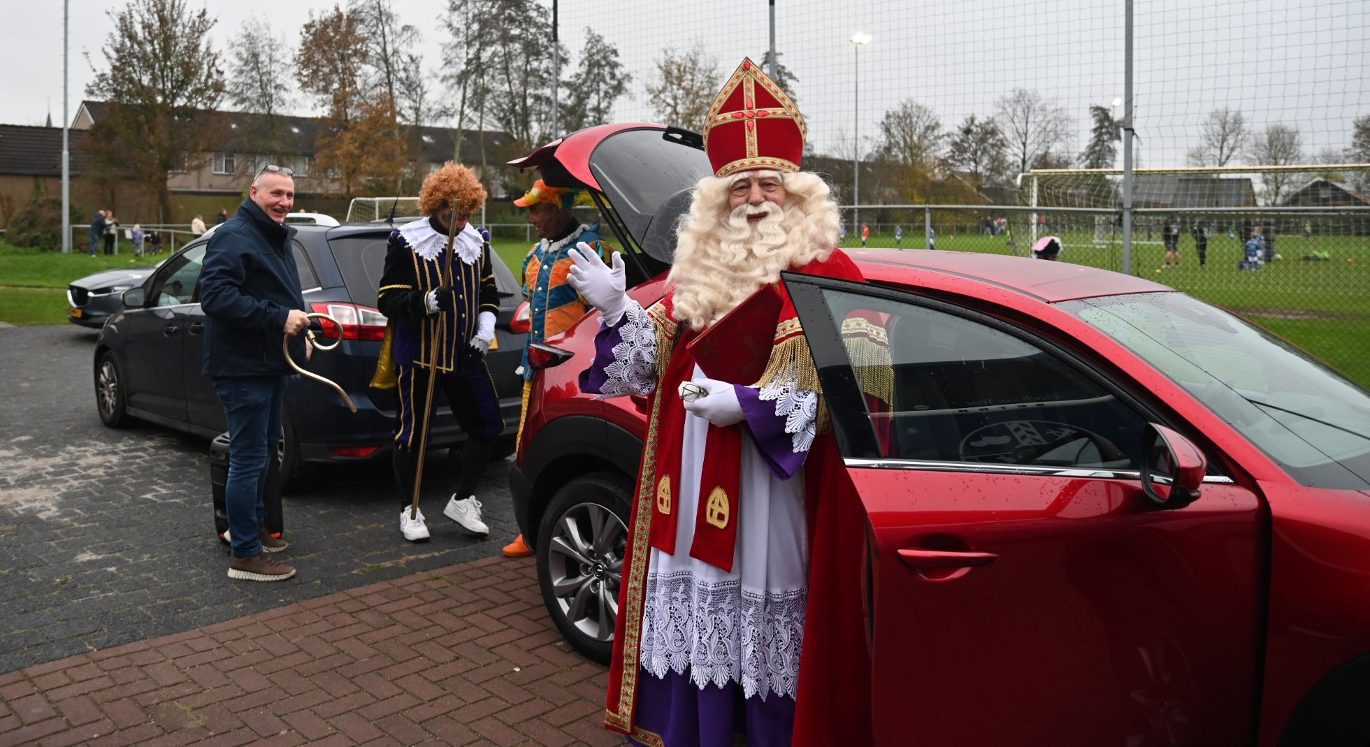 Woensdag 26 november voetbalde Sinterklaas en zijn aanhang nog met de kinderen van Veensche Boys op het voetbalveld. En zowaar was hij er zaterdag 29 november weer. De Goedheiligman kon echter maar kort bij zijn favoriete voetbalclub wezen, want de plicht roept. Er is sprake van een vol programma, te beginnen bij melkfabriek Arla. Foto Kees van den Heuvel