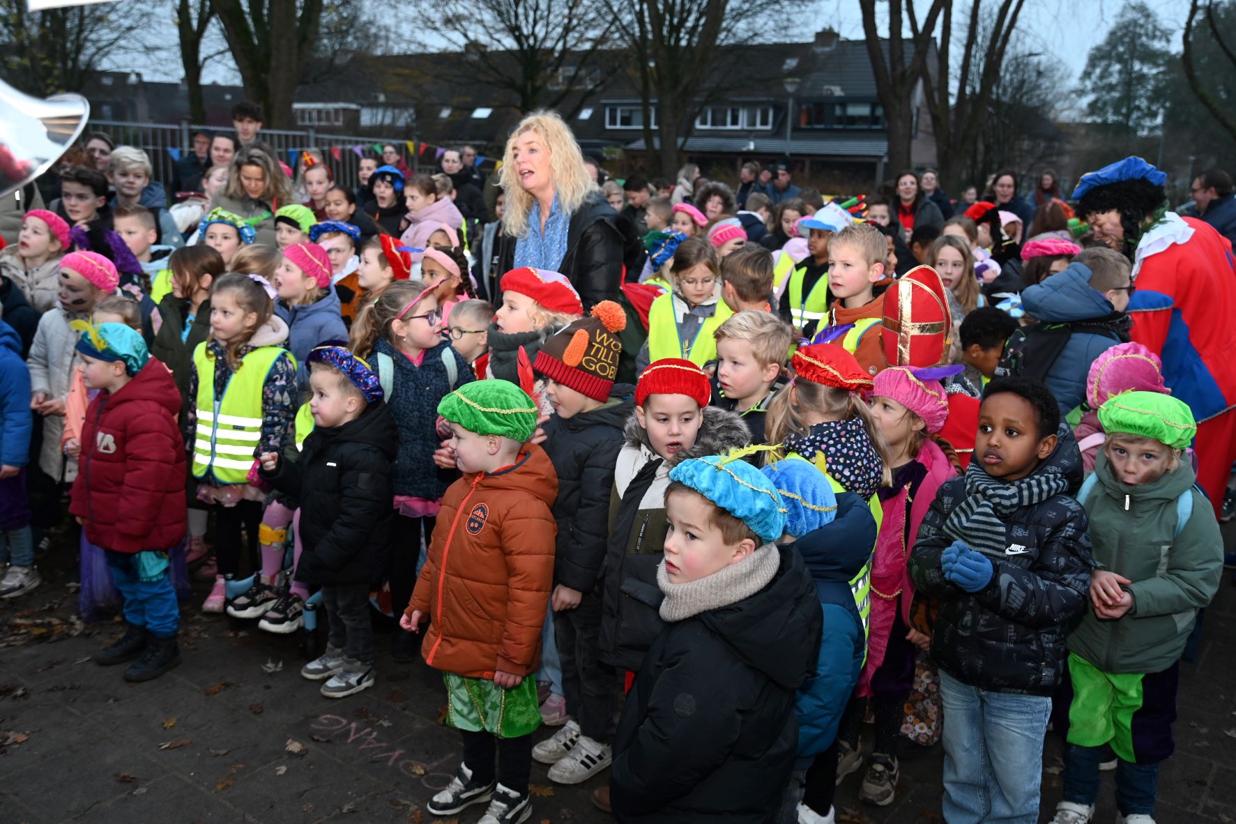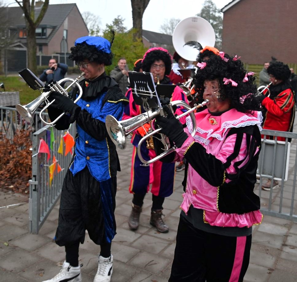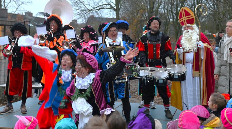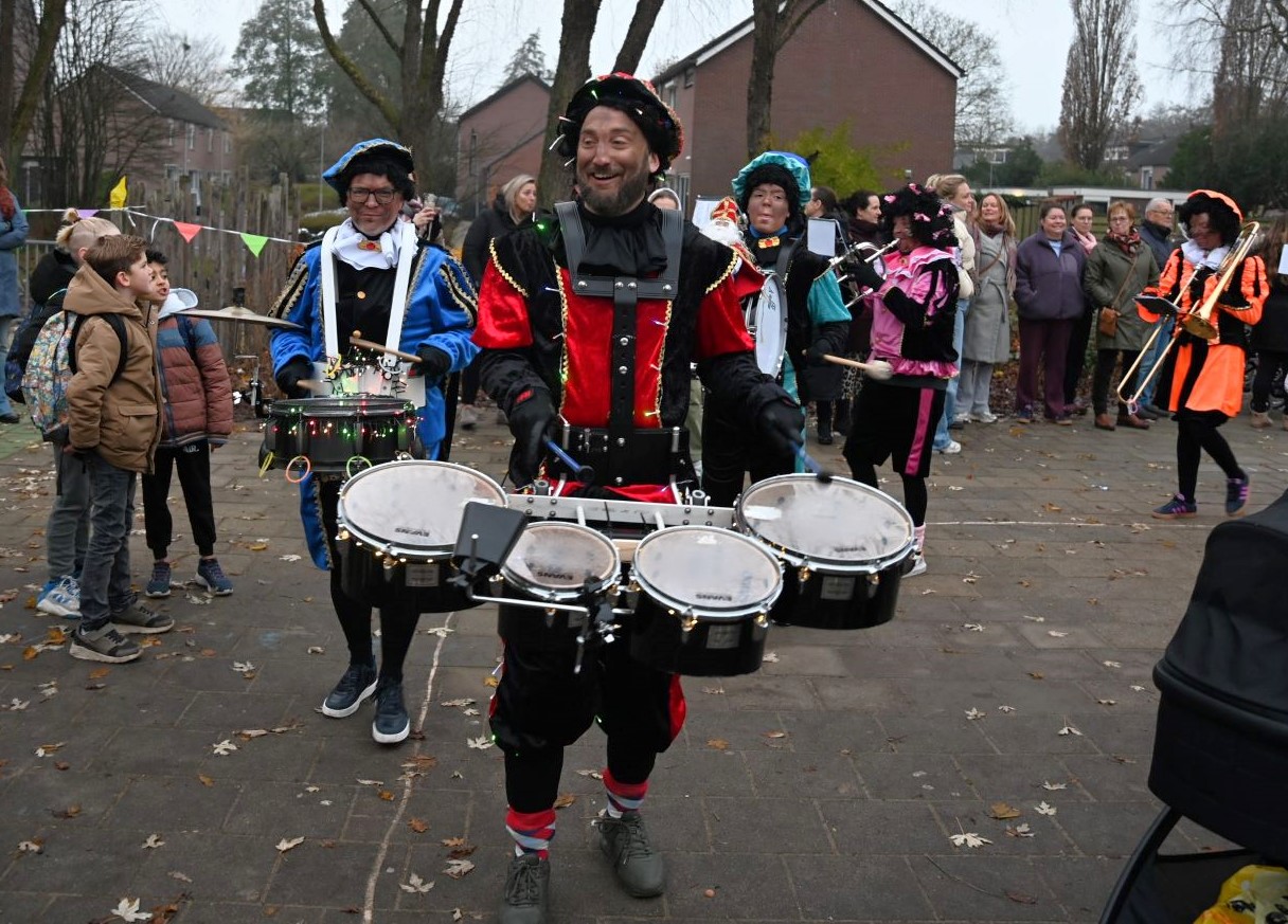 Sinterklaas heeft vrijdag 5 december voor de eerste keer in zijn leven de nieuwe Nijkerkse basisschool De IJsvogel bezocht. Daar werd hij naast het nieuwe schoolgebouw verwelkomd door directeur Marije Dekker. Hij nam niet alleen veel Pieten mee, maar ook een muzikale Pietjesband. Dat bracht niet alleen Sinterklaasliedjes ten gehore, maar ook de IJsvogeltjesdans. Foto Kees van den Heuvel