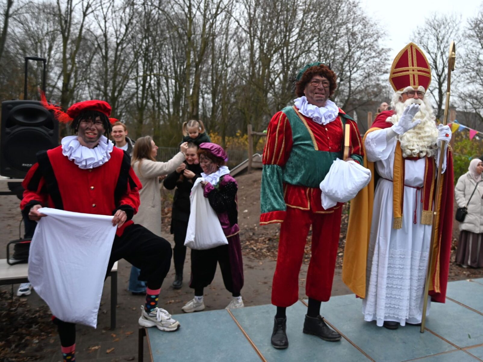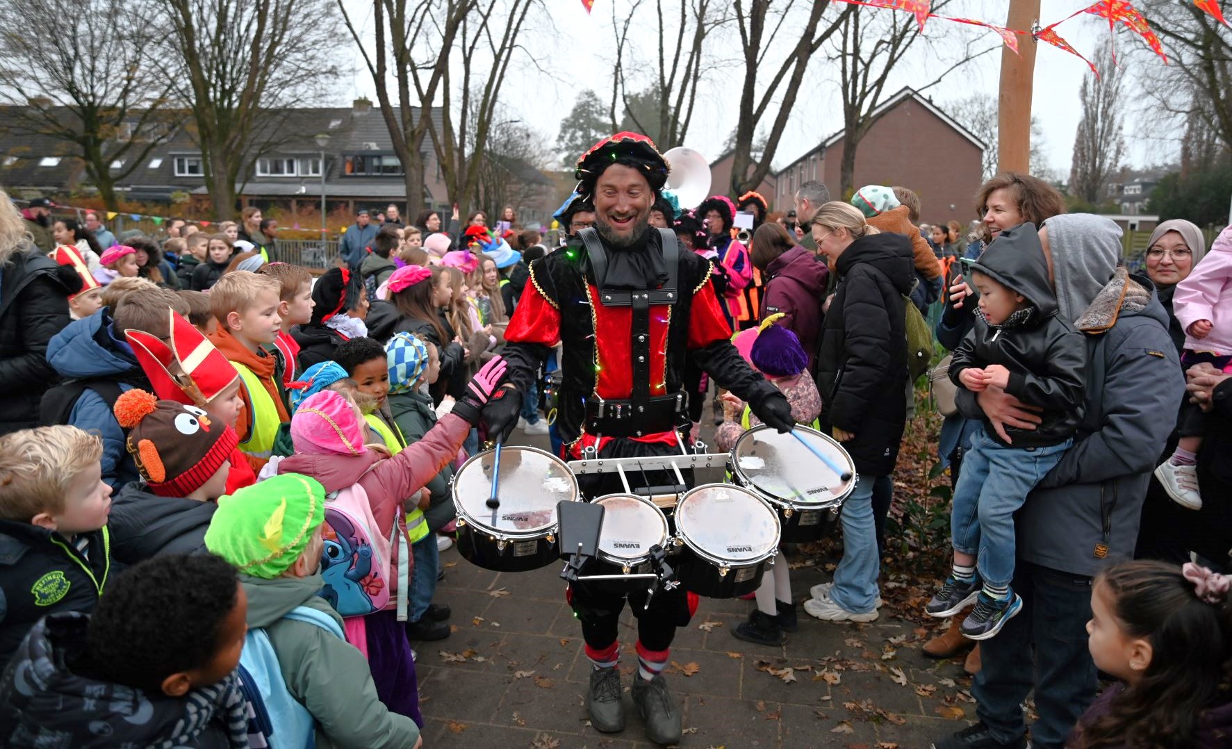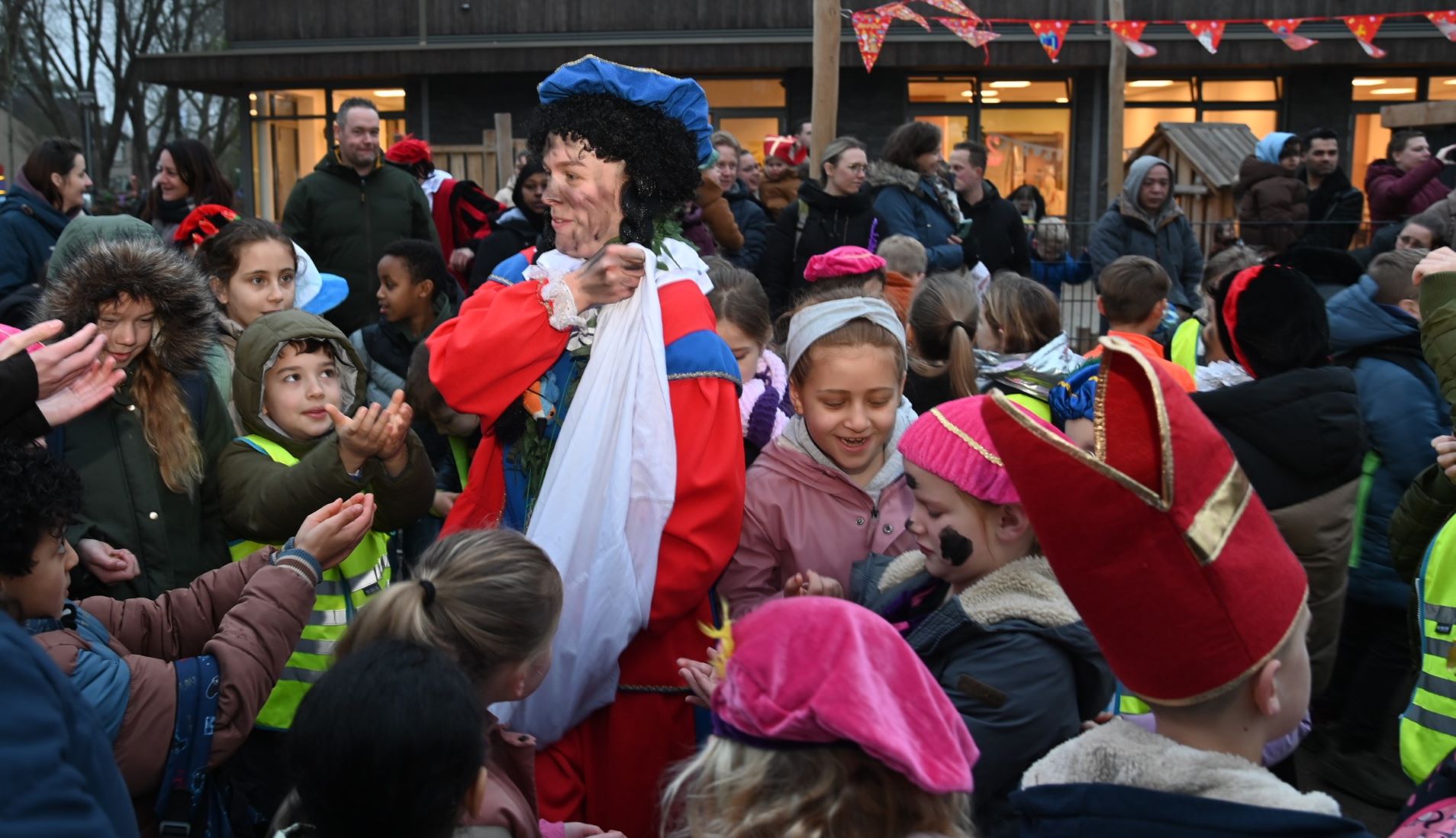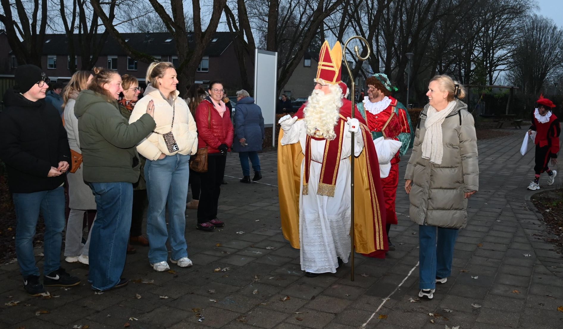 Sinterklaas heeft vrijdag 5 december voor de eerste keer in zijn leven de nieuwe Nijkerkse basisschool De IJsvogel bezocht. Daar werd hij naast het nieuwe schoolgebouw verwelkomd door directeur Marije Dekker. Hij nam niet alleen veel Pieten mee, maar ook een muzikale Pietjesband. Dat bracht niet alleen Sinterklaasliedjes ten gehore, maar ook de IJsvogeltjesdans. Foto Kees van den Heuvel