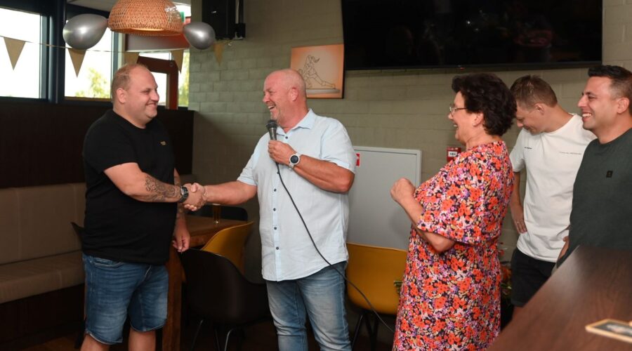 Zaterdagavond 31 augustus heeft de formele sleuteloverdracht plaatsgevonden van sportcafe Corlaer in sporthal Corlaer. Dat gebeurde bij het afscheid van het kantine-echtpaar Jaap en Diny de Vries het beheer van sporthal Corlaer zestien jaar voor hun rekening hebben genomen. De zaak is overgenomen door Marc van den Akker die al sportcafé Watergoor onder zijn hoede heeft. Bertine wordt de nieuwe gastvrouw bij sportcafé Corlaer. Jaap de Vries overhandigde de sleutel aan Marc van den Akker en dankte iedereen voor zijn of haar grote betrokkenheid. Foto Kees van den Heuvel