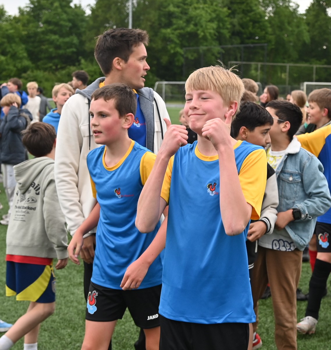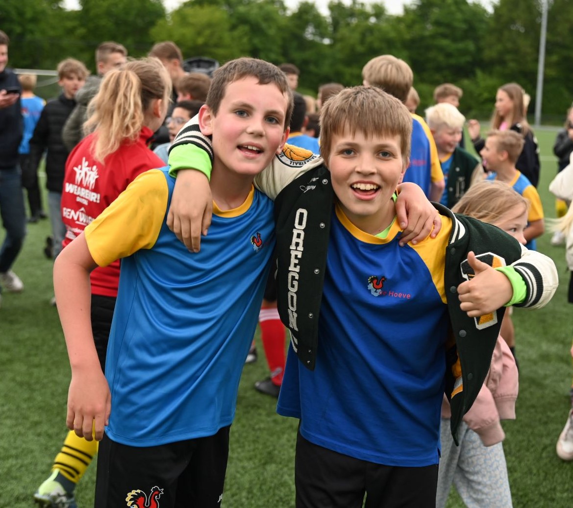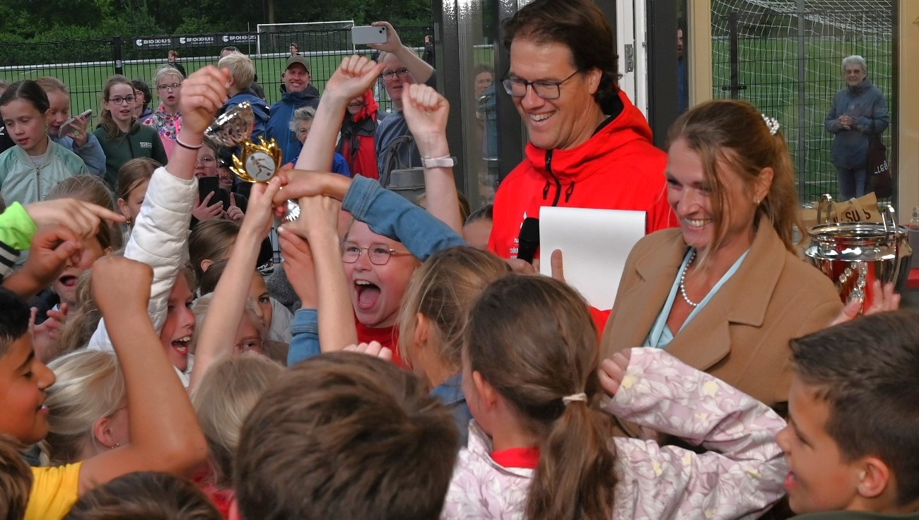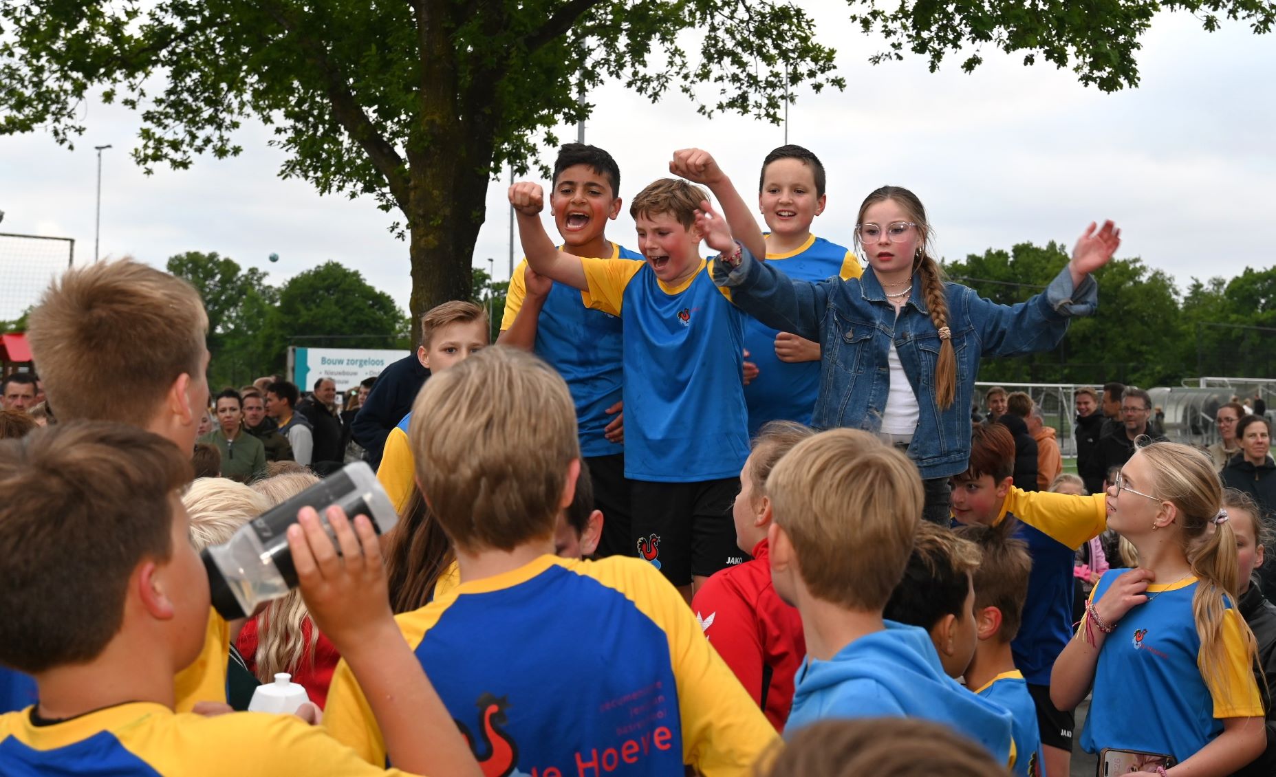 Op de velden van sc Hoevelaken zijn vrijdagavond 16 mei finales gespeeld om het kampioenschap van het schoolvoetbal Hoevelaken, de vijftigste editie. Het leverde een aantal uitermate spannende finales op. Het laatste duel ging tussen de groepen 8 van de jongens van het Blokhuus en de Hoeve en die eindigde in een overwinning voor de mannen van De Hoeve. Het werd 2-0. Bij de groepen 7 tussen de meisjes van Willem Farel en de Hoeve was er een overwinning voor Willem Farel. Bij de groepen 7 van de jongens won De Hoeve van de Schimmelpenninck van der Oye school. Verder was er nog een finale tussen de groepen 8 van de meisjes. Het Blokhuus werd hier de winnaar. Die wonnen van de Spreng. De winnaars kregen de bekers overhandigd door burgemeester Tinet de Jonge die bijna als een popster werd behandeld. Ze moest regelmatig op de foto. In verband met vijftig jaar schoolvoetbal in Hoevelaken was een speciale bidon gemaakt en langs de gevel van het clubgebouw hing een fototentoonstelling. Foto en Kees van den Heuvel
