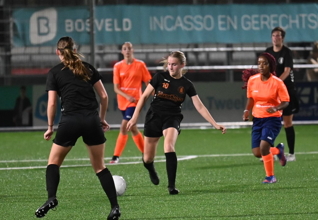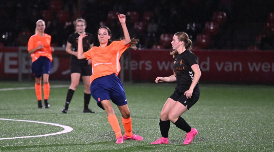 Op het hoofdveld van Sparta Nijkerk is het NL LD meidenelftal van ProTalents woensdagavond 11 oktober de strijd aangegaan met Sparta Nijkerk VR2. De wedstrijd was mede op initiatief van Johanna de Meijer uit Nijkerk. Haar eigen dochter Julianne speelt in het NL LD meidenelftal en dus trok Johanna de stoute schoenen aan en initieerde ze een wedstrijd tegen de Nijkerkse club. Helaas voor de damens van ProTalents verloren ze dik van Sparta Nijkerk. Het NL LD meidenelftal bestaat uit meiden die gescout zijn door Pro Talents. Deze stichting zet zich in voor meiden en jongens met een leerbeperking maar met talent voor voetbal of een andere sport. Julianne de Meijer (15) en Irissonna Kirnon (18) uit Nijkerk maken allebei deel uit van dit team. Ze zitten beiden op het Accent Praktijkonderwijs in Nijkerk. ,,Vanuit alle praktijkscholen in Nederland werden een tijd geleden voetbaltoernooien georganiseerd in Utrecht, op het dak van de Ikea. Daar waren ook scouts van Pro Talents aanwezig en zo zijn de meiden in dit team terecht gekomen”, legt moeder Johanna uit. Julianne en Irissonna vormen samen met andere meiden uit het hele land een nationaal elftal. Dat maakt wekelijks trainen wel lastig. ,,We trainen alleen voorafgaand aan een wedstrijd”, vertelt Irissonna. ,,Die wedstrijden zijn altijd op woensdag, we krijgen dan vrij van school. Rond 16.00 uur komen we bij elkaar en dan begint de training. Soms is het best even wennen, omdat er dan weer nieuwe meiden bij zijn gekomen. Maar we hebben ruim de tijd om elkaar te leren kennen en in te spelen.” ,,Na de training gaan we gezellig met elkaar eten”, vult Julianne aan. ,,Dan kunnen we even tot rust komen. Daarna begint het echte werk.” Deze wedstrijden tegen lokale clubs vinden één keer per maand plaats, meestal in steden rondom Utrecht. ,,In Nijkerk is ooit eens eerder zo’n wedstrijd gespeeld, maar wij vonden het wel weer tijd”, lacht Johanna. Voor Irissonna was de wedstrijd van 11 oktober extra spannend. Zij speelt zelf bij Sparta Nijkerk VR2 en moet het dus opnemen tegen haar eigen team. ,,Als we verliezen, moet ik dat heel lang aanhoren. Maar ik ken het team goed, dus ik kan mooi de tactiekbespreking leiden”, grapte ze. Foto’s Kees van den Heuvel