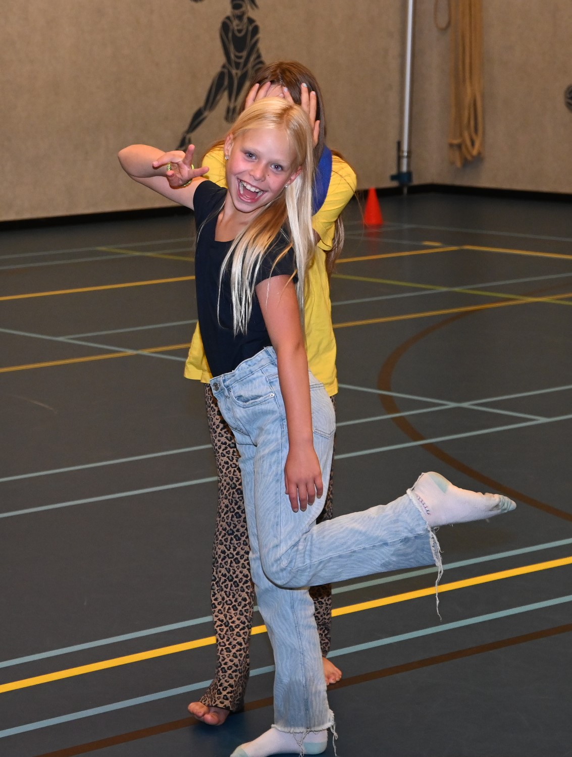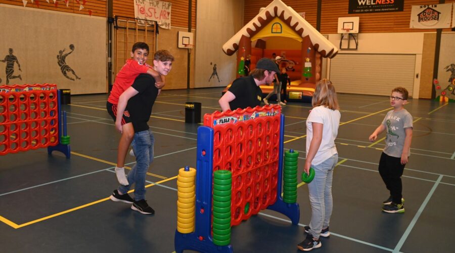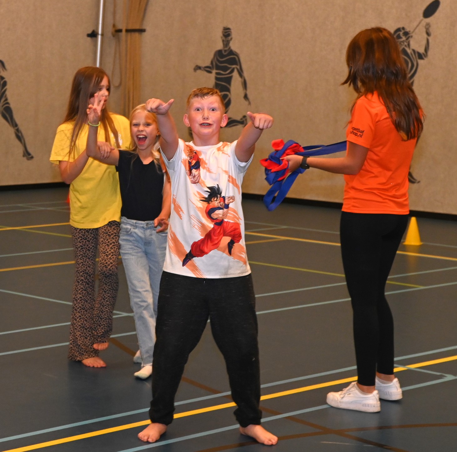 Nijkerk Sportief en Gezond en jongerencentrum Blits in Hoevelaken organiseerden donderdagmiddag 21 september een spellenmiddag in sporthal De Slag in Hoevelaken. Buiten regende het toch maar en binnen was het lekker droog en van alles te doen, zoals jumpen op een luchtkussen, blik gooien, flessenvoetbal, puntendoek en nog veel meer. Foto Kees van den Heuvel