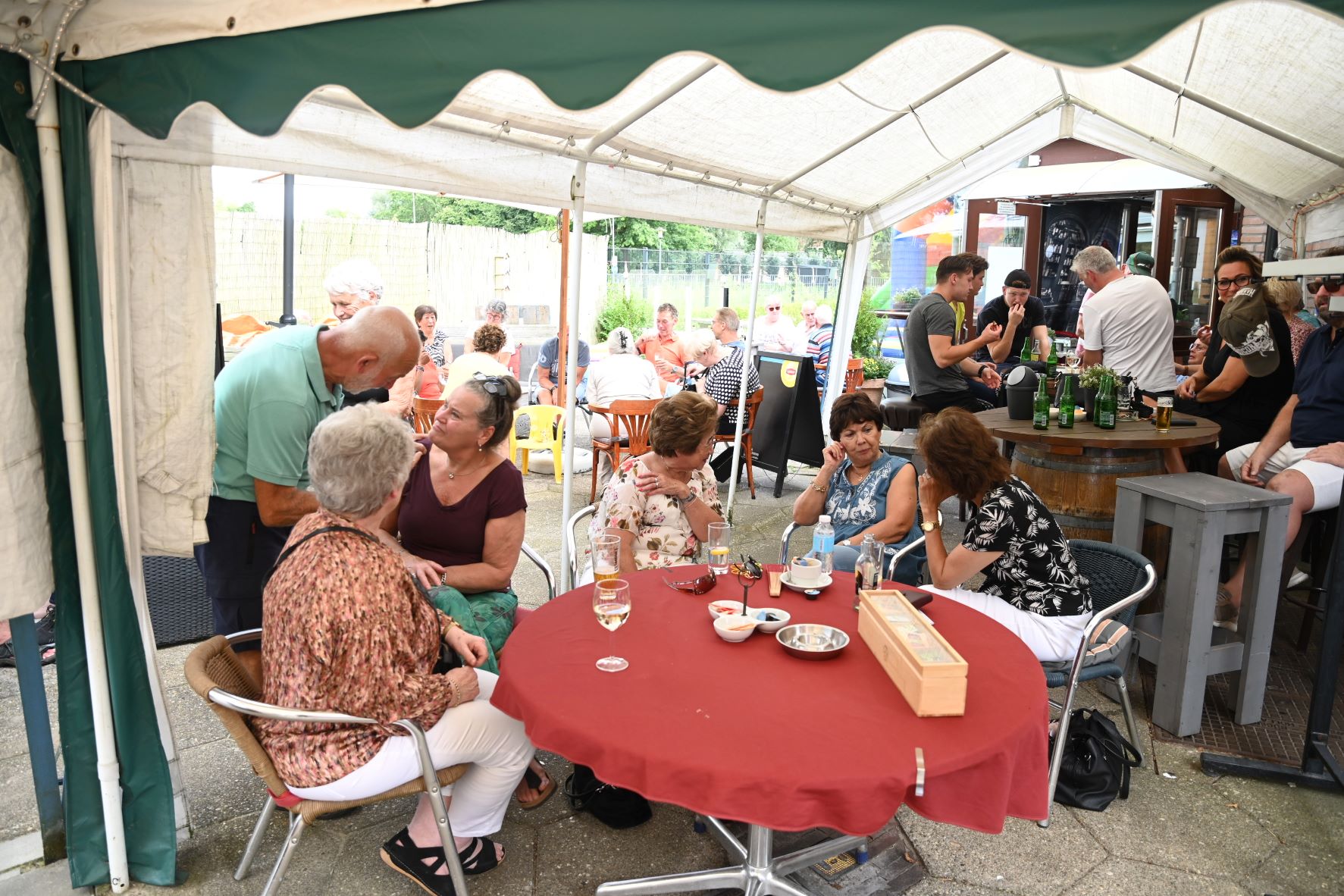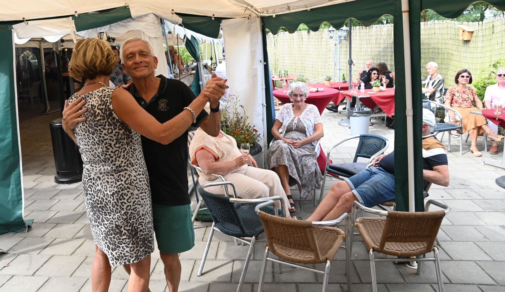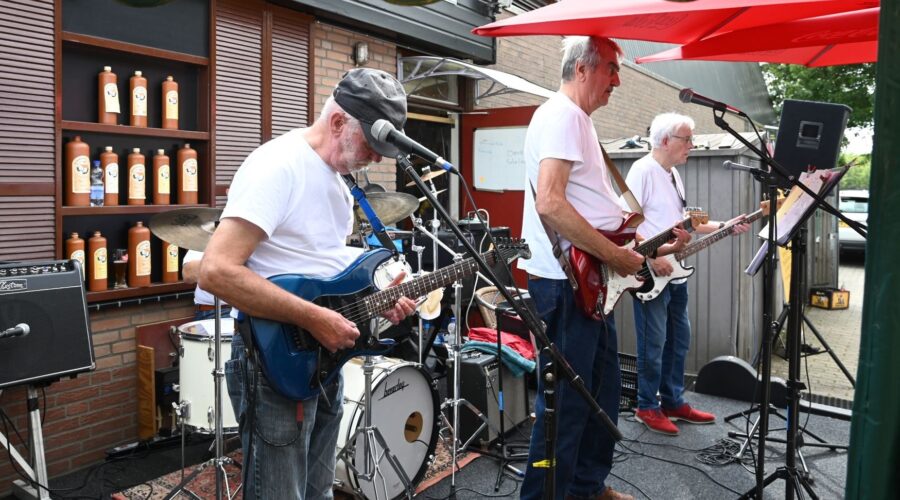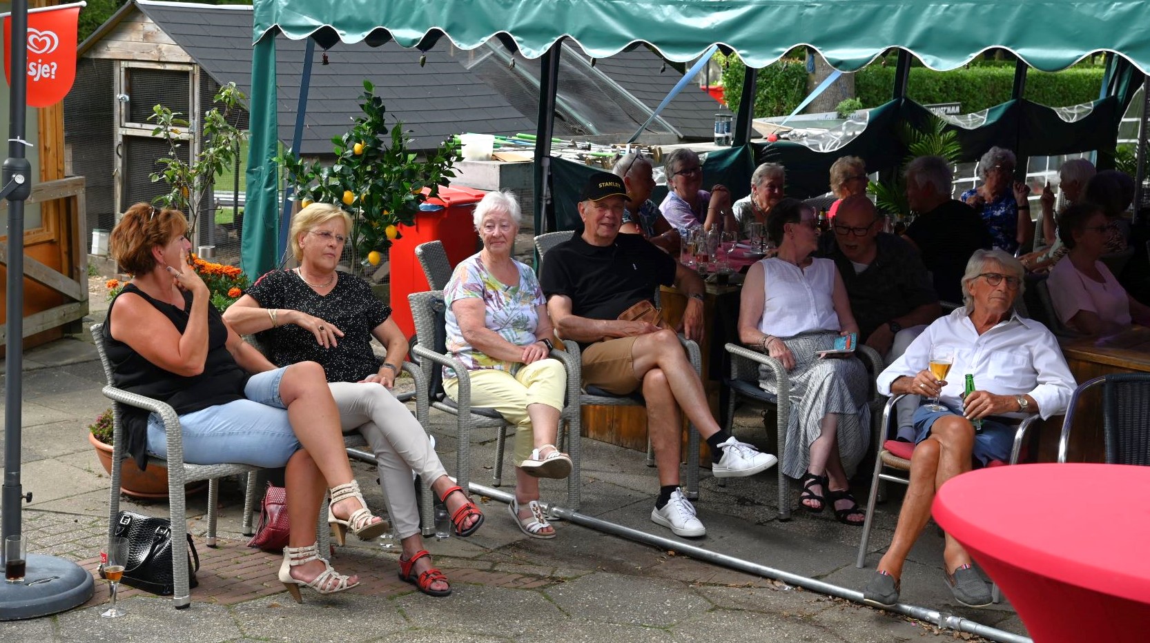 Het terras van Sportcafé De Slag in Hoevelaken was zondagmiddag 20 augustus helemaal vol voor een concert van de band Sixties Generation. Het concert was een vervolg op het ‘Summer of Love’ festival dat in 2017 werd gehouden bij het sportcafé van Hans Root. Velen waagden een dansje. Voor de kinderen was een springkussen neergezet. Foto Kees van den Heuvel