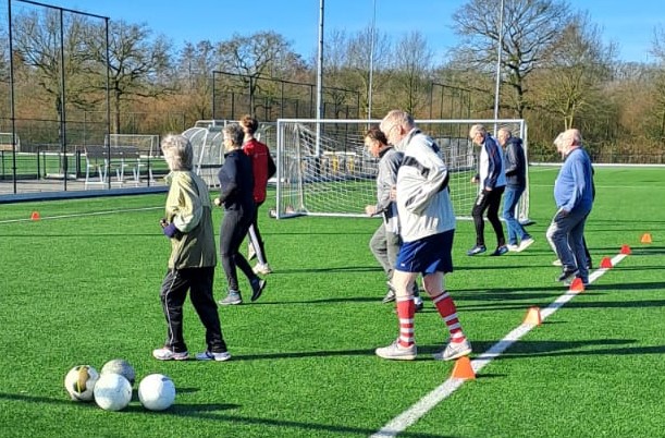 Maandag 2 maart vond bij SC Hoevelaken de allereerste pilottraining van Walking Football plaats. Onder leiding van Joep Timmerman werd er door negen personen fanatiek gepasst, vrijgelopen en gescoord — zonder te rennen, maar mét volop beleving. Eentje moest echter al na een kwartier afhaken met een blessure. Dit was de eerste van vier lessen. De lessen zijn toegankelijk voor mensen ouder dan 55 jaar. Plezier en beweging staan voorop. Er werd afgesloten met koffie of thee. Foto Kees van den Heuvel en Wim van Vliet