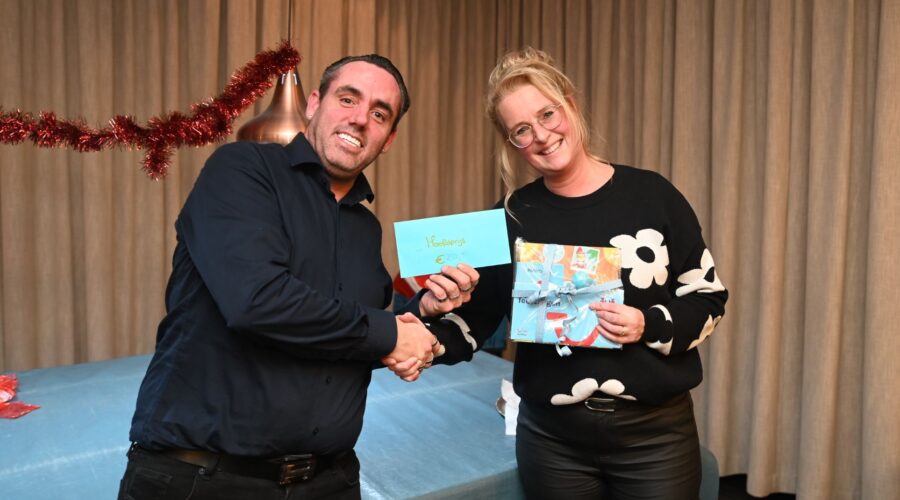 Het was woensdag 18 december ontzettend druk tijdens de laatste bingo van de Oranjevereniging Nijkerk in 2024. Tijdens deze kerstbingo waren er extra veel prijzen, zowel tijdens de bingo als tijdens de verloting. De hoofdprijs was een waarde-cheque van reisorganisatie TUI uit Nijkerk ter waarde van 250 euro plus 250 euro zakgeld. Die hoofdprijs ging naar Janneke. Ook werden de vrijwilligers bedankt die altijd achter de bar staan van de Unie van Vrijwilligers. Foto Kees van den Heuvel