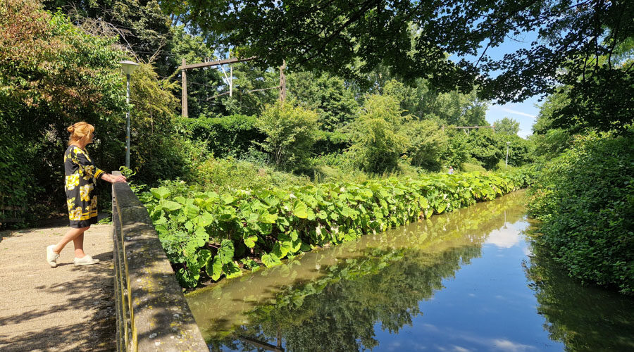 We gaan rechts voor het station langs, steken het spoor oven en gaan direct naar rechts, over de parkeerplaats. Nel en ik belanden meteen in een oase van groen en volgen het pad achter de huizen en parallel aan het spoor. Het pad meandert met bruggetjes over de Breede Beek en de enorme bladeren van het groot hoefblad geeft het een sprookjesachtige aanblik. Je hebt amper in de gaten dat je langs een spoor loopt. Aan het einde van het pad steken we rechts het spoor over en gaan direct weer rechts, een smal groen paadje en langs de grote speeltuin achter de ‘Van Oldenbarneveldt-flats’. Ik maak Nel attent op het ruisen van de enorme populieren die hier staan. Ik woon hier vlakbij en het is zo rustgevend. „Dit heb ik nog nooit zo gehoord”, zegt Nel verwonderd. „Wat een mooi geluid!” Via de Van Goltsteinstraat gaan we via weer een groen paadje, naar de begraafplaats. Normaliter loopt Nel hier rechtdoor, maar nu slaan we af naar rechts en gaan de begraafplaats op. Ik wil haar namelijk een mooi stadsgezicht laten zien van de toren en de rode daken van de huizen van de Van Rensselaerstraat. „Beschermd stadsgezicht waardig”, zeg ik, zachtjes, want je loopt wel over een begraafplaats. Bij de Frieswijkstraat gaan we rechtsaf en genieten we van de mooie tuinen waar de Annabelle hortensia’s bijna bloeien. Dan komen we bij de fontein, lijkend op een uienbol. We steken schuin naar rechts over naar het Stadspark en genieten, leunend over de reling van de robuuste brug, van het groen en de rust.