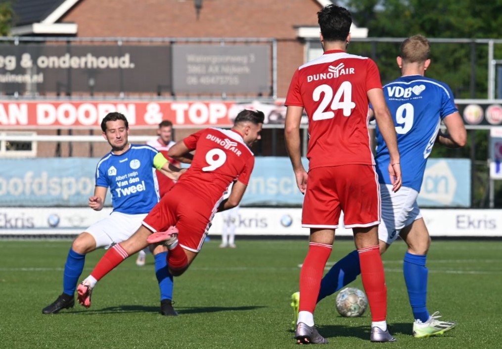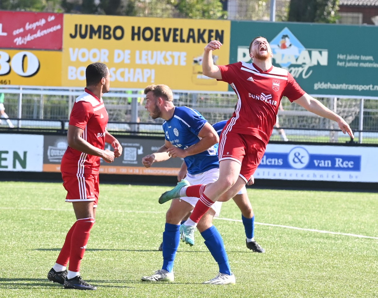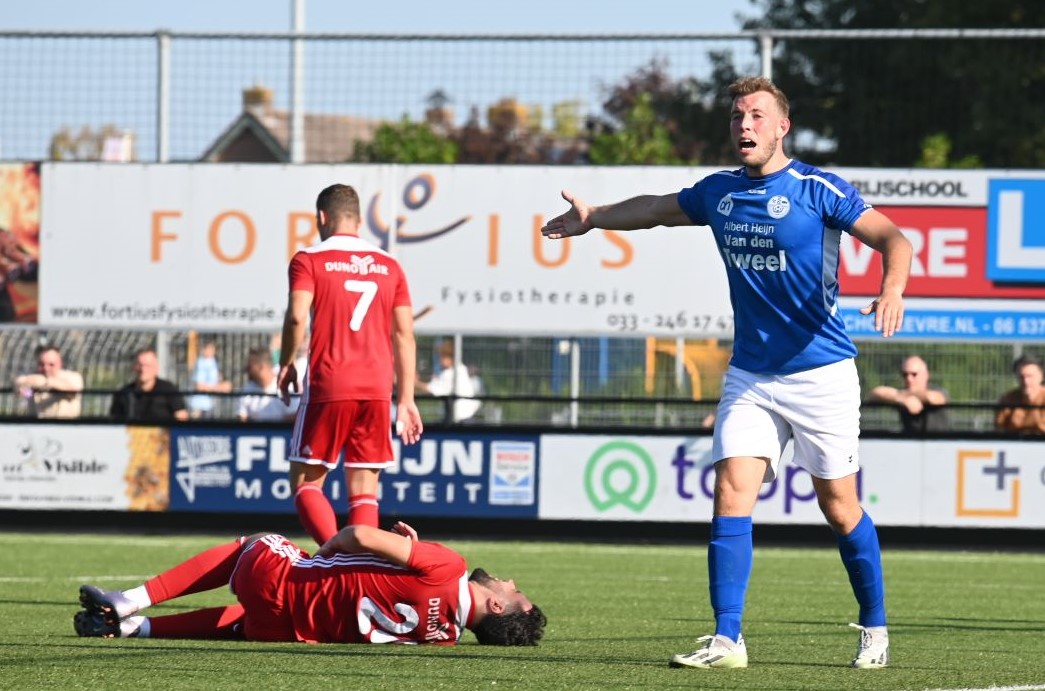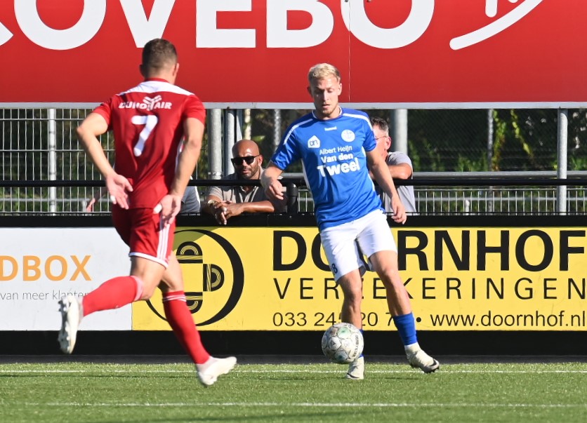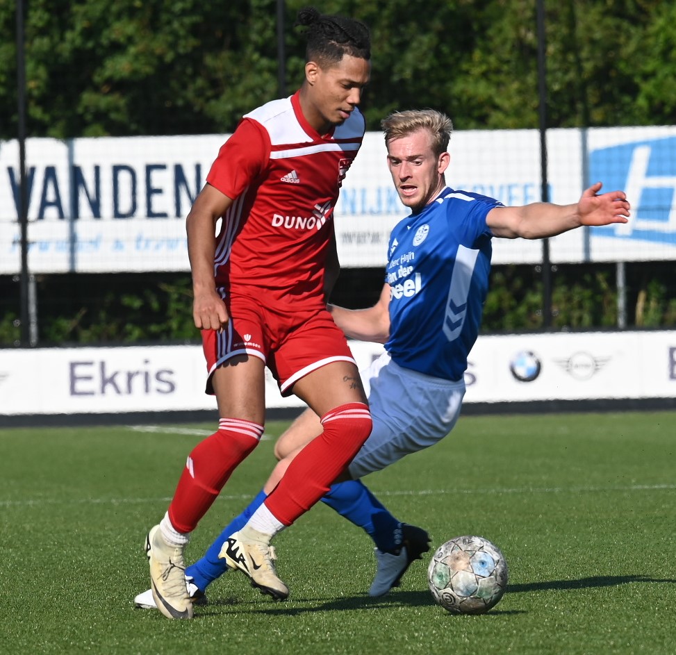 Veensche boys kan zich een betere rentree in de eerste klasse wensen dan in het eerste competitieduel tegen Duno Doorwerth. Op het eigen complex aan de Nieuwe Kerkstraat verloor Veensche Boys met 0-2. Het was te merken dat de kampioen uit de tweede klasse het moest stellen zonder Tom van Donselaar, wiens dubbelgeklapte enkel uit de bekerwedstrijd tegen NSC was gaan opspelen. Daardoor leek Veensche Boys een flinke veer te moeten laten in de eerste helft. Er waren kansen voor CornĂ© Parol en Jurre van den Brom maar die verdwenen in de vergetelheid. Veensche Boys claimde nog minstens twee penalty’s maar de arbiter van dienst wilde hiervan niets weten. De tegenstander weerde zich sterk, combineerde goed en was bij tijd en wijle knap gevaarlijk. Gelukkig stond keeper Wessel Bosman zijn mannetje. Hij werd niet voor niets uitgeroepen tot Man van de Wedstrijd. Toch kon hij in de tweede minuut van de tweede helft niet voorkomen dat Duno alsnog wist te scoren. Met een boogje werkte Bart Schiks de bal in het net. Het duurde tot ongeveer halverwege de tweede helft dat de wedstrijd kantelde. Dat was direct na het inbrengen van Levi Haringsma en Steven van Zanten, waardoor er veel meer temperament in het spel kwam. Ternauwernood wist Duno aan een gelijkmaker te ontsnappen. Doordat Veensche Boys alles op alles zette om de 1-1 op het scorebord te zetten, werd achterin ruimte weggegeven en even voor blessuretijd werd alsnog de 0-2 op het scorebord gezet via Cengizhan Genc. Foto Kees van den Heuvel