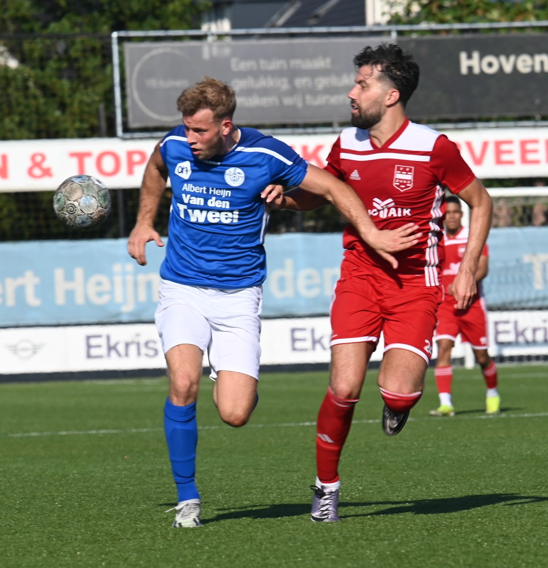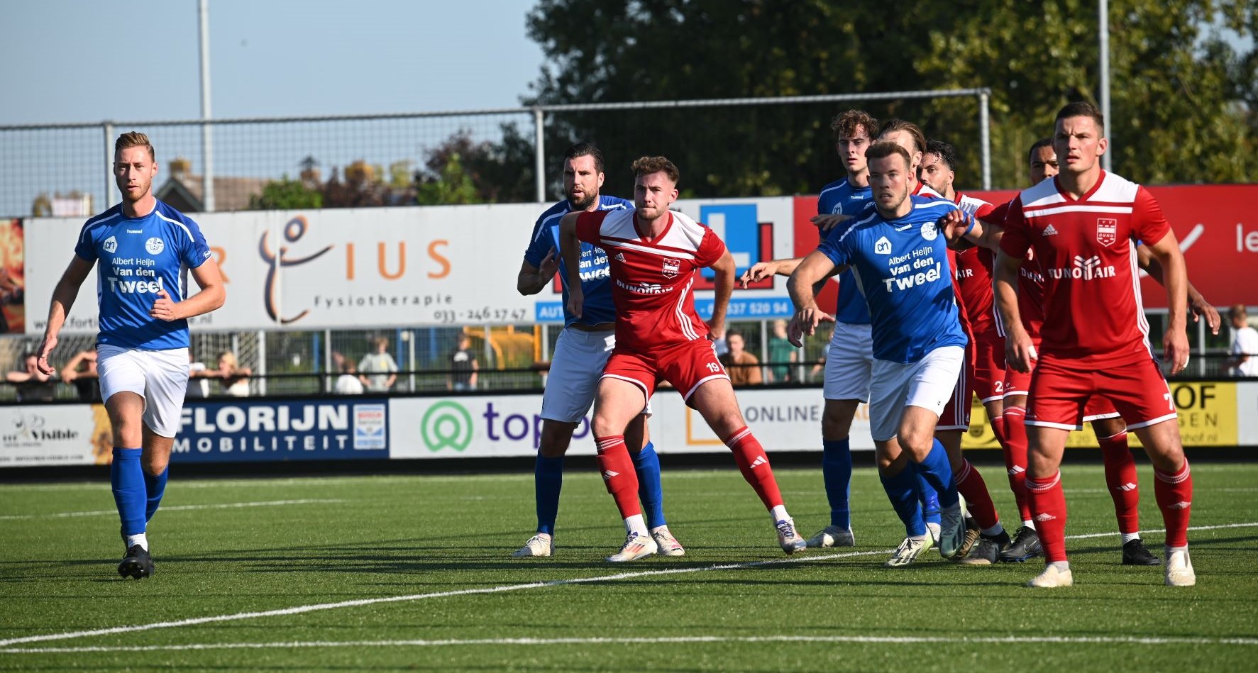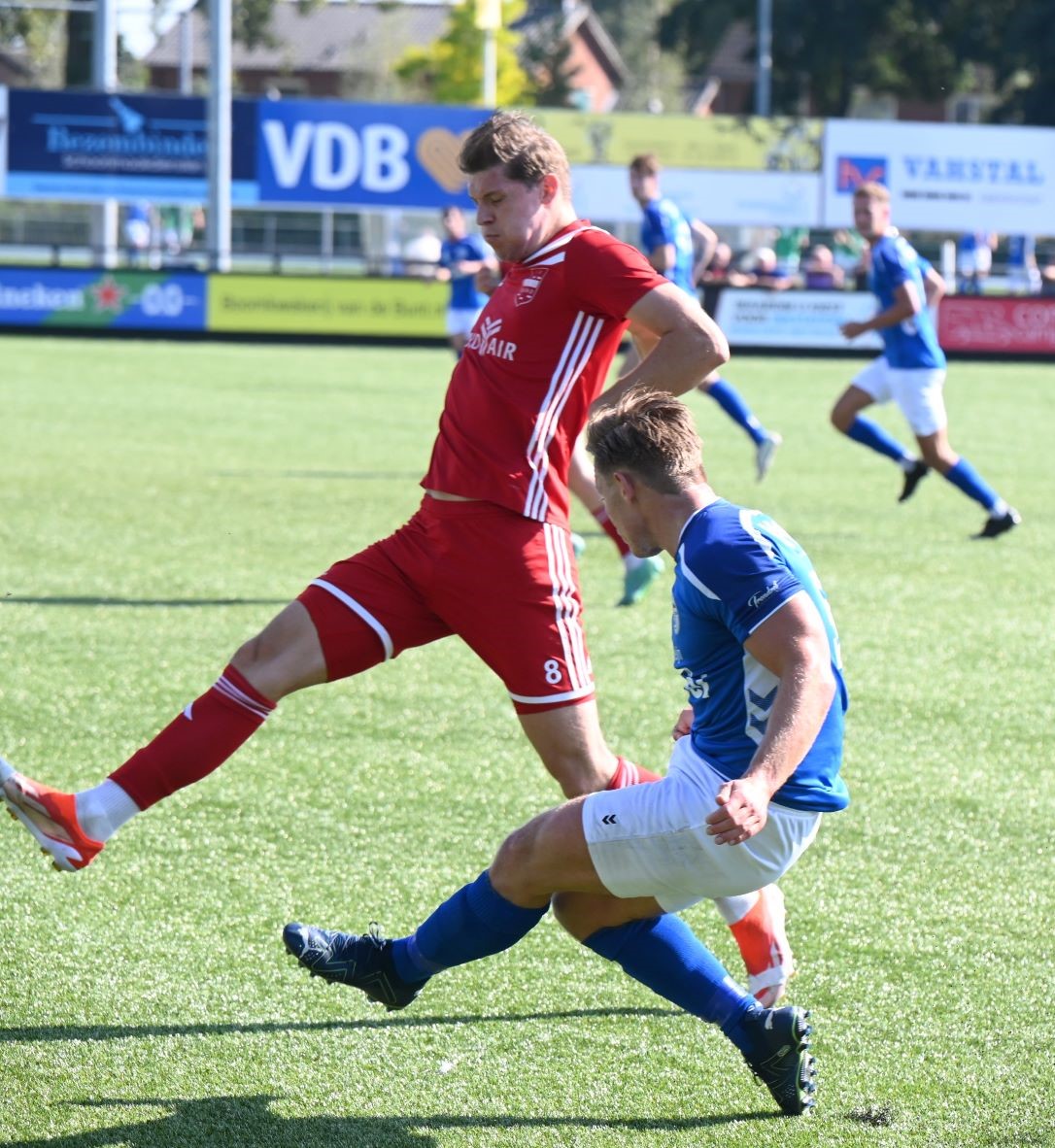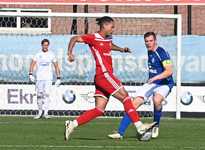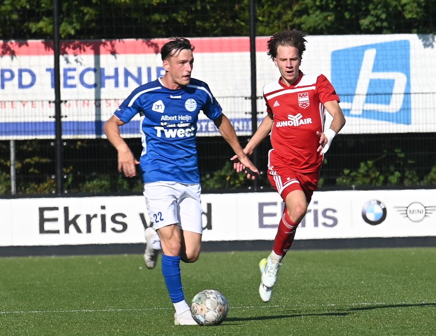 Veensche boys kan zich een betere rentree in de eerste klasse wensen dan in het eerste competitieduel tegen Duno Doorwerth. Op het eigen complex aan de Nieuwe Kerkstraat verloor Veensche Boys met 0-2. Het was te merken dat de kampioen uit de tweede klasse het moest stellen zonder Tom van Donselaar, wiens dubbelgeklapte enkel uit de bekerwedstrijd tegen NSC was gaan opspelen. Daardoor leek Veensche Boys een flinke veer te moeten laten in de eerste helft. Er waren kansen voor CornĂ© Parol en Jurre van den Brom maar die verdwenen in de vergetelheid. Veensche Boys claimde nog minstens twee penalty’s maar de arbiter van dienst wilde hiervan niets weten. De tegenstander weerde zich sterk, combineerde goed en was bij tijd en wijle knap gevaarlijk. Gelukkig stond keeper Wessel Bosman zijn mannetje. Hij werd niet voor niets uitgeroepen tot Man van de Wedstrijd. Toch kon hij in de tweede minuut van de tweede helft niet voorkomen dat Duno alsnog wist te scoren. Met een boogje werkte Bart Schiks de bal in het net. Het duurde tot ongeveer halverwege de tweede helft dat de wedstrijd kantelde. Dat was direct na het inbrengen van Levi Haringsma en Steven van Zanten, waardoor er veel meer temperament in het spel kwam. Ternauwernood wist Duno aan een gelijkmaker te ontsnappen. Doordat Veensche Boys alles op alles zette om de 1-1 op het scorebord te zetten, werd achterin ruimte weggegeven en even voor blessuretijd werd alsnog de 0-2 op het scorebord gezet via Cengizhan Genc. Foto Kees van den Heuvel