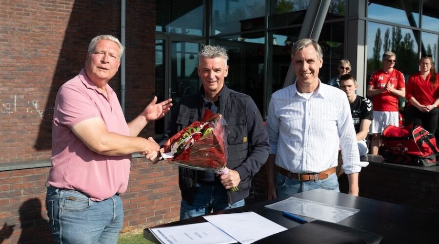 Vanaf 1 juli zal een nieuwe kledinglijn zijn intrede doen bij KV Telstar: leverancier Rijnders Sport, Jan van Schaffelaarstraat 56 uit Barneveld. Afgelopen zaterdag is het contract, in het bijzijn van vele belangstellenden, ondertekend door eigenaar Fred Rijnders, Rob Harmsen en Bas Munter namens Telstar. Het (grotere) aanbod, snelheid, flexibiliteit en secundaire voorwaarden die Rijnders biedt aan KV Telstar hebben het bestuur doen besluiten om met Rijnders Sport in zee te gaan. Naast de nieuwe kledinglijn die langzamerhand na 1 juli zijn intrede gaat doen, zal er ook een reclamebord aan de zijkant van het veld geplaatst worden. Er zal ook nog een pasmoment voor de selectie en een clubweekend komen, datum wordt later bekendgemaakt. Fred Rijnders (m) geflankeerd door Bas Munter (l) en Rob Harmsen (r). Foto: Dennis van Keulen
