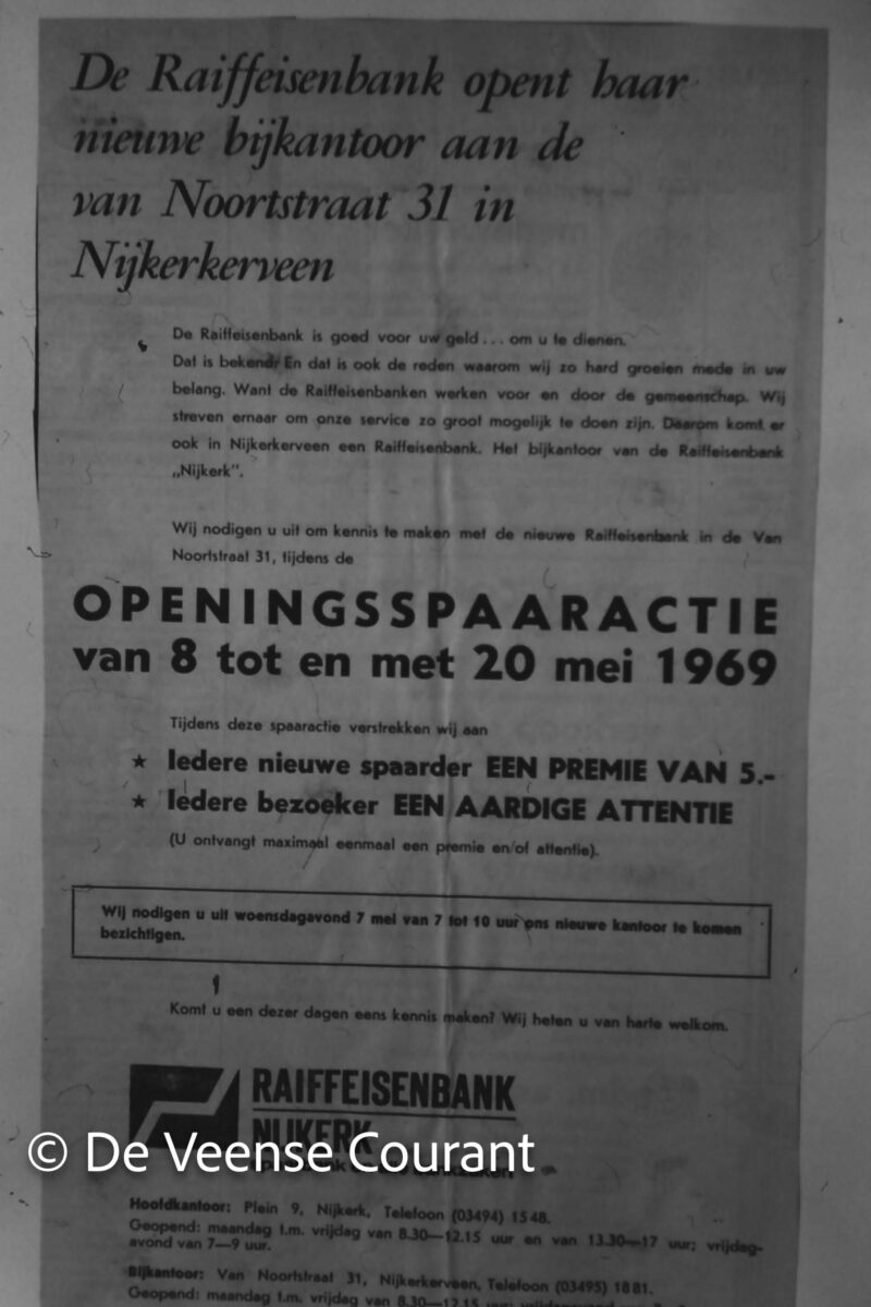 Maar, Nijkerkerveen groeide, de informele zittingen voldeden niet meer en ook de risico’s werden te groot. In mei 1969 kreeg Nijkerkerveen voor het eerst een volwaardig eigen bankgebouw. Dit gebouw werd het symbool van de nieuwe professionaliteit: bewoners konden nu dagelijks terecht voor hun betaalrekeningen, spaarbankboekjes, leningen en alle andere bankzaken. De Raiffeisenbank opende, in die tijd nog voor halve dagen, de deuren aan de Van Noortstraat onder leiding van beheerder Peter Bijker. Met de opening van een eigen kantoor werd de bank een permanent en professioneler onderdeel van het dorpsbeeld, maar de sfeer bleef informeel. Het kantoor markeerde een belangrijke stap in de ontwikkeling van het dorp en de bank, van een informele, agrarische coöperatie naar een modernere financiële instelling. De uitbreiding was hard nodig; klanten wilden hun bank in de directe nabijheid en de servicebehoefte groeide. De gemeente Nijkerk telde toen 17.319 inwoners. Leuk detail: de Nijkerkse Courant noemde Nijkerkerveen dat jaar een “verlichte” stad. Dit had echter niets met religie te maken, maar met de gloednieuwe straatverlichting die destijds werd aangelegd.