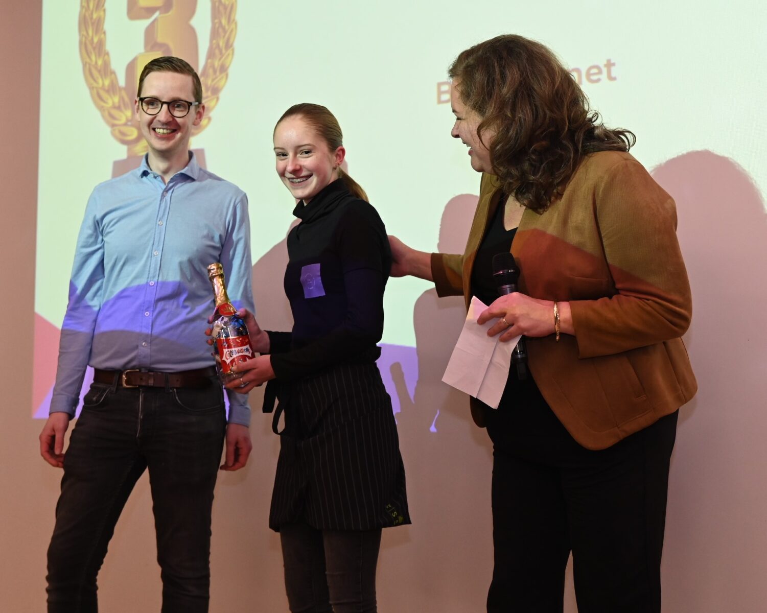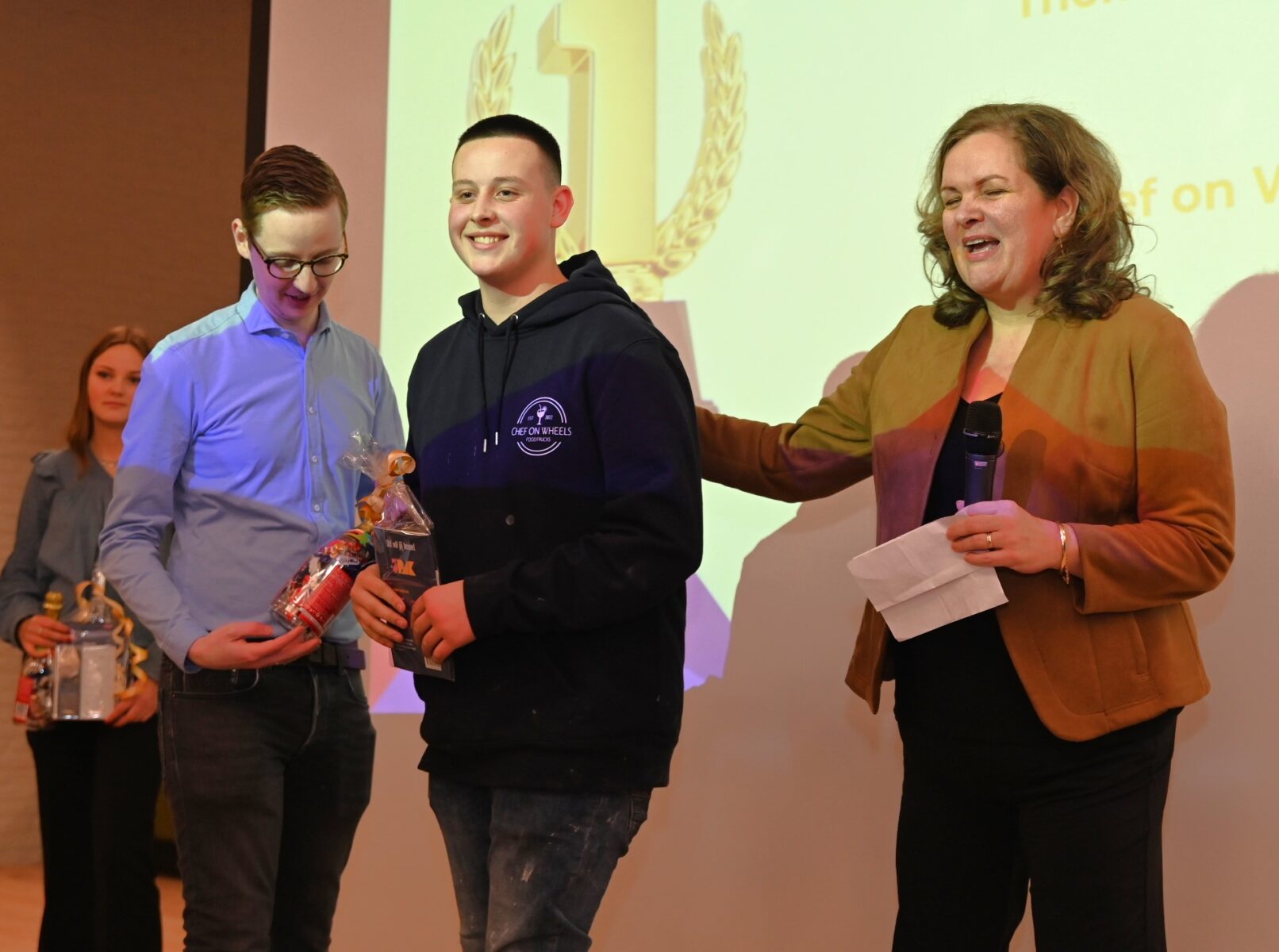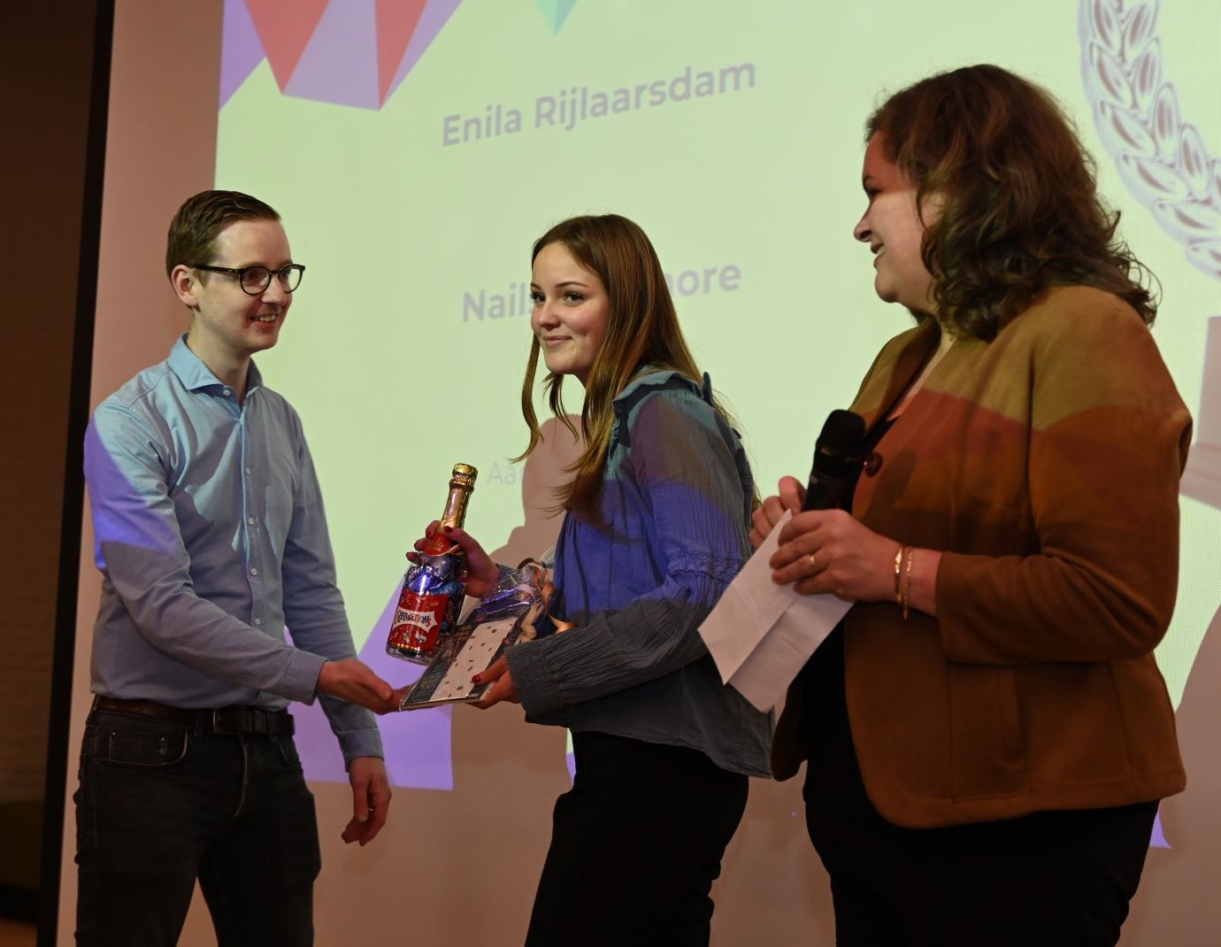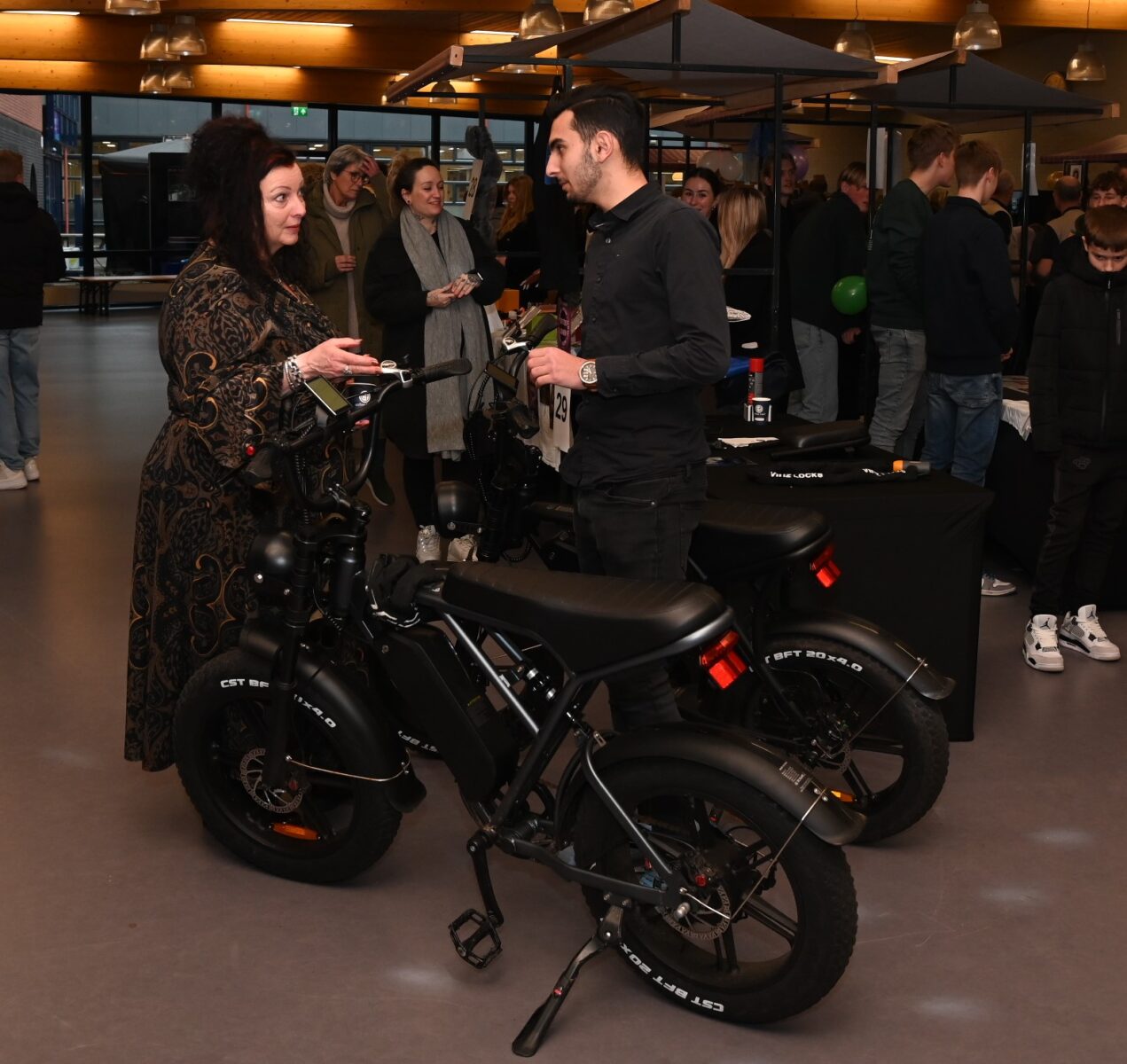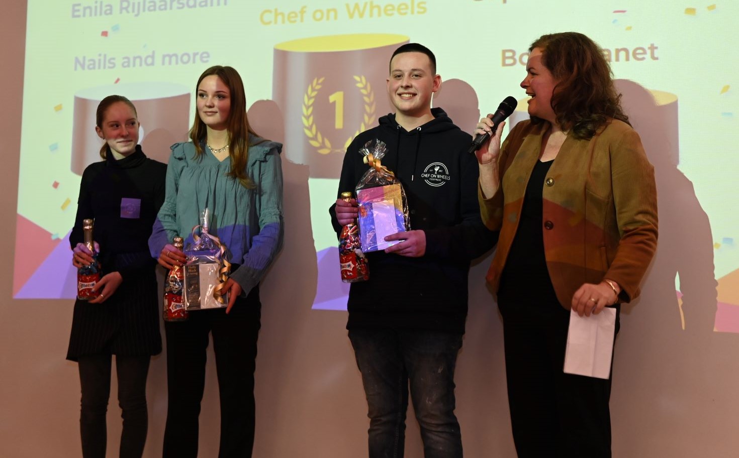 Thom Binnendijk (17) van het Corlaer College is woensdagavond 31 januari uitgeroepen tot beste jonge ondernemer van Nijkerk. Hij presenteerde samen met veel andere Vmbo-leerlingen van het Corlaer College (leerrichting Economie en Ondernemen) een eigen bedrijf en kwam als winnaar uit de bus. Dat deed hij met een eigen poffertjesbedrijf. Al sinds zijn veertiende staat hij achter een poffertjeskraam. Zijn eerste klus was in Maastricht en sindsdien staat de trein niet stil. De complete poffertjeskraam was naast de school gezet. Eerder wilden ze de kraam binnenzetten, maar toen ging in de school het alarm af en het wilde lange tijd ook maar niet meer stil worden. De eerste prijs werd uitgereikt door wethouder Esther Heutink. Nummer 2 werd Enila Rijlaarsdam met Nails and More en derde eindigde Sophia Blankestijn met Boba Planet. Bij het keuzevak Ondernemen hebben de vierdejaarsleerlingen van het profiel Economie en ondernemen geleerd hoe je een eigen onderneming kunt opzetten. Omdat je in de praktijk pas echt leert, hebben de leerlingen de theorie gelijk toegepast in de praktijk. Zij hebben vol enthousiasme gewerkt aan hun eigen fictieve bedrijf. De leerlingen hebben dezelfde stappen gezet als een ‘echte’ ondernemer. Een product kiezen, een ondernemingsplan schrijven, de doelgroepen omschrijven, de verkoopprijs bepalen, nadenken over inkoop en verkoop, marketing en promotie. De leerlingen hebben niet stilgezeten. Tijdens de bedrijvenmarkt presenteerden de leerlingen vol trots hun bedrijf aan hun familie en vrienden. Met muntjes kon het beste bedrijf worden gekozen. Wie de meeste muntjes had, was de winnaar. De beoordeling van de ondernemer 2023/2024 maakt deel uit van het uiteindelijke eindcijfer van de examen. Foto Kees van den Heuvel