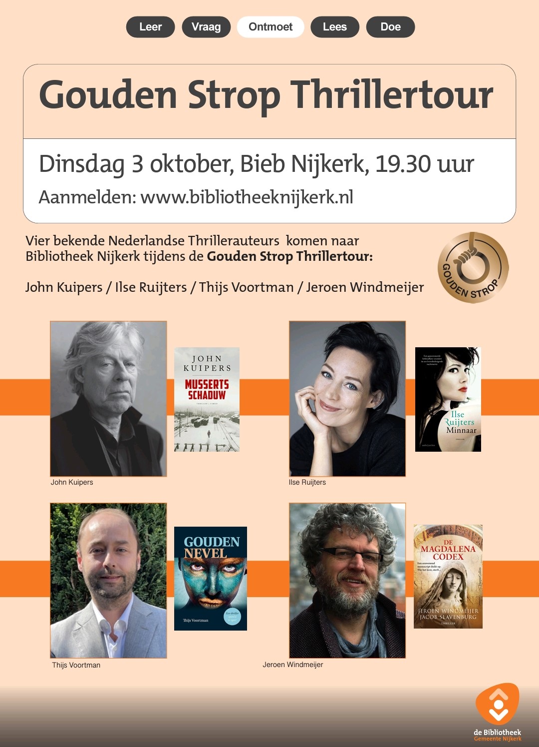 Op 3 oktober wordt een thrilleravond georganiseerd in de Nijkerkse Bibliotheek. Tijdens deze avond worden gesprekken gevoerd met vier Nederlandse thrillerschrijvers, die allen genomineerd zijn en/of een bekende thrillerprijs gewonnen hebben. Bibliotheekcollega Jamie Lee van Londen gaat met de auteurs in gesprek. Naast dat het inhoudelijk over hun boeken gaat, komen diverse onderwerpen aanbod en tipje van de sluier: